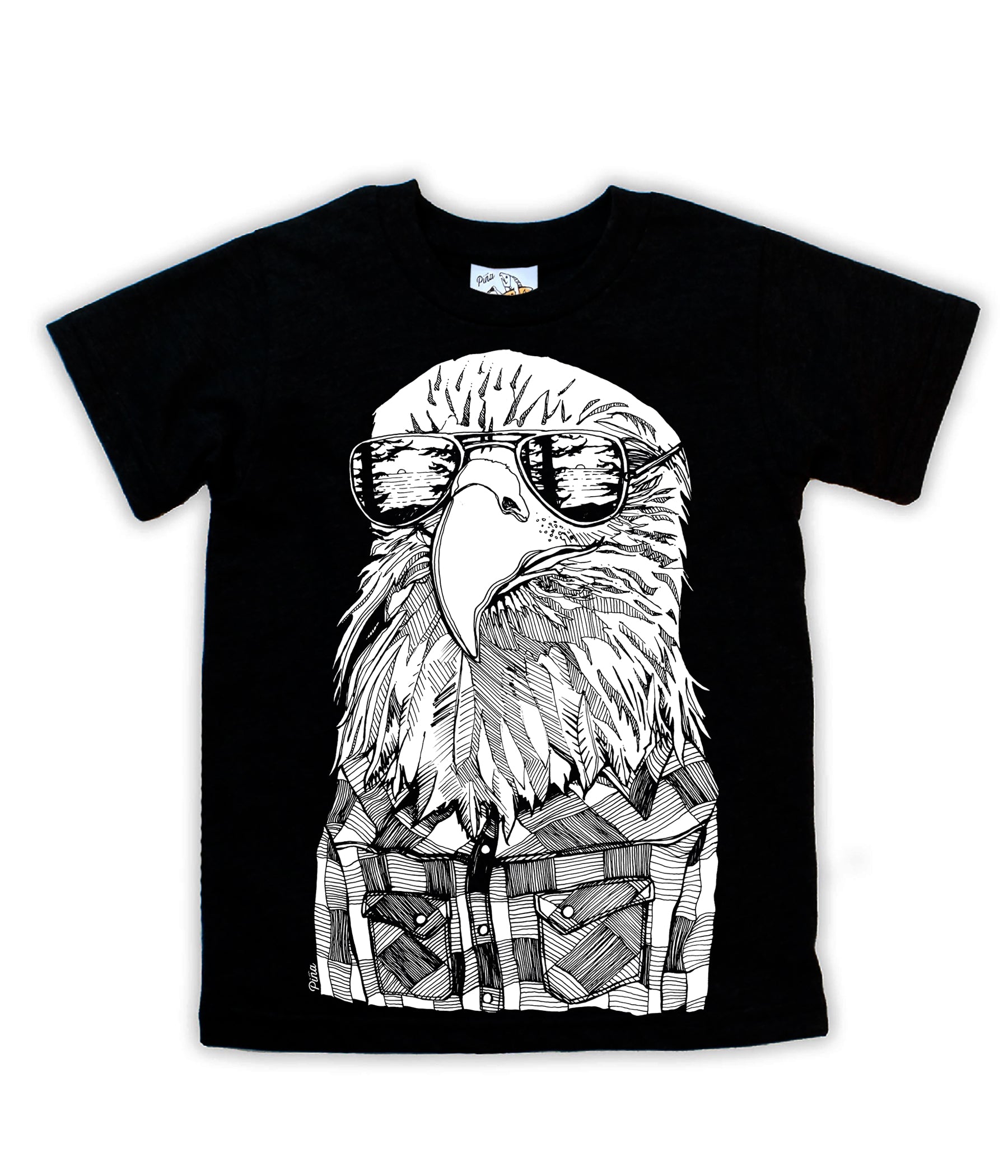A soft and comfortable kids tee printed with our good times Hipster Eagle design. This king predator takes a moment to chill out and take in the view as the sun sets over the great Pacific. The tree silhouettes reflected in his shades give us a glimpse of the rugged coast where he resides. He wears a classic flannel to stay warm yet cool in the Pacific North West.