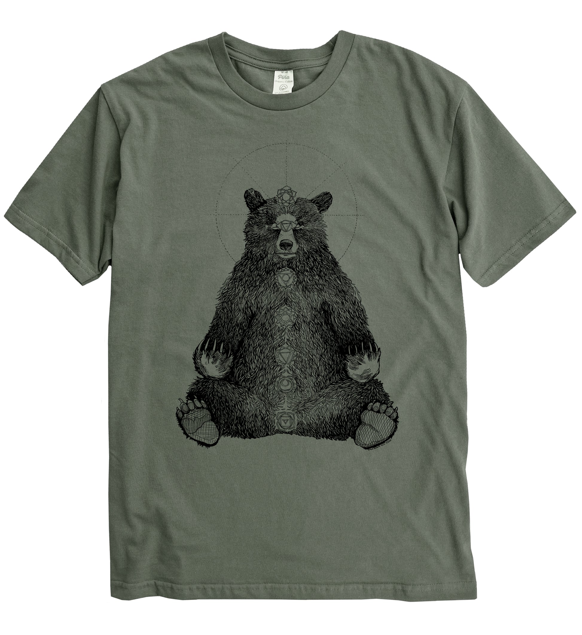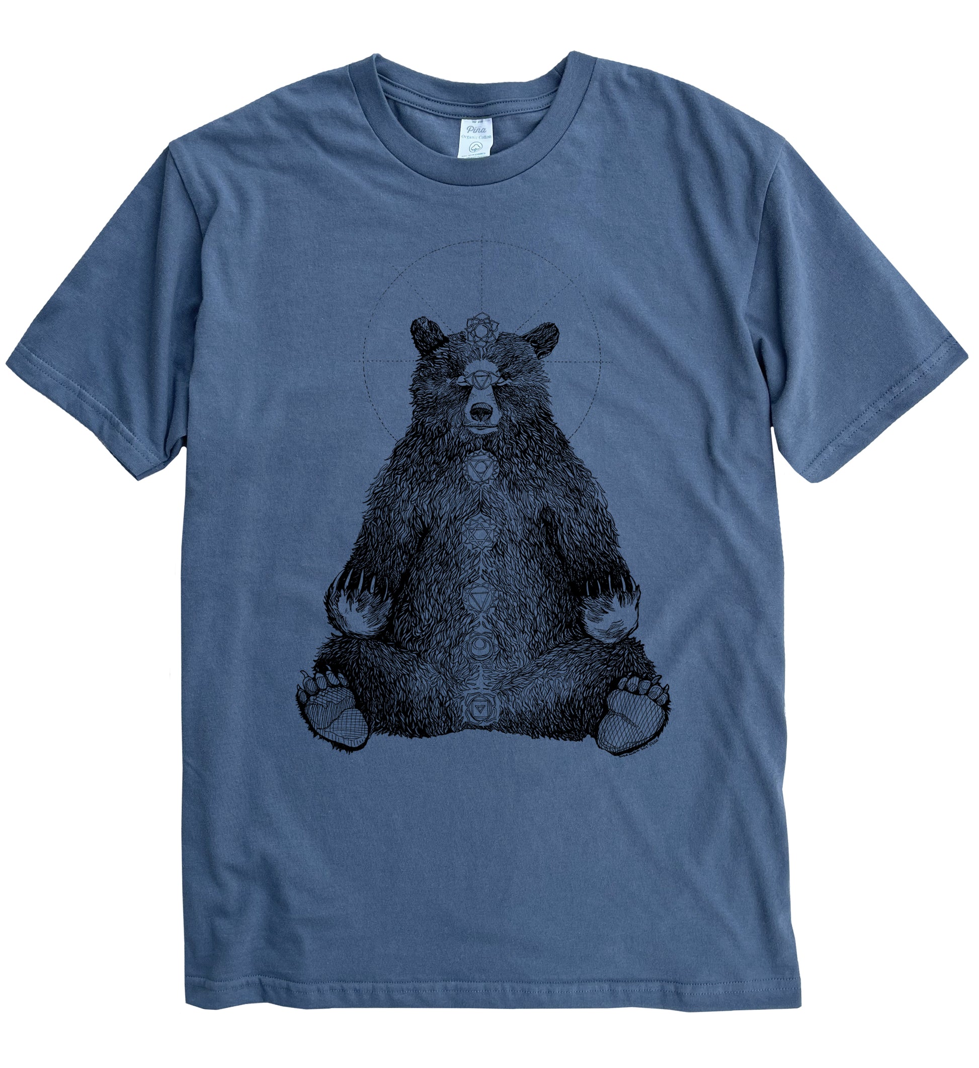 Our Kundalini Bear design printed in black ink on the front of a 100% organic cotton unisex tee. This crewneck t-shirt is soft and comfortable with a flattering fit. Each shirt is made in Canada then custom printed by us in Ucluelet, just for you!