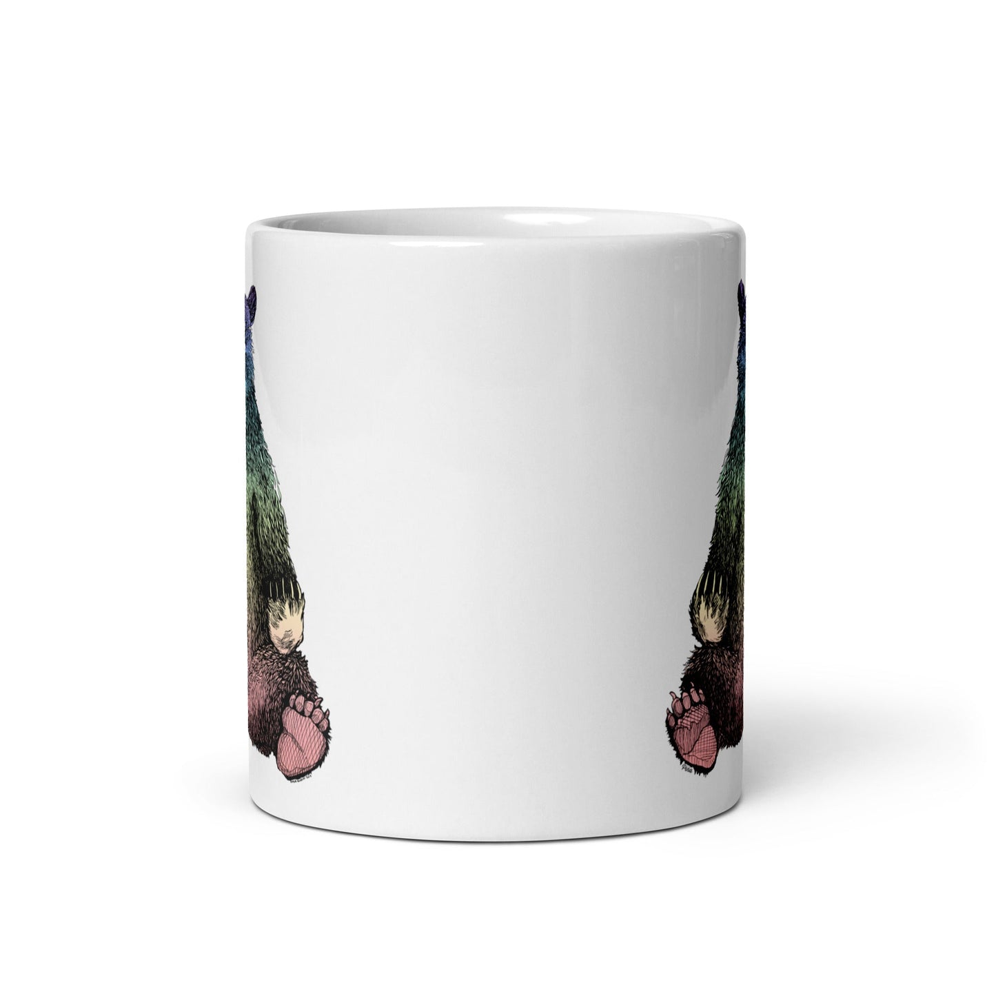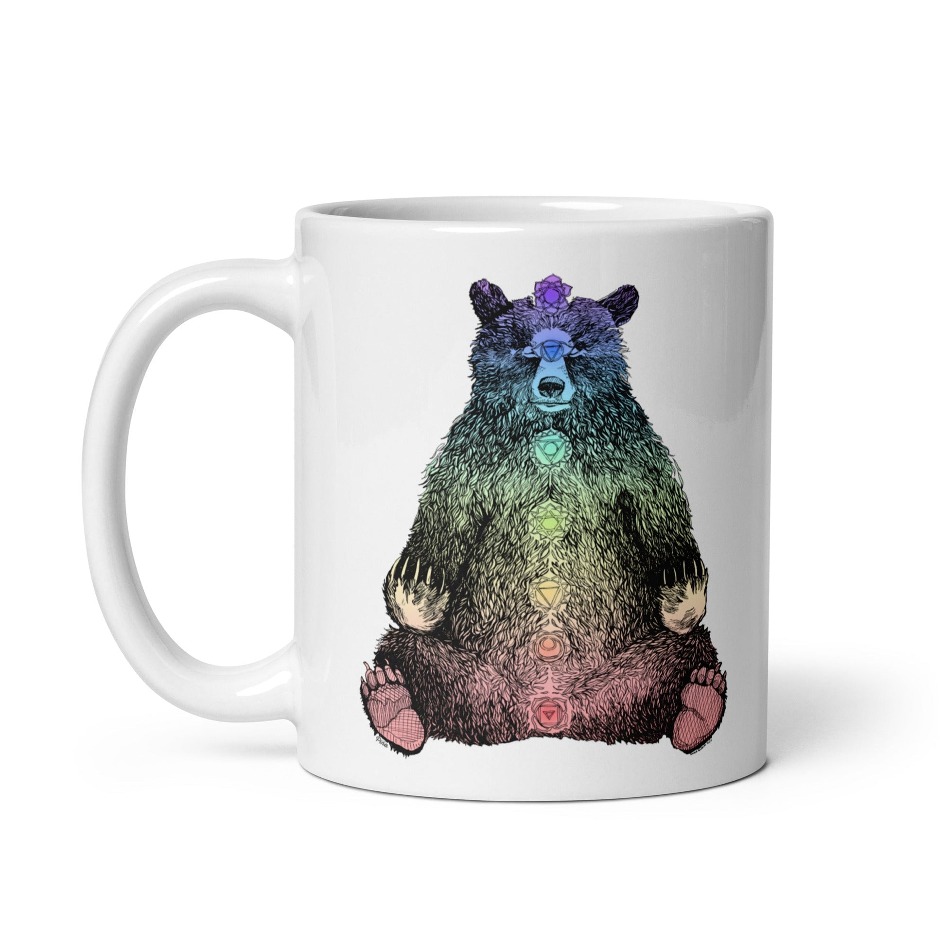 Looking for a fun addition to your caffeinated mornings? This ceramic mug is sure to put a smile on your face! It’s dishwasher-safe and perfect for everyday use. Printed with our detailed Kundalini Bear design, this meditating forest friend sits in bliss as he awakens to his full potential of awareness. Each of the seven chakras is drawn in detail.