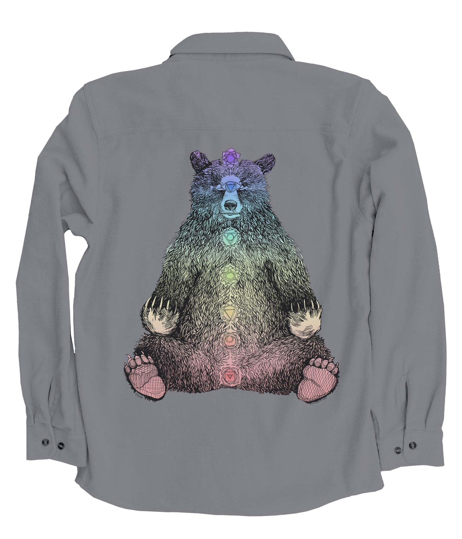 This soft and comfortable unisex flannel is printed with our Kundalini Bear design in full colour on the back. This meditating forest friend sits in bliss as he awakens to his full potential of awareness. Each of the seven chakras is drawn in detail. Summon your inner yogi with this peaceful print.