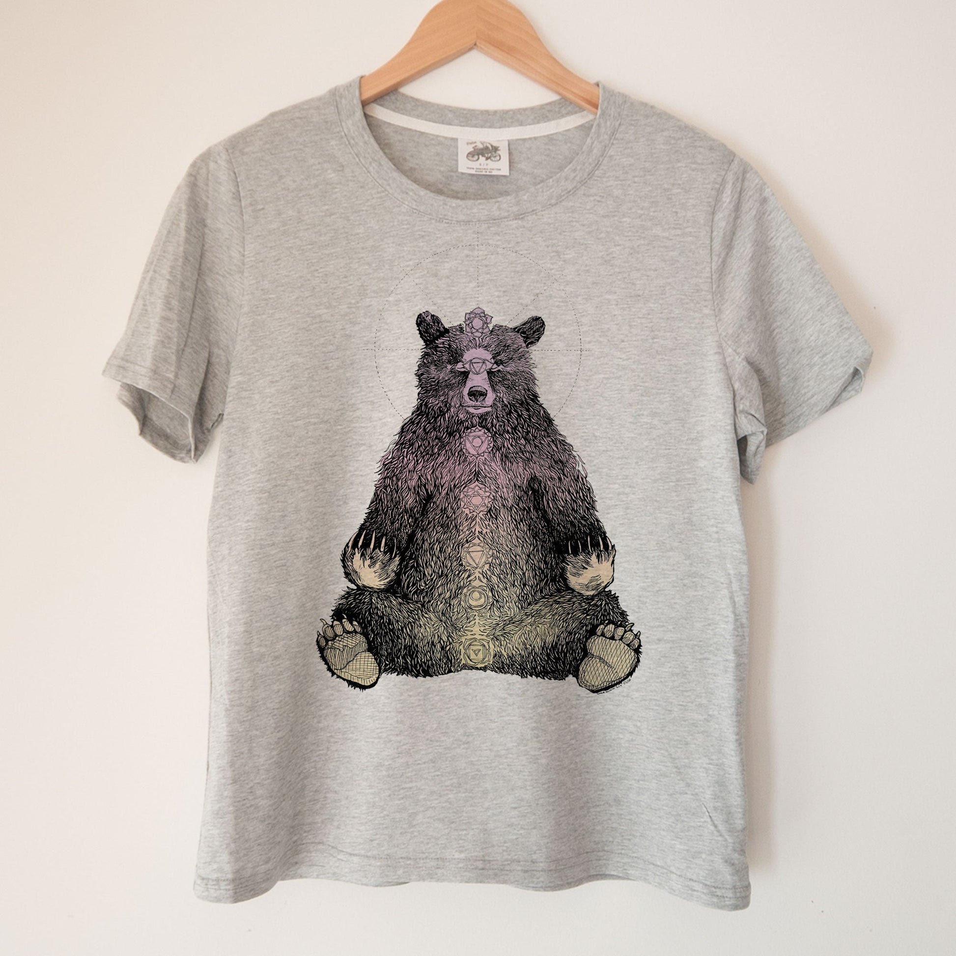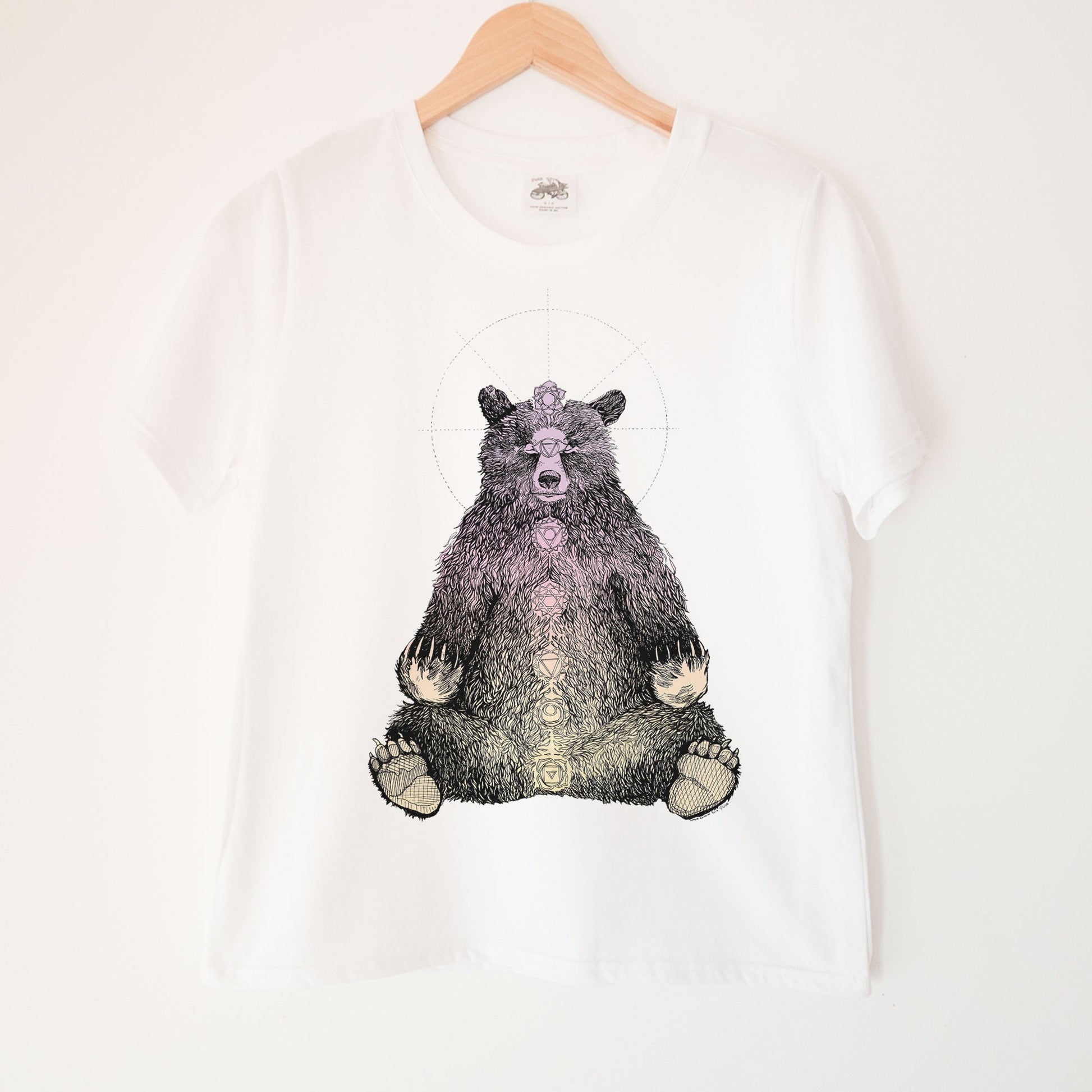 A soft and lightweight ladies boxy tee printed with our detailed Kundalini Bear ink drawing. This meditating forest friend sits in bliss as he awakens to his full potential of awareness. Each of the seven chakras is drawn in detail. Summon your inner yogi with this peaceful print.