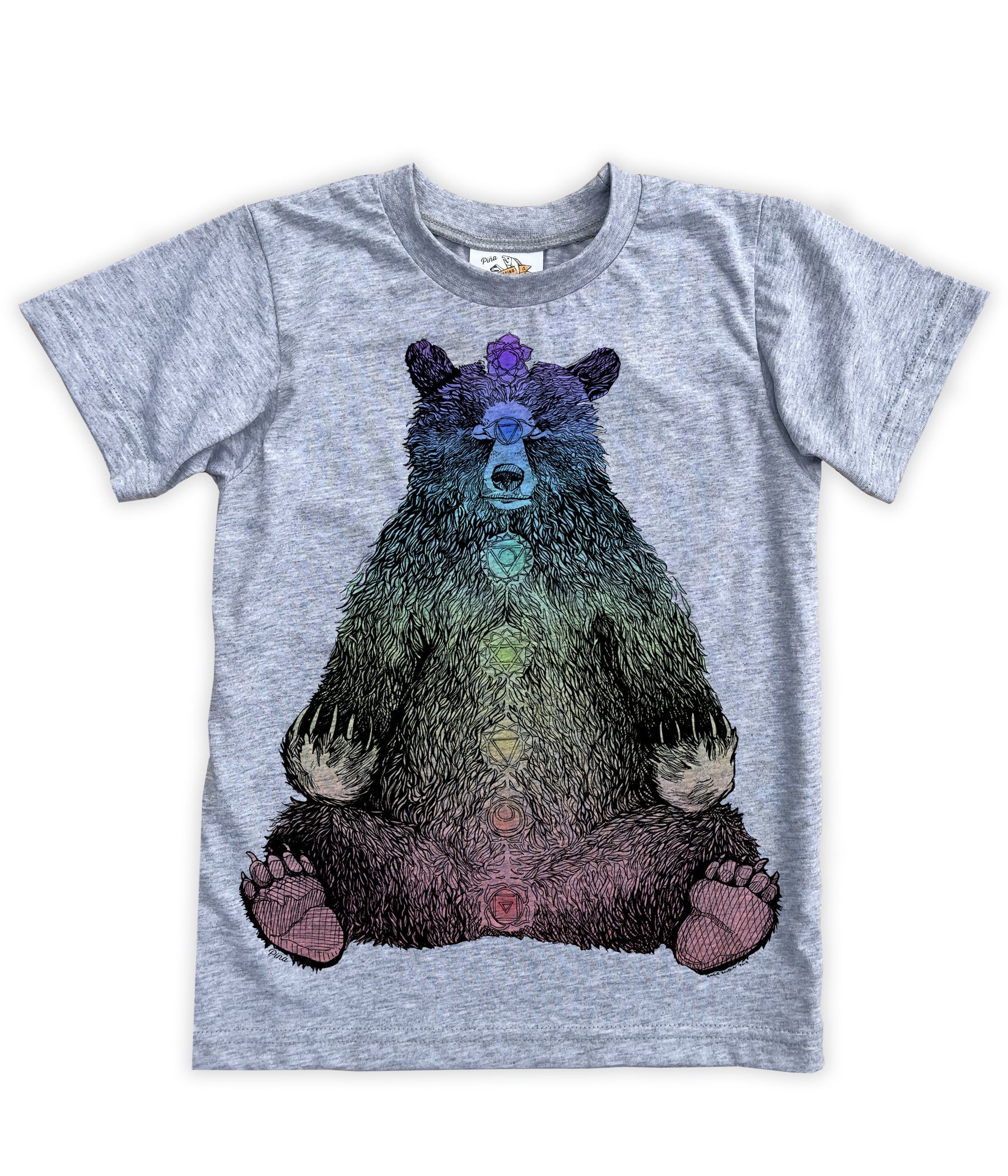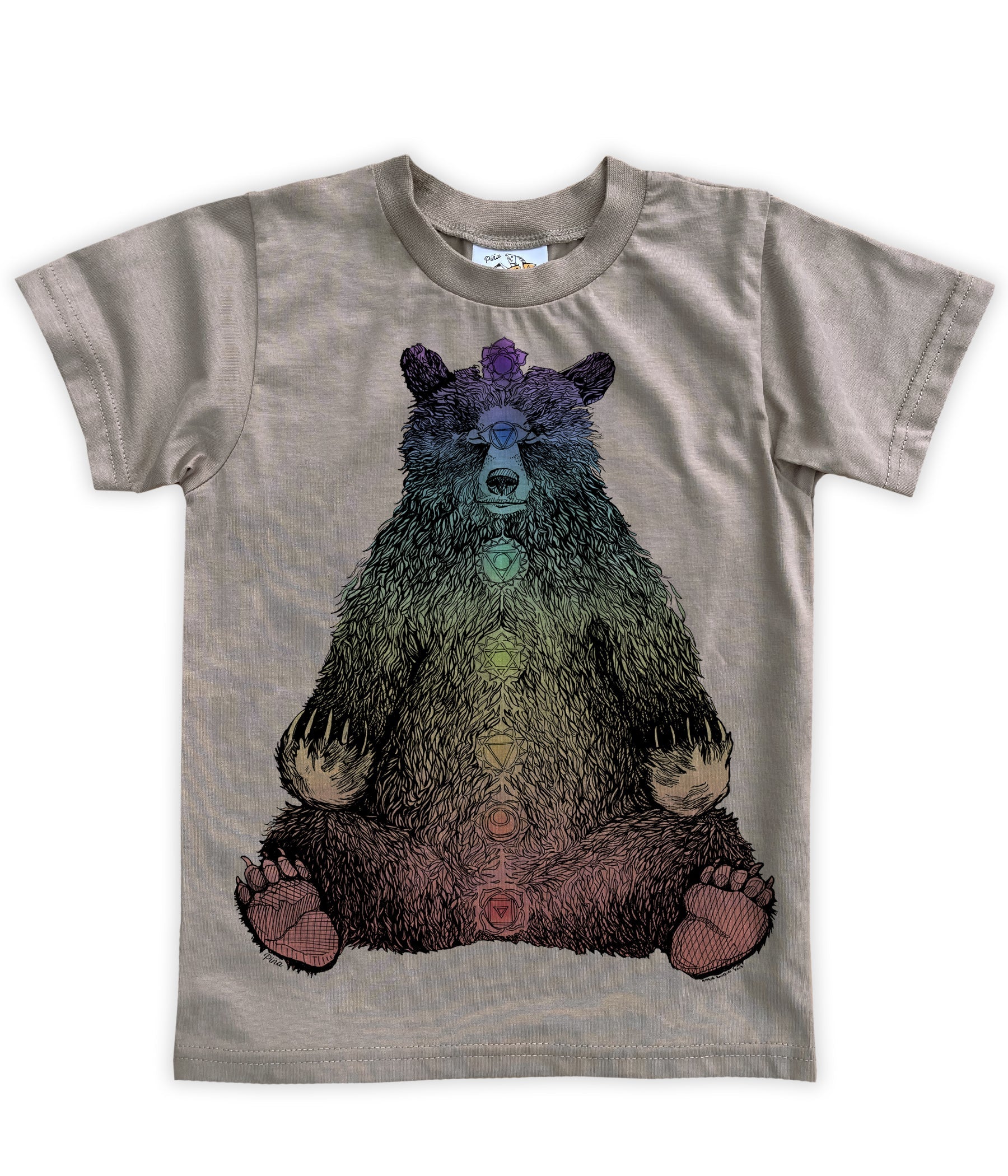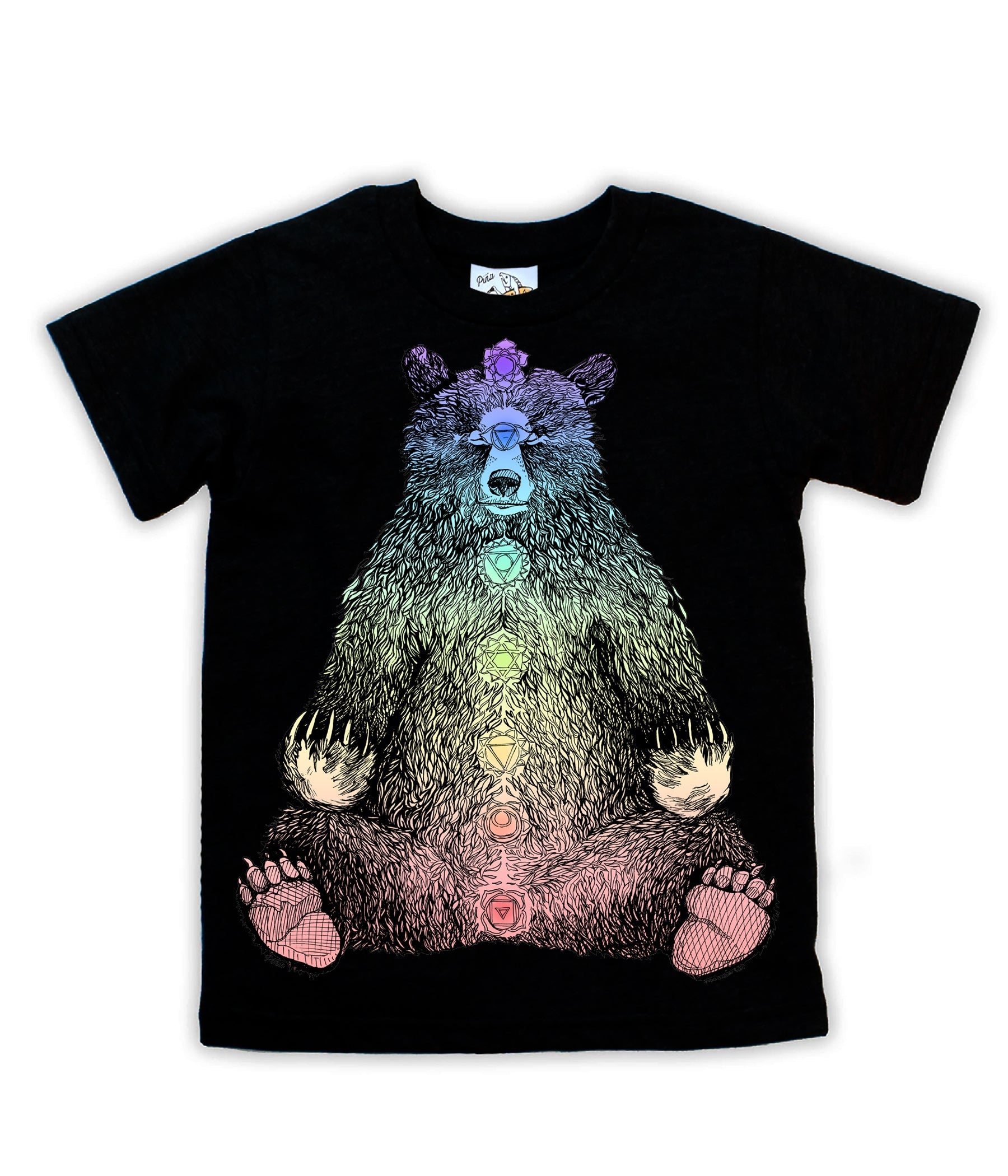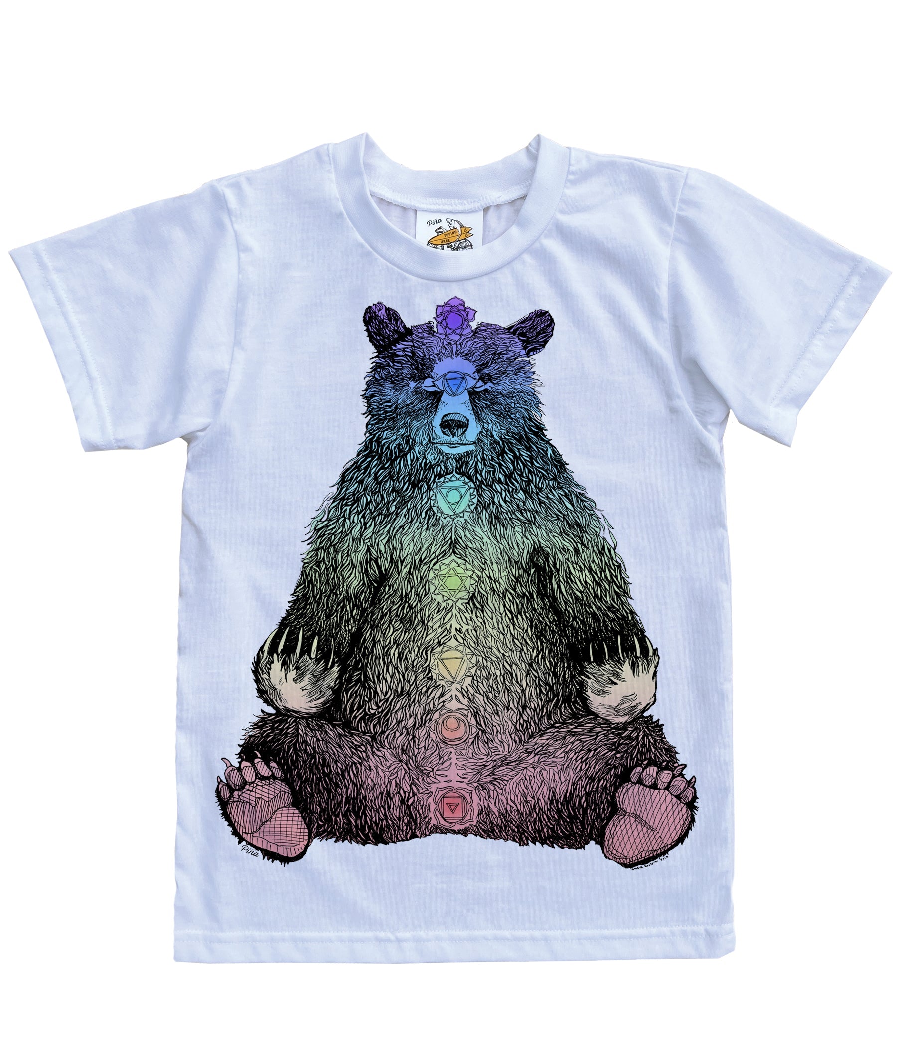 A soft and lightweight kids tee printed with our detailed Kundalini Bear ink drawing. This meditating forest friend sits in bliss as he awakens to his full potential of awareness. Each of the seven chakras is drawn in detail. Summon your inner yogi with this peaceful print.