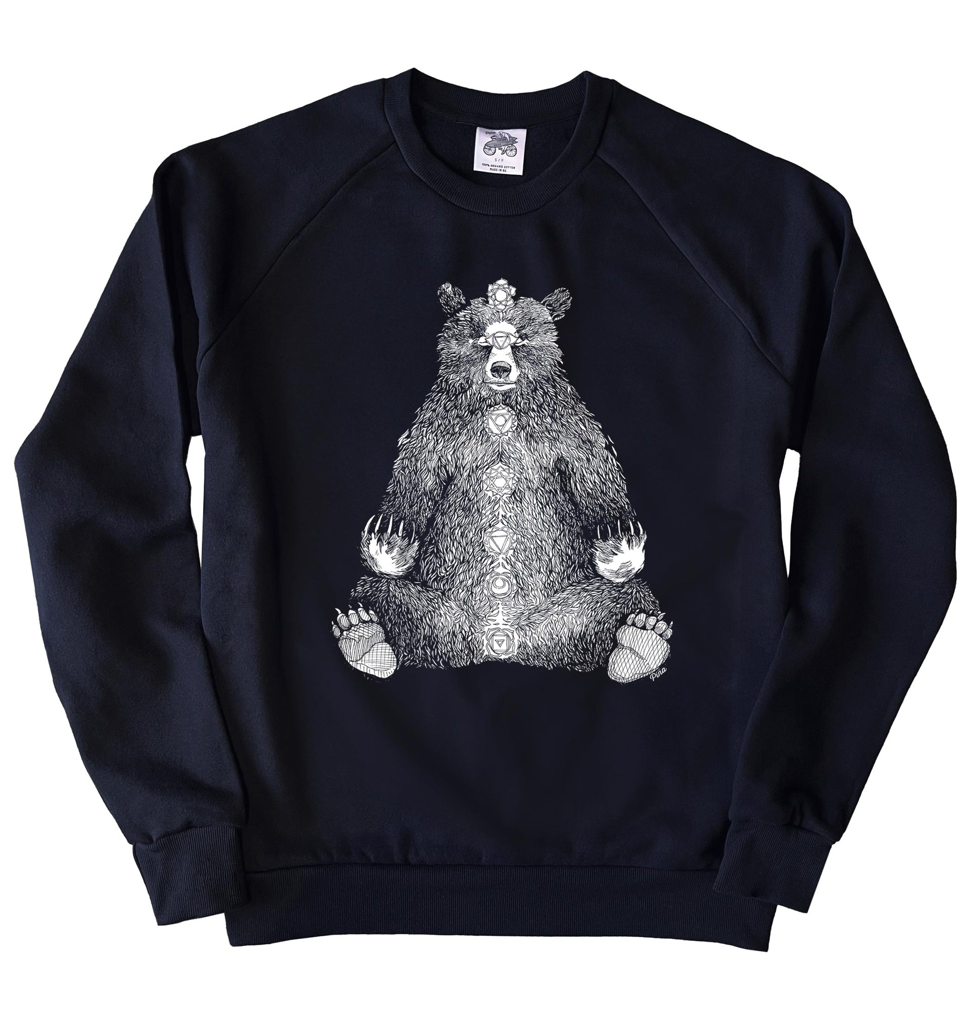 Stay centred with our peaceful Kundalini Bear–printed in white ink on the front of a unisex crewneck sweatshirt.