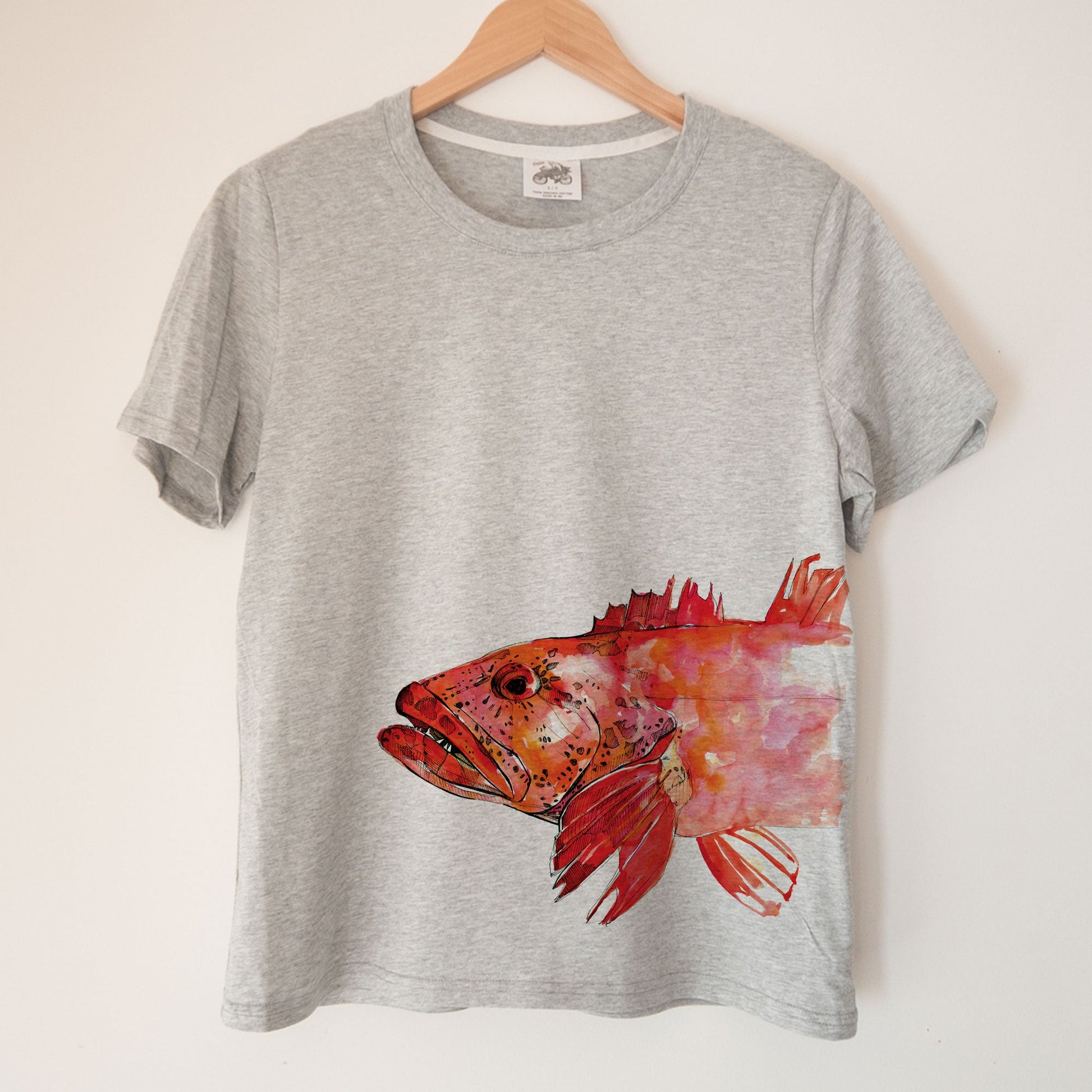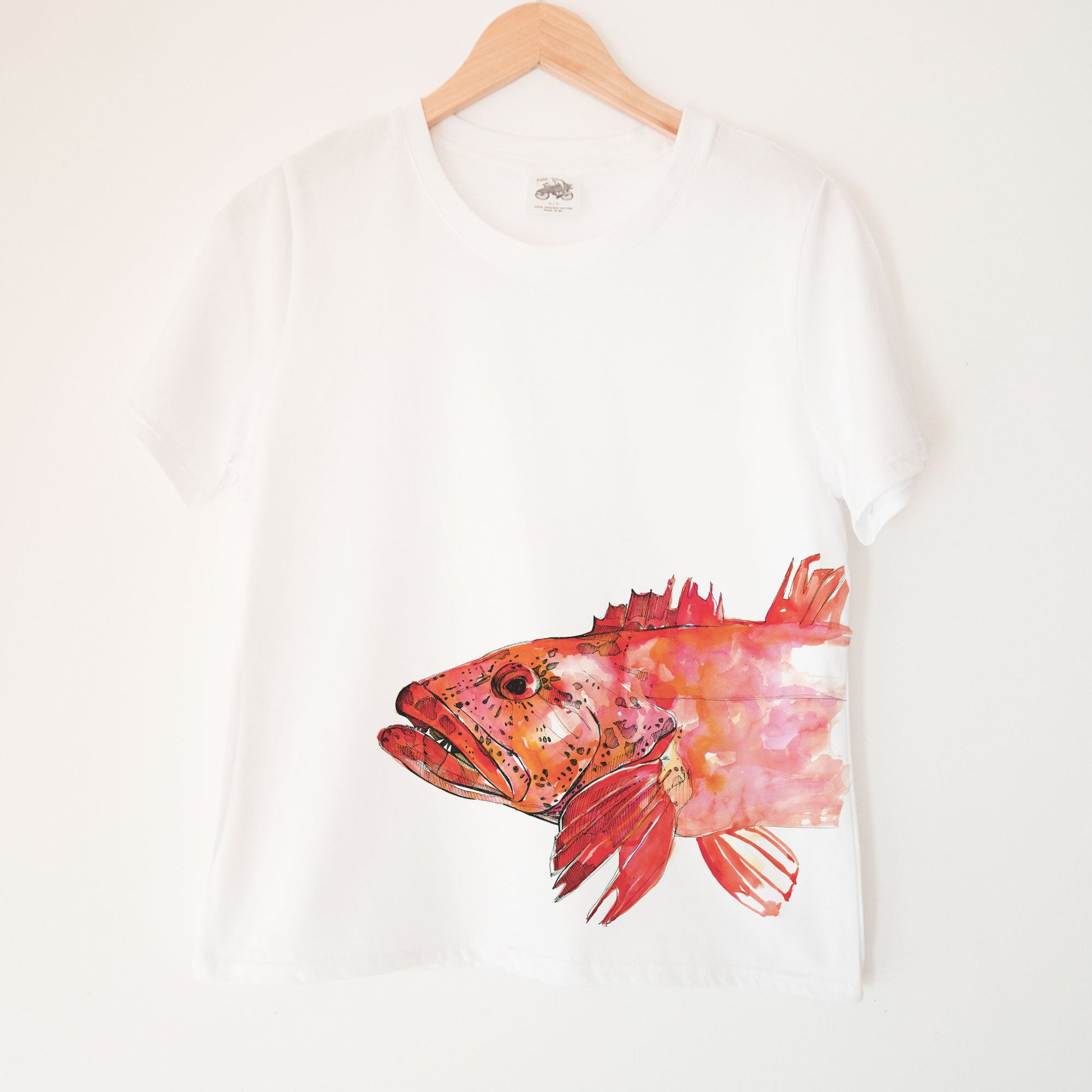 A soft and comfortable organic cotton ladies boxy tee printed with our Lingcod watercolour painting design. How much cod could a cuddly cod cuddle if a cod could cuddle cod?