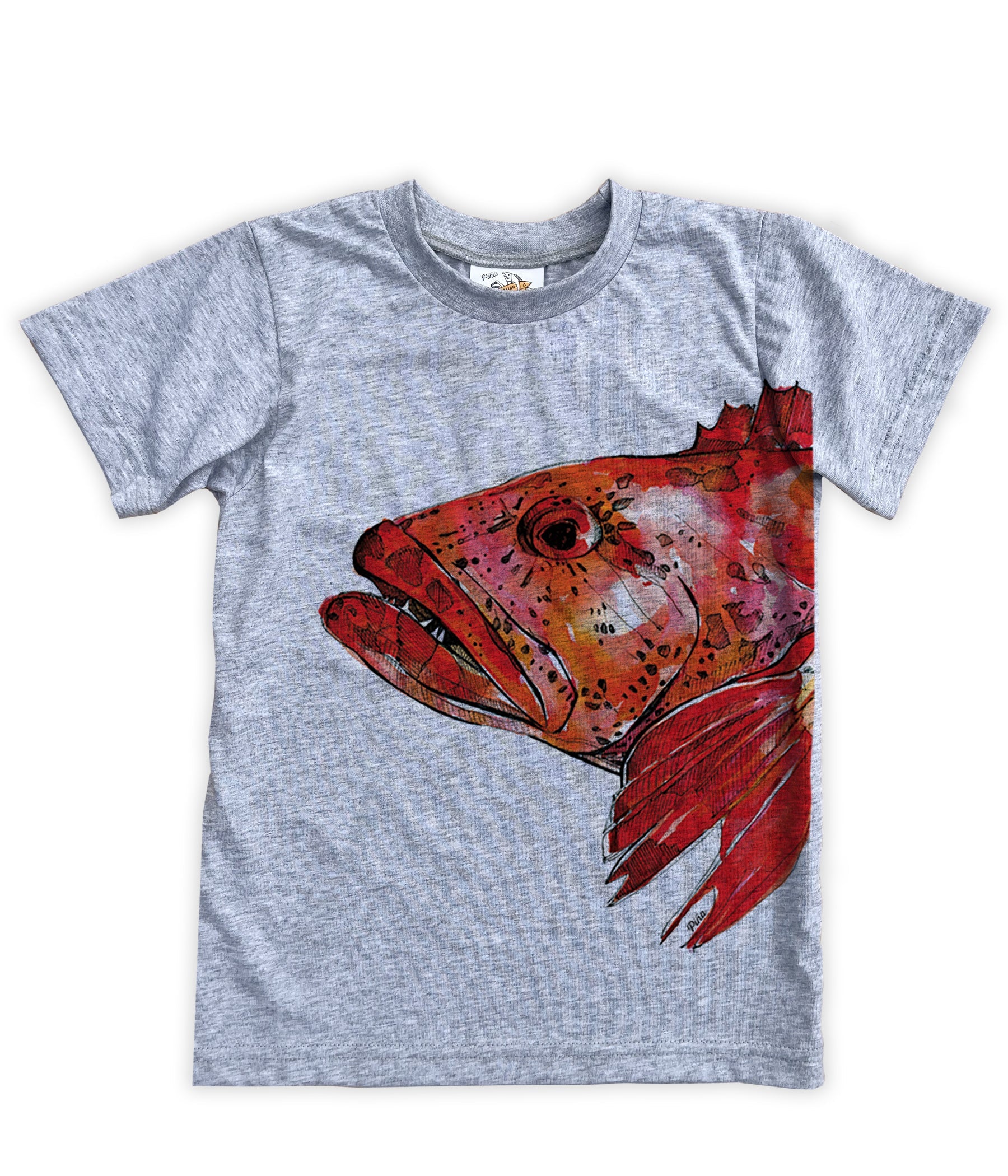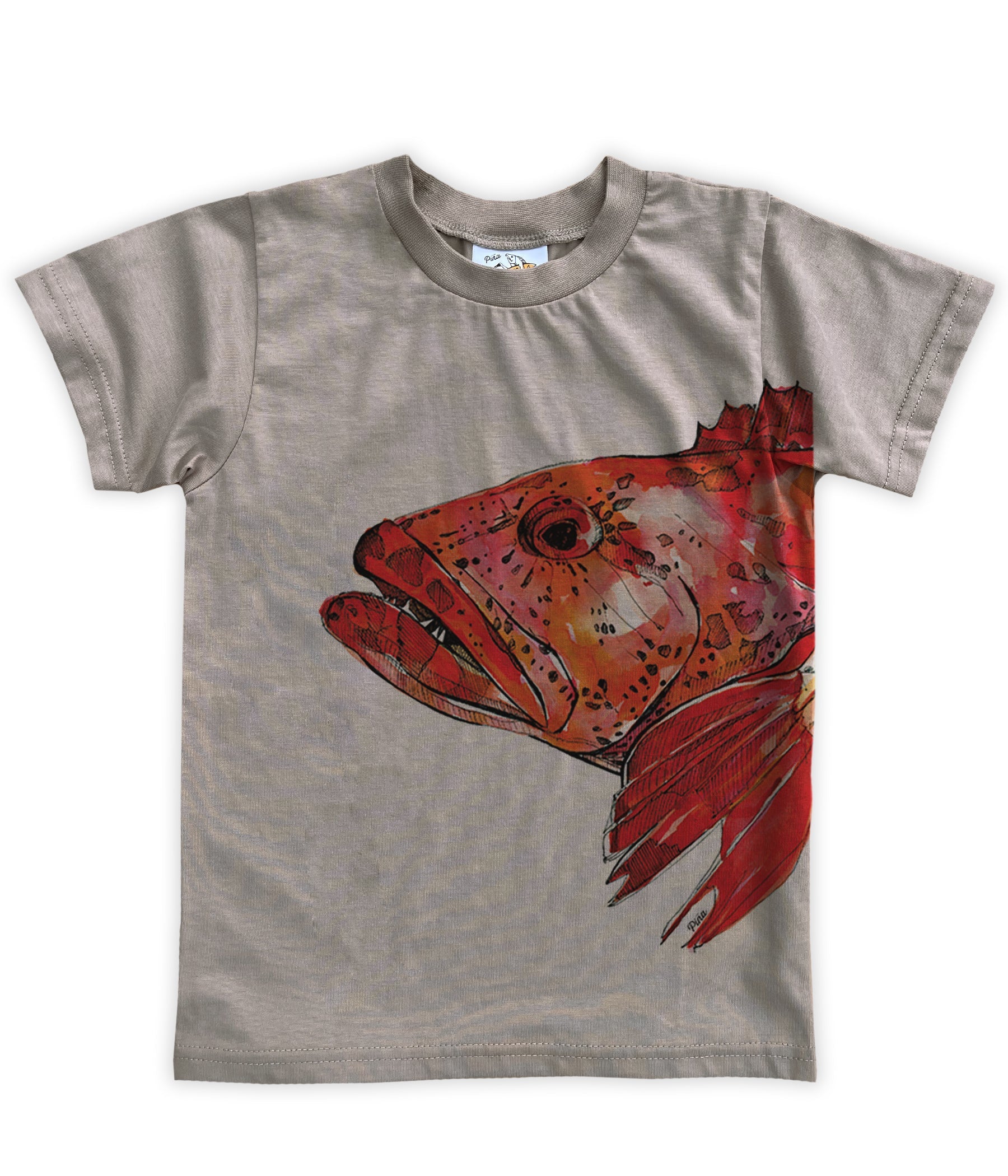 A soft and comfortable kids tee printed with our bold watercolour Lingcod design. This prickly, rock star of the Pacific Northwest lounges leisurely about in the swaying bullkelp just off the rocky coast. Perfect for fish and chips, hence the big scowl!