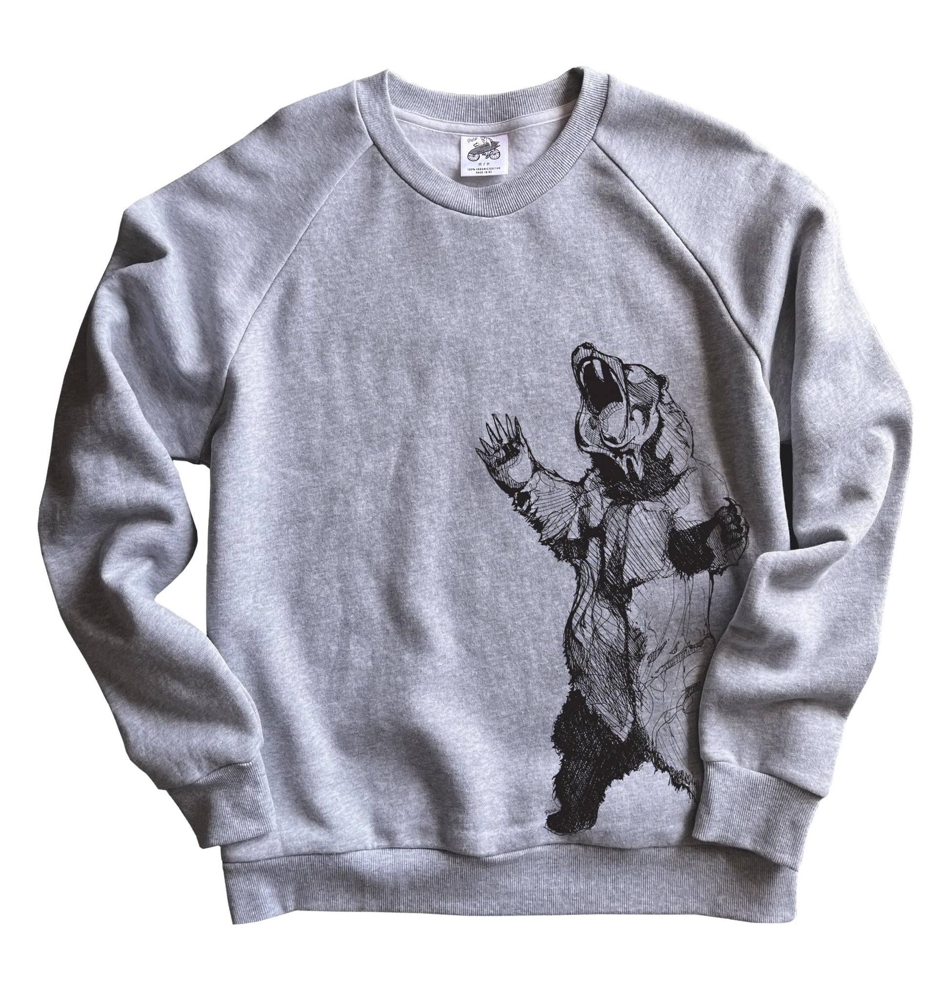 Our detailed Bearhugger design printed in black line on the front, side of our unisex crewneck sweatshirt.