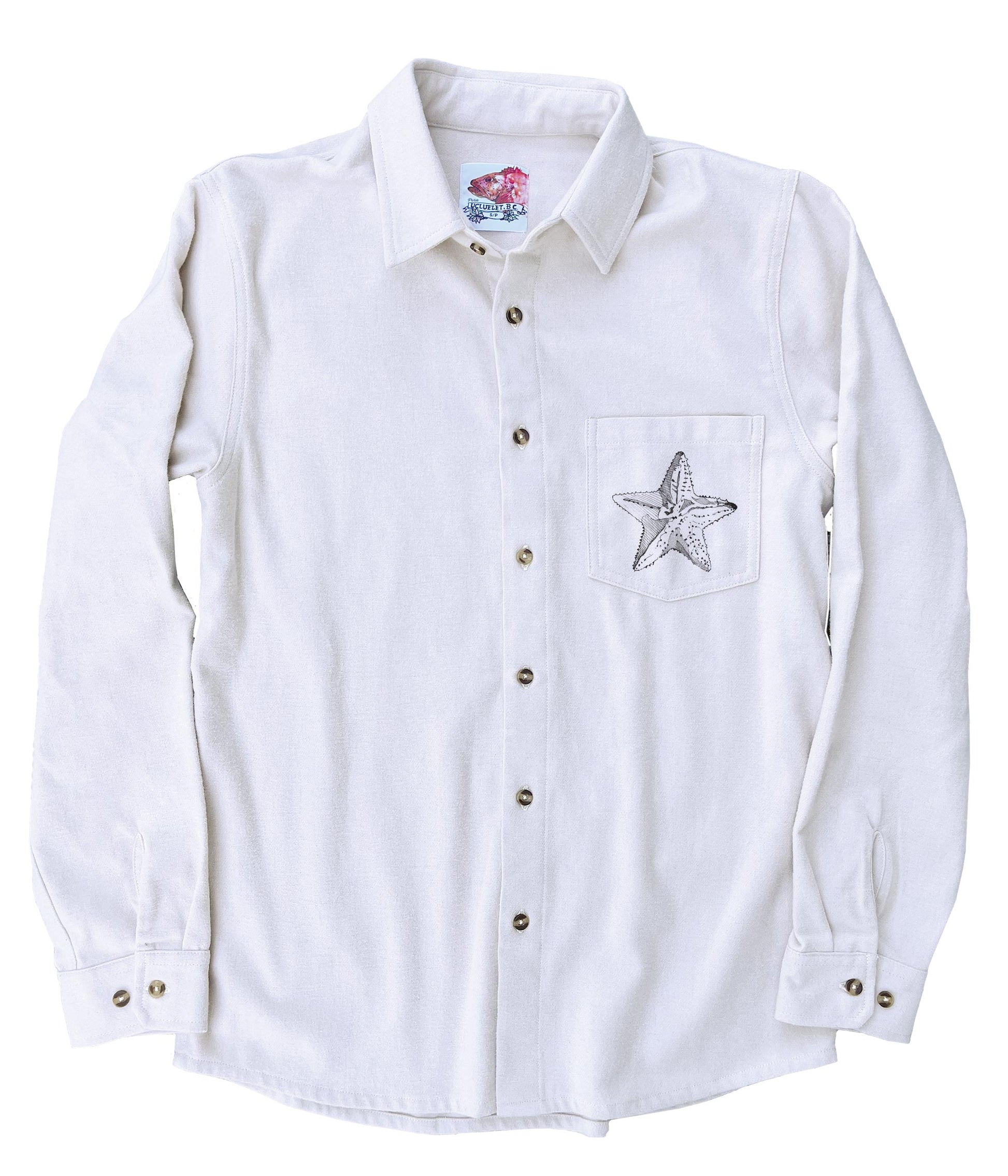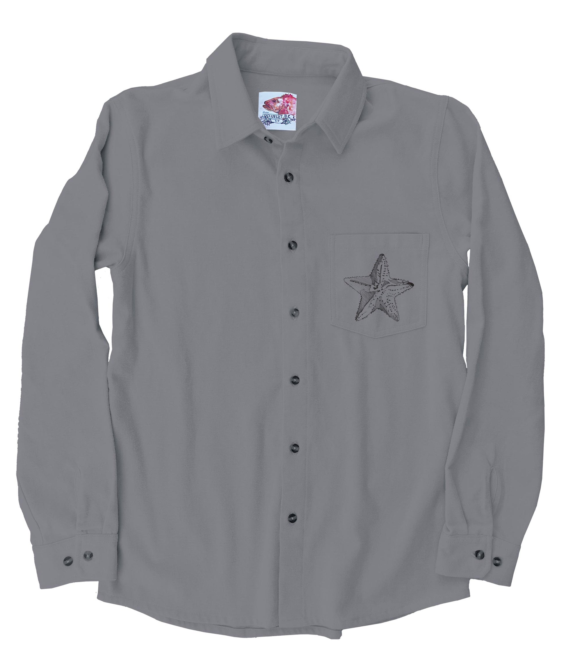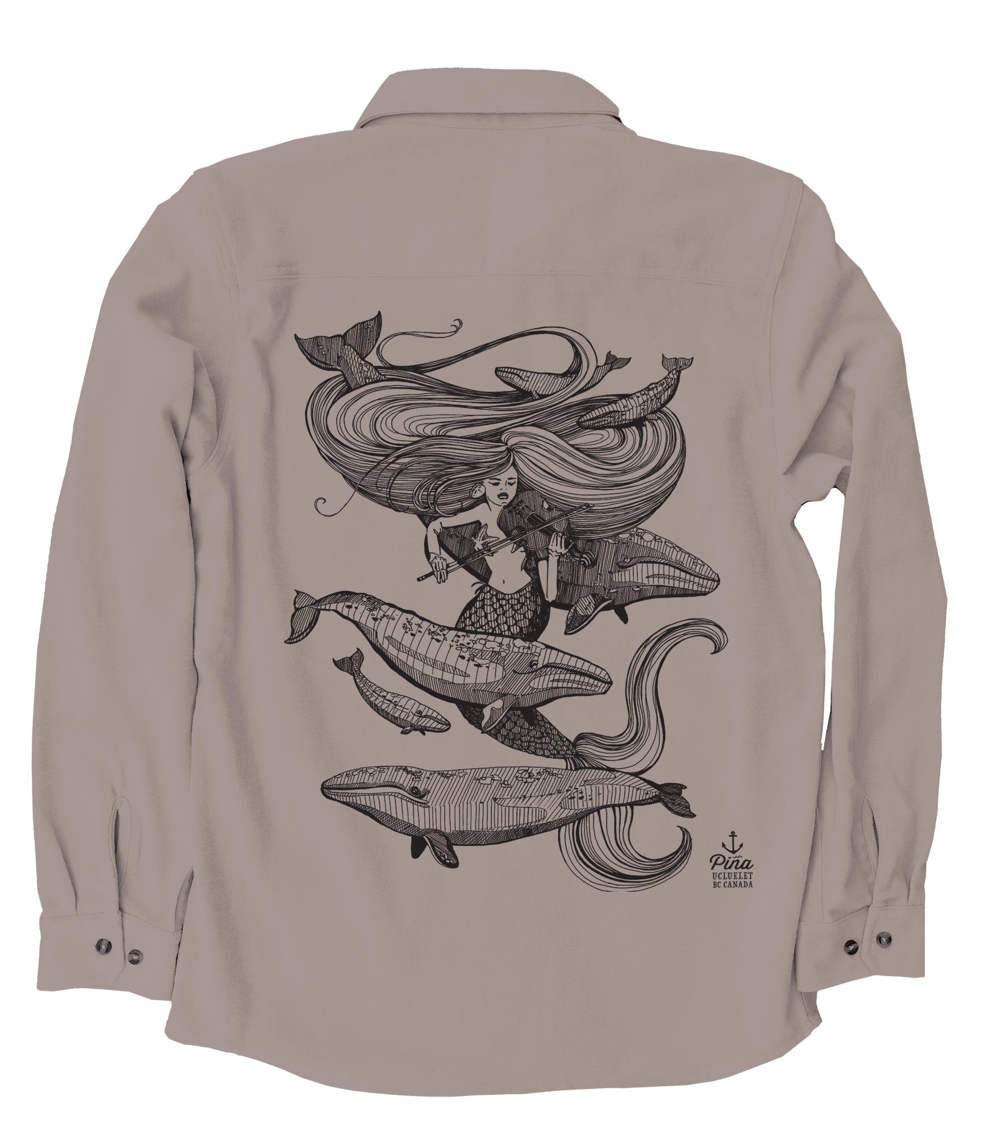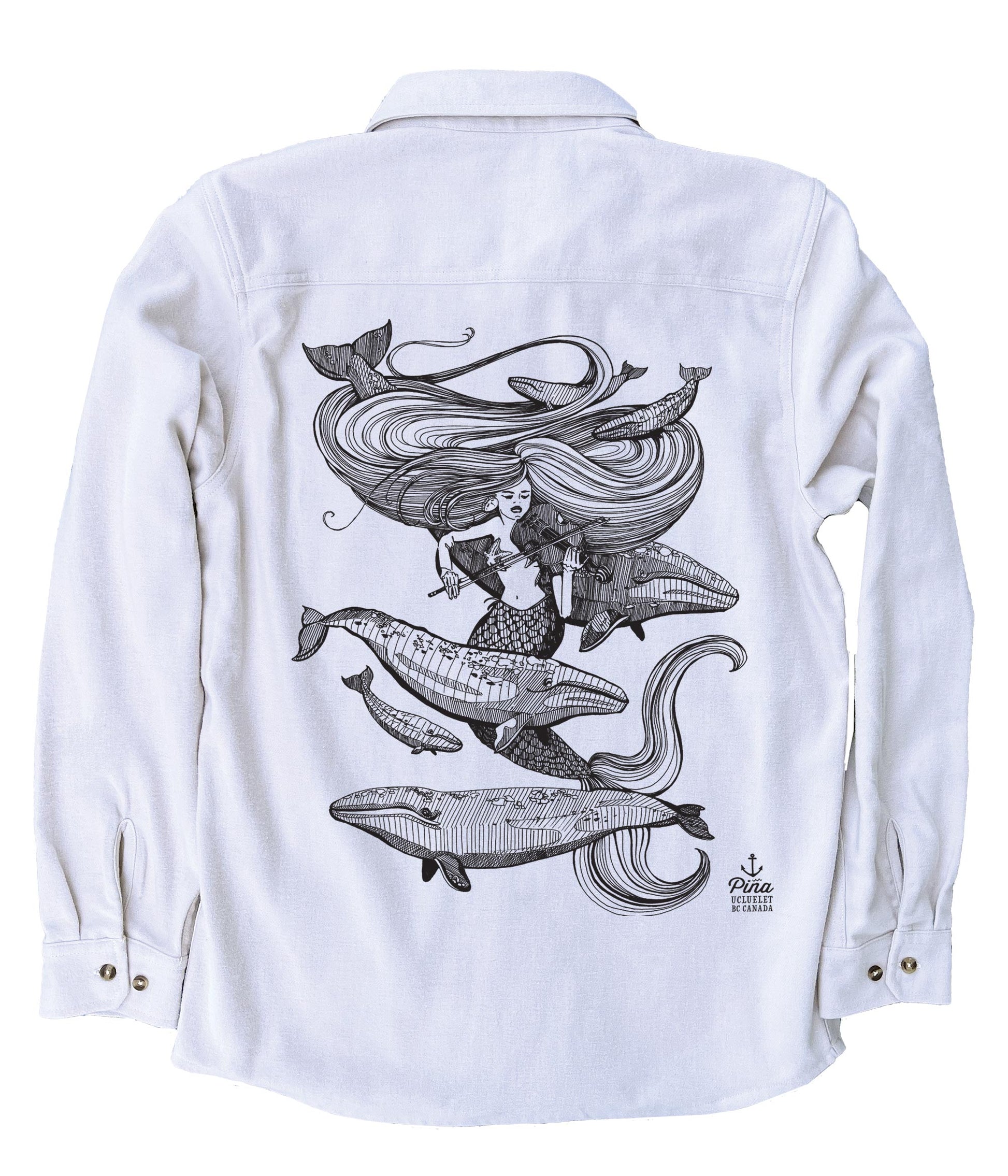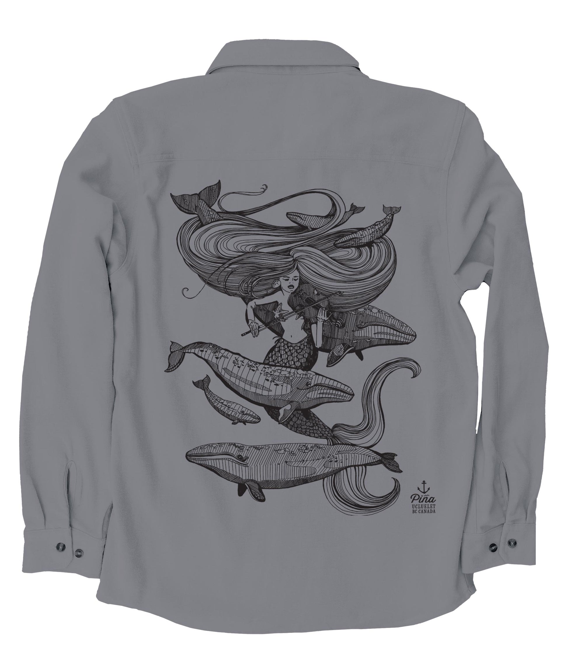 This soft and comfortable unisex flannel is printed with our beautiful Mermaid Fiddling design in black ink on the back and a seastar on the front pocket. The siren's song delights the grey whales as they circle around her spiralling hair. Enjoy the rhythm and harmony of this deep sea dance.