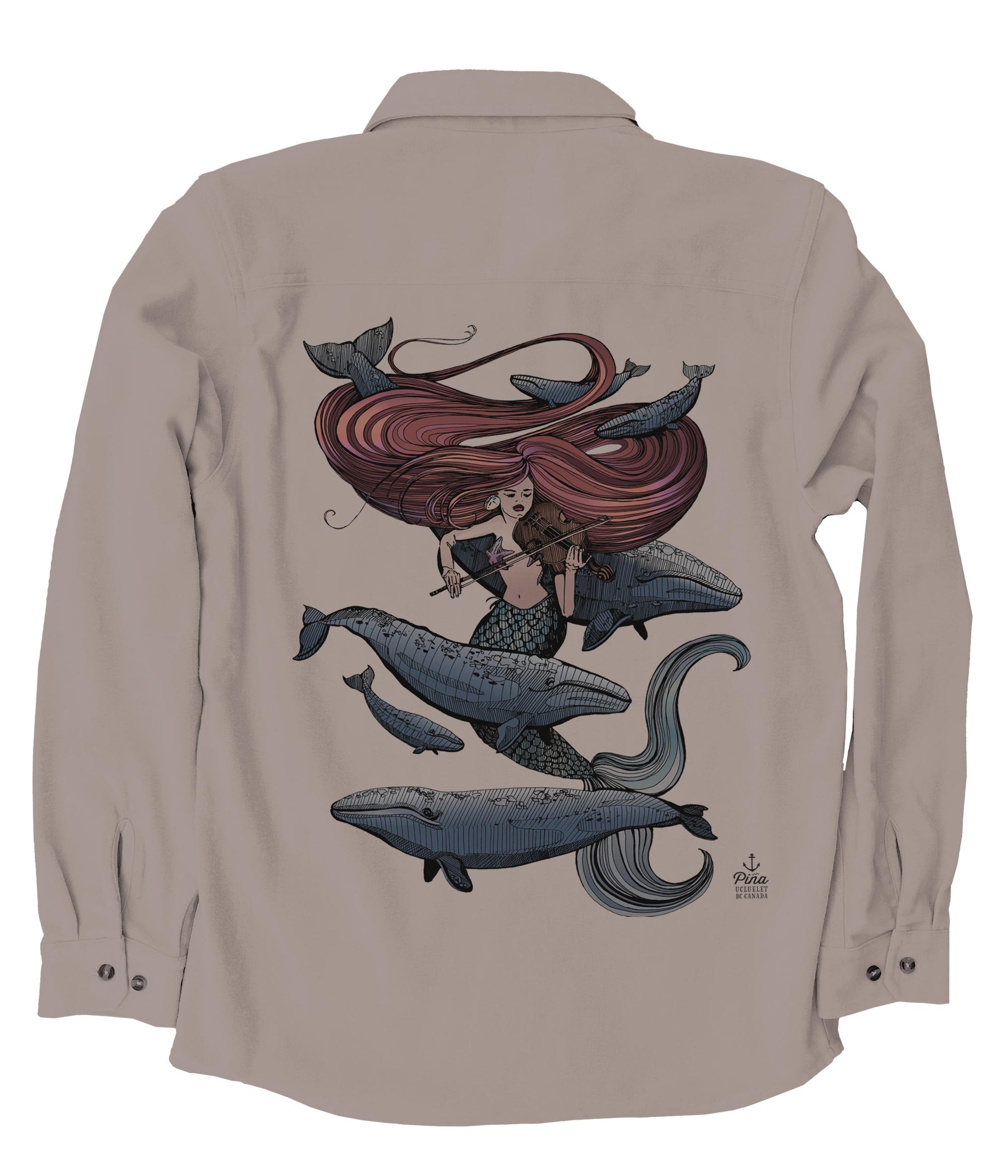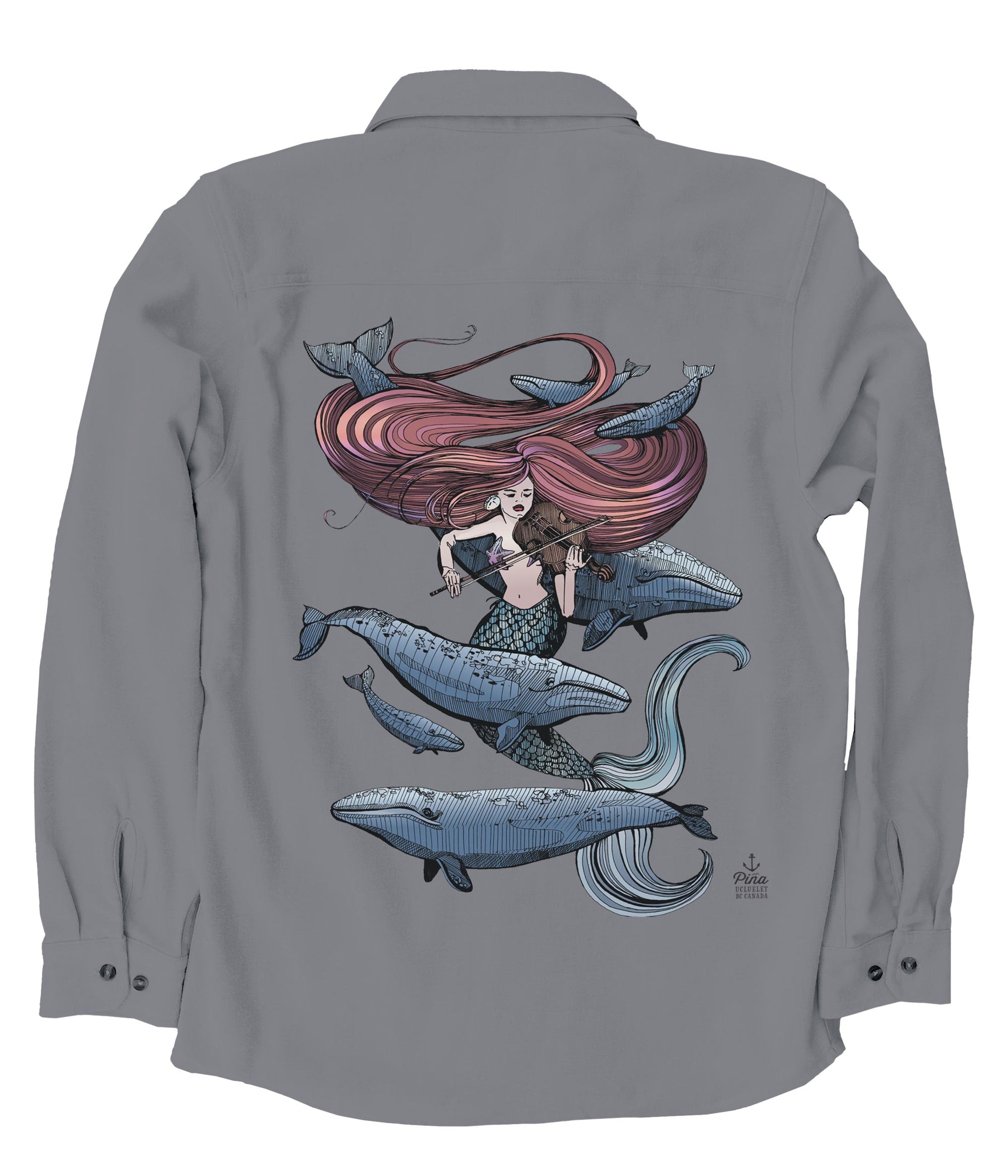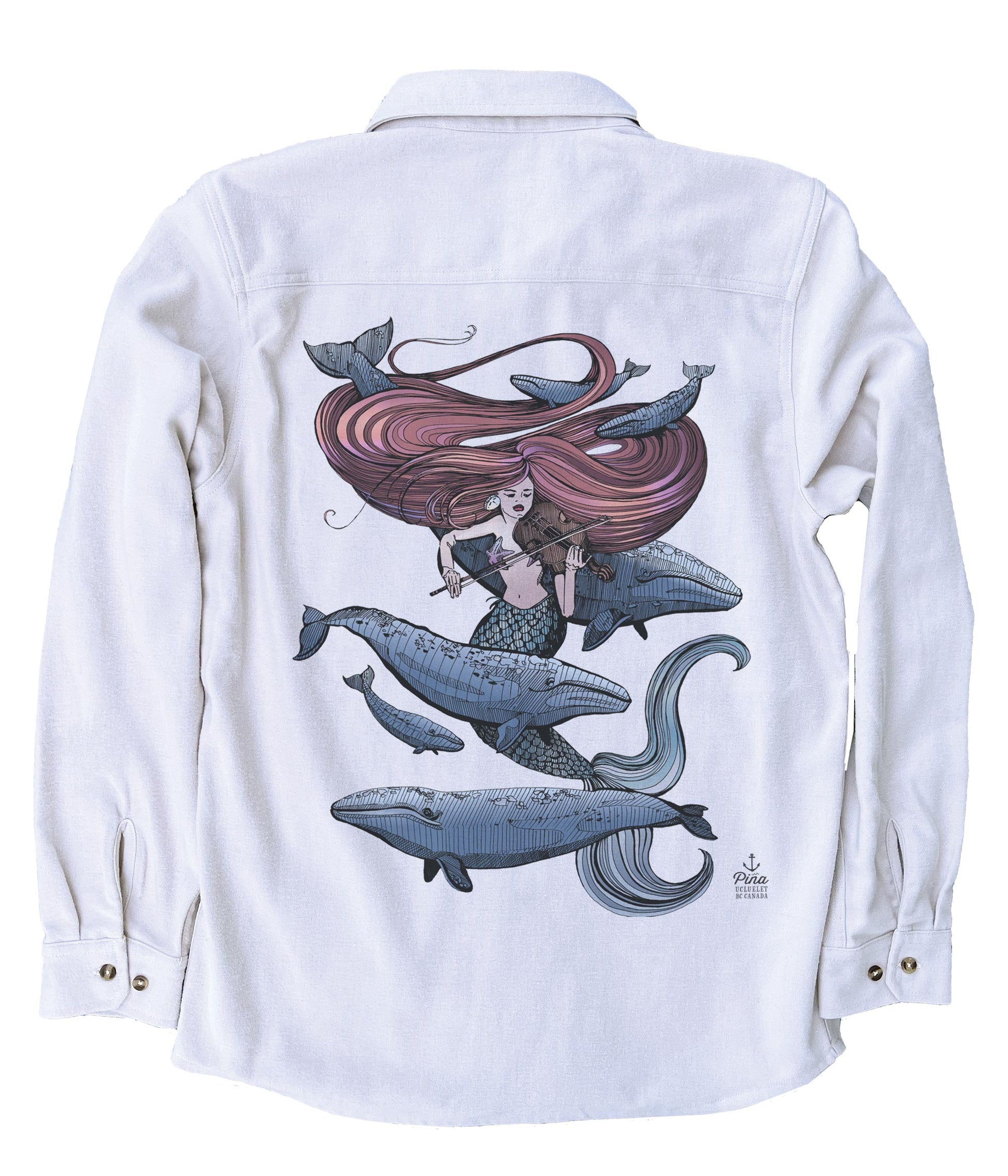 This soft and comfortable unisex flannel is printed with our beautiful Mermaid Fiddling design in full colour on the back and a seastar on the front pocket. The siren's song delights the grey whales as they circle around her spiralling hair. Enjoy the rhythm and harmony of this deep sea dance.