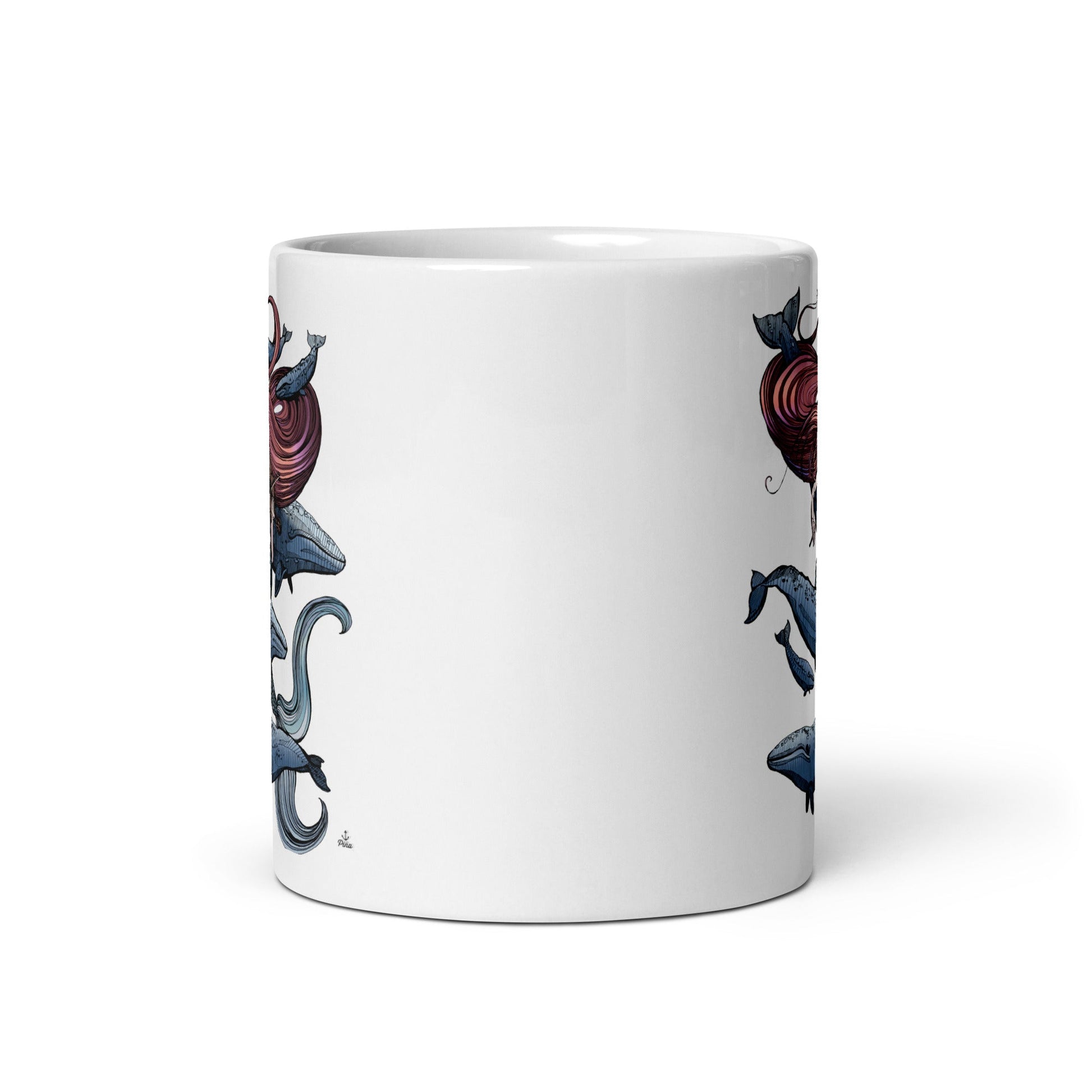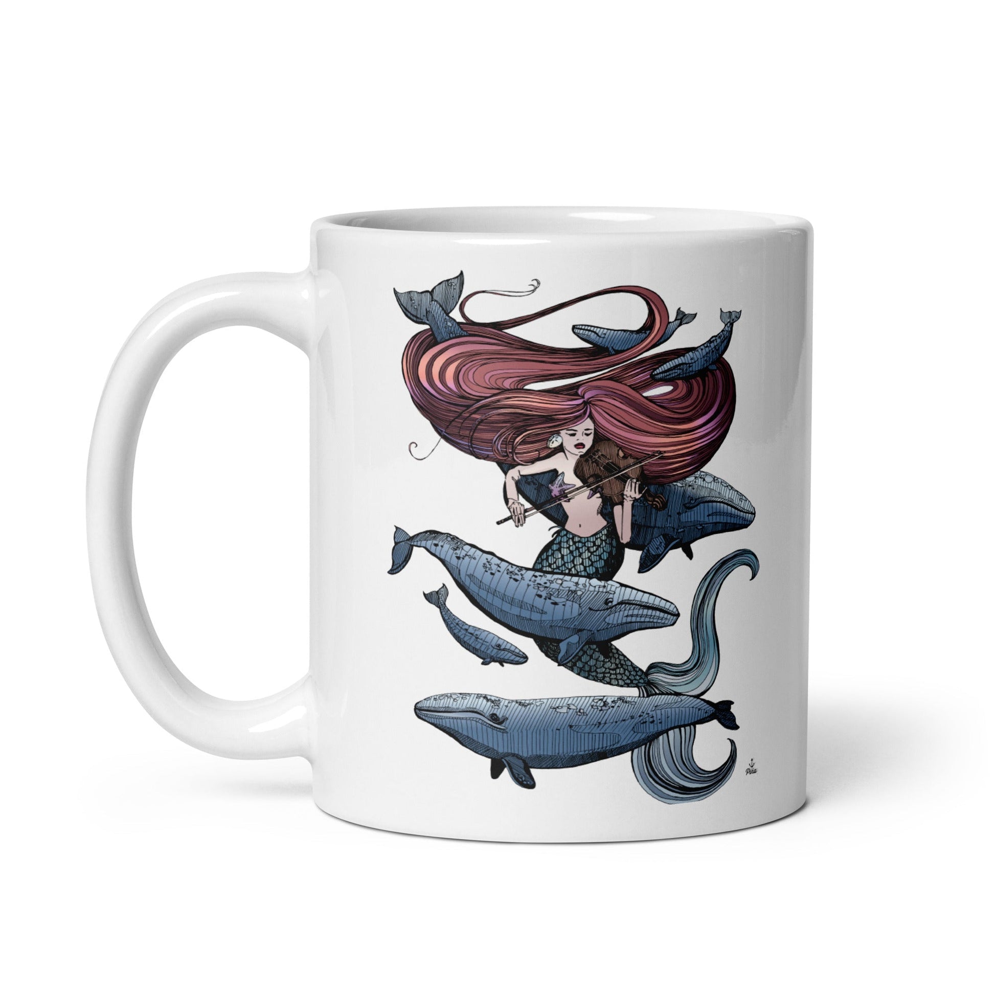 A classic white mug printed with our beautiful Mermaid Fiddling design. The siren's song delights the grey whales as they circle around her spiralling hair. This super detailed ink drawing is now available in vibrant colour. Enjoy the rhythm and harmony of this deep sea dance.