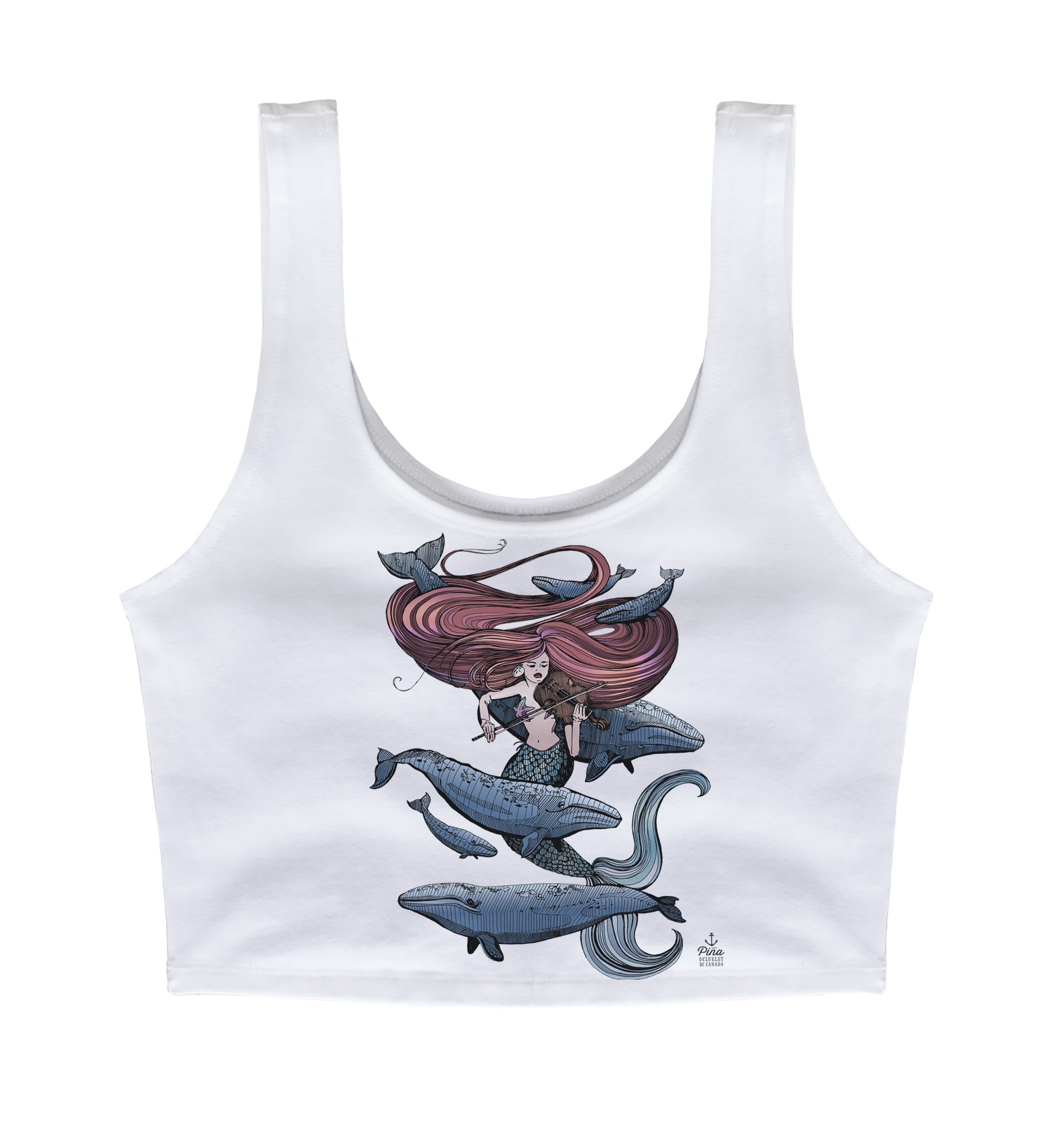 Our Mermaid Fiddling full colour on the front of a high quality, organic cotton crop tank.