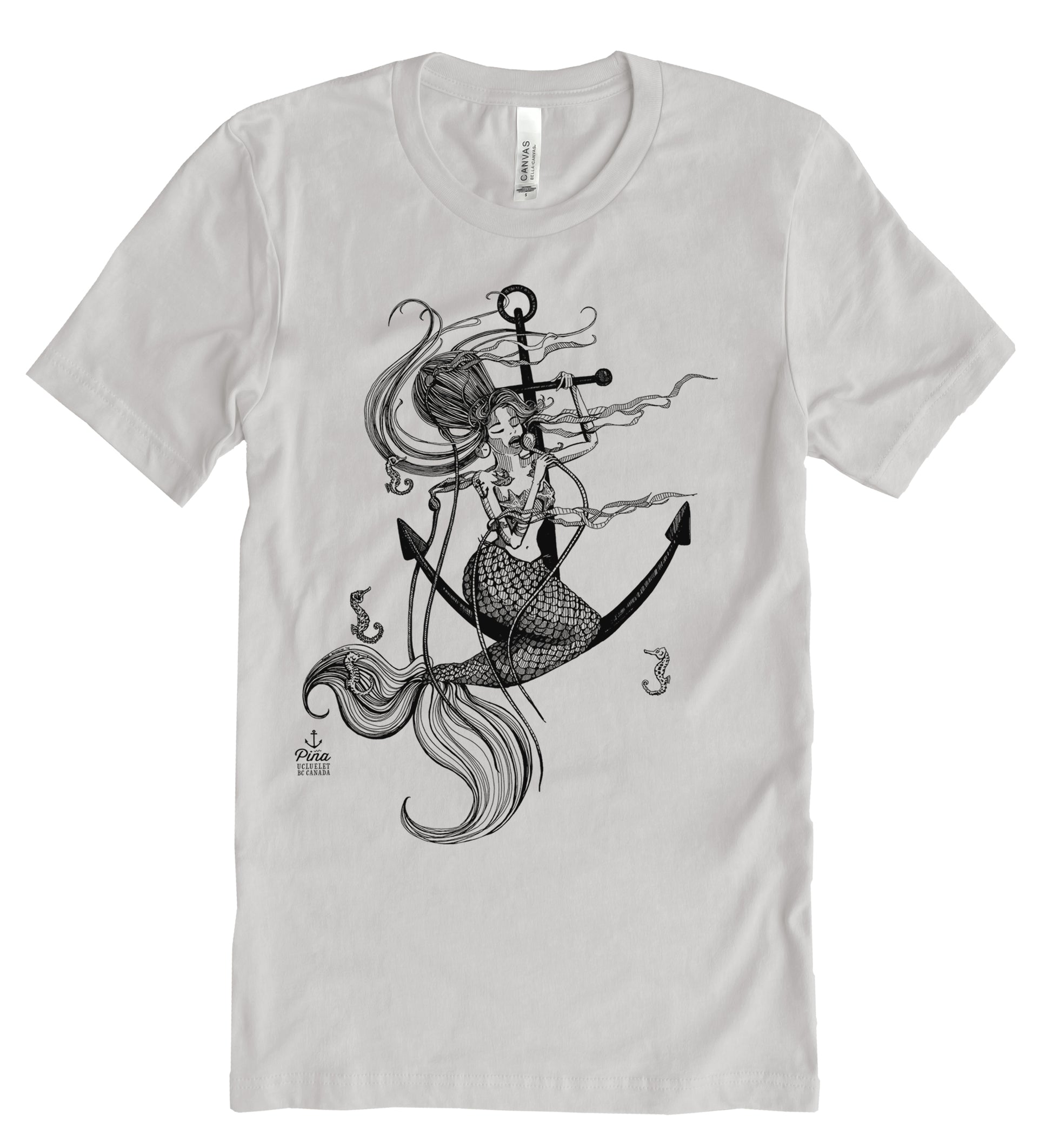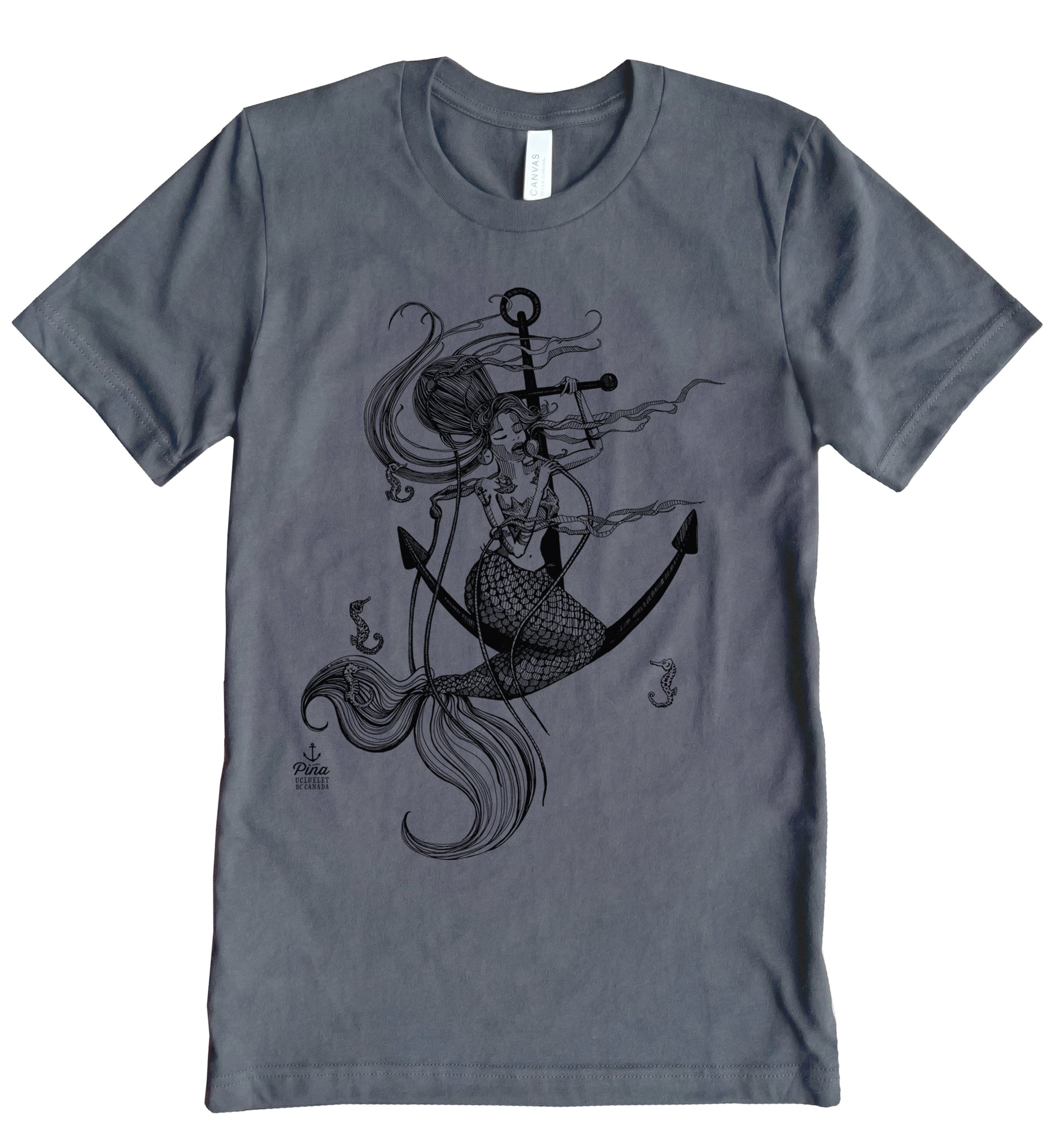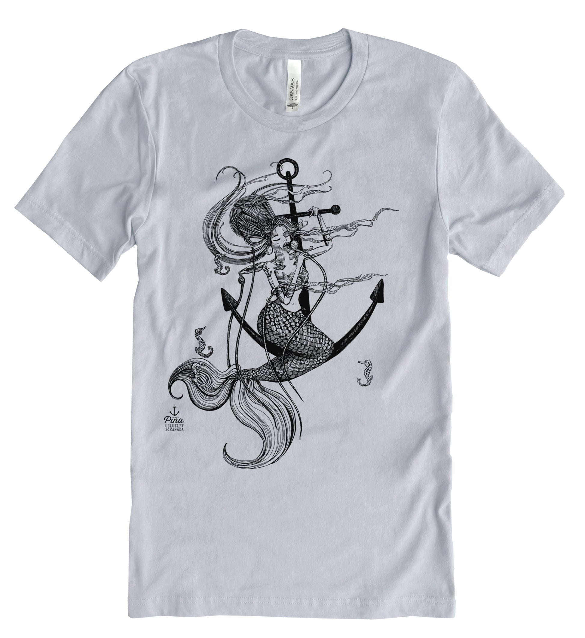 Our Mermaid Singing design printed in black ink on the front of a unisex, cotton jersey t-shirt.