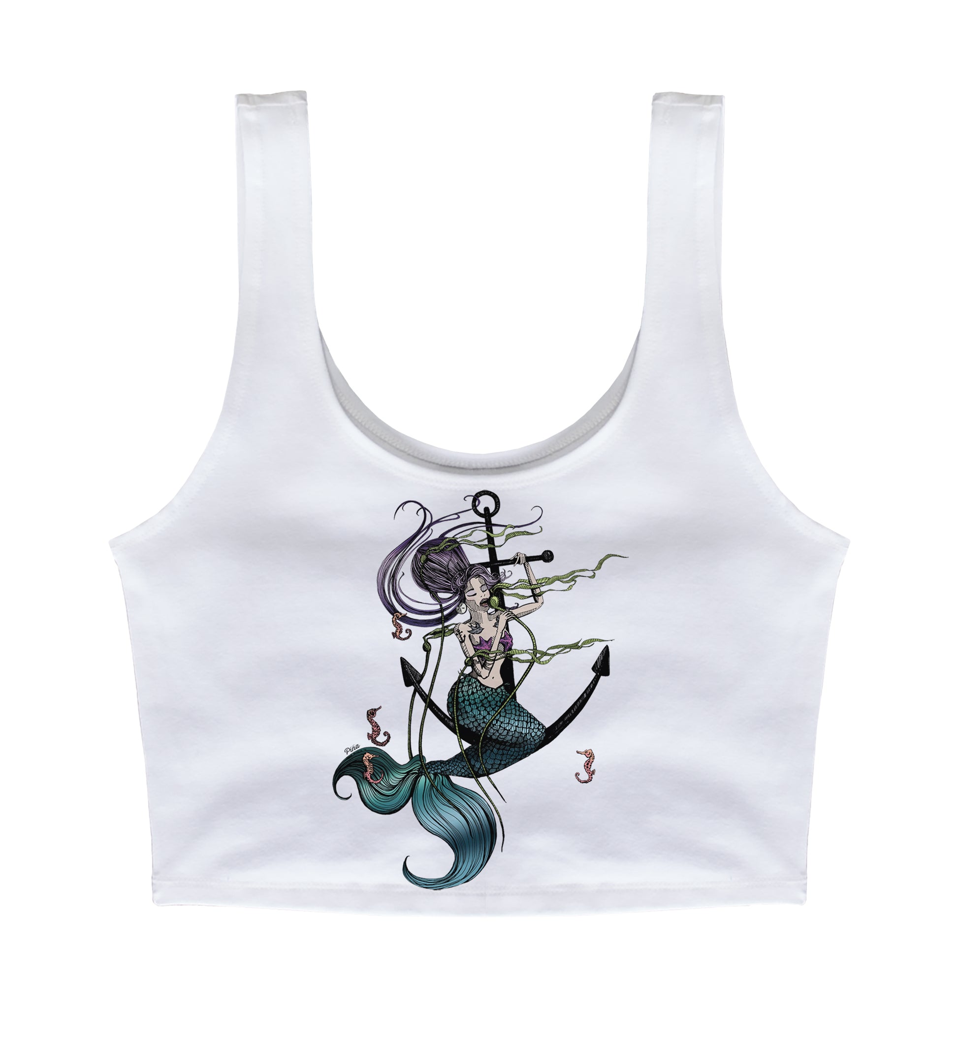 Our Singing Mermaid design printed in full colour on the front of an organic cotton crop tank.