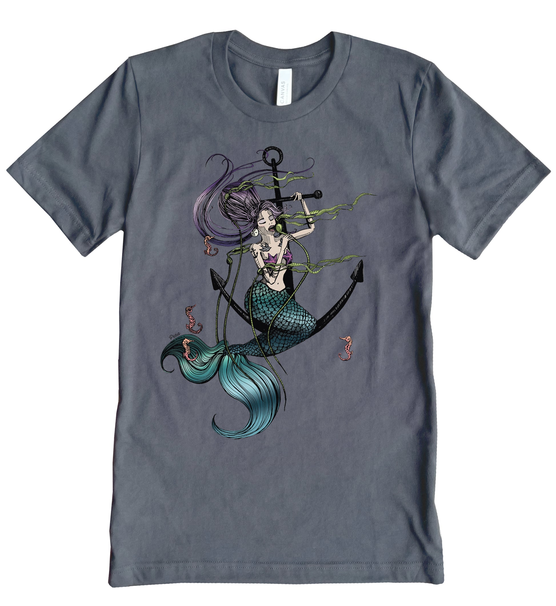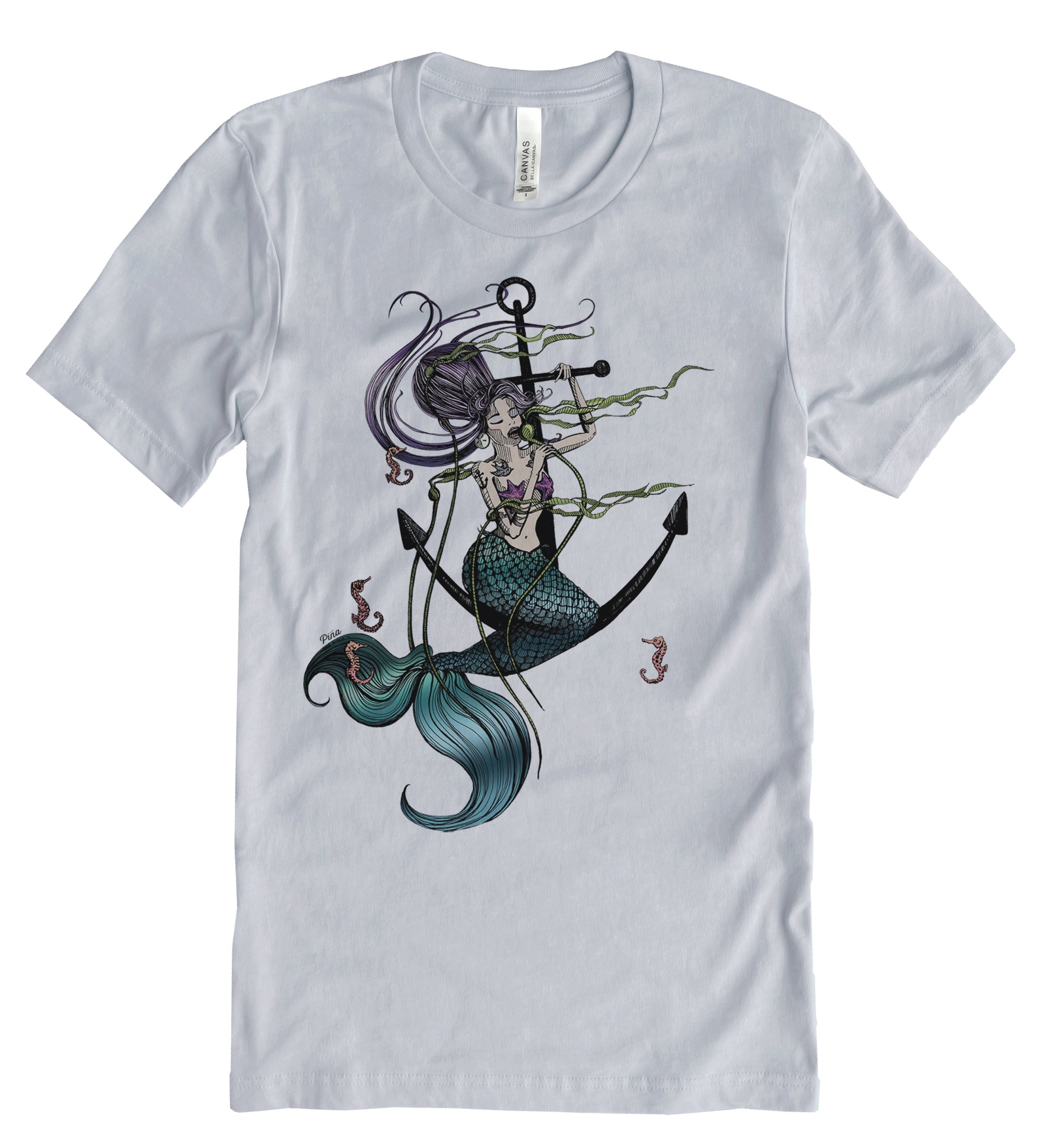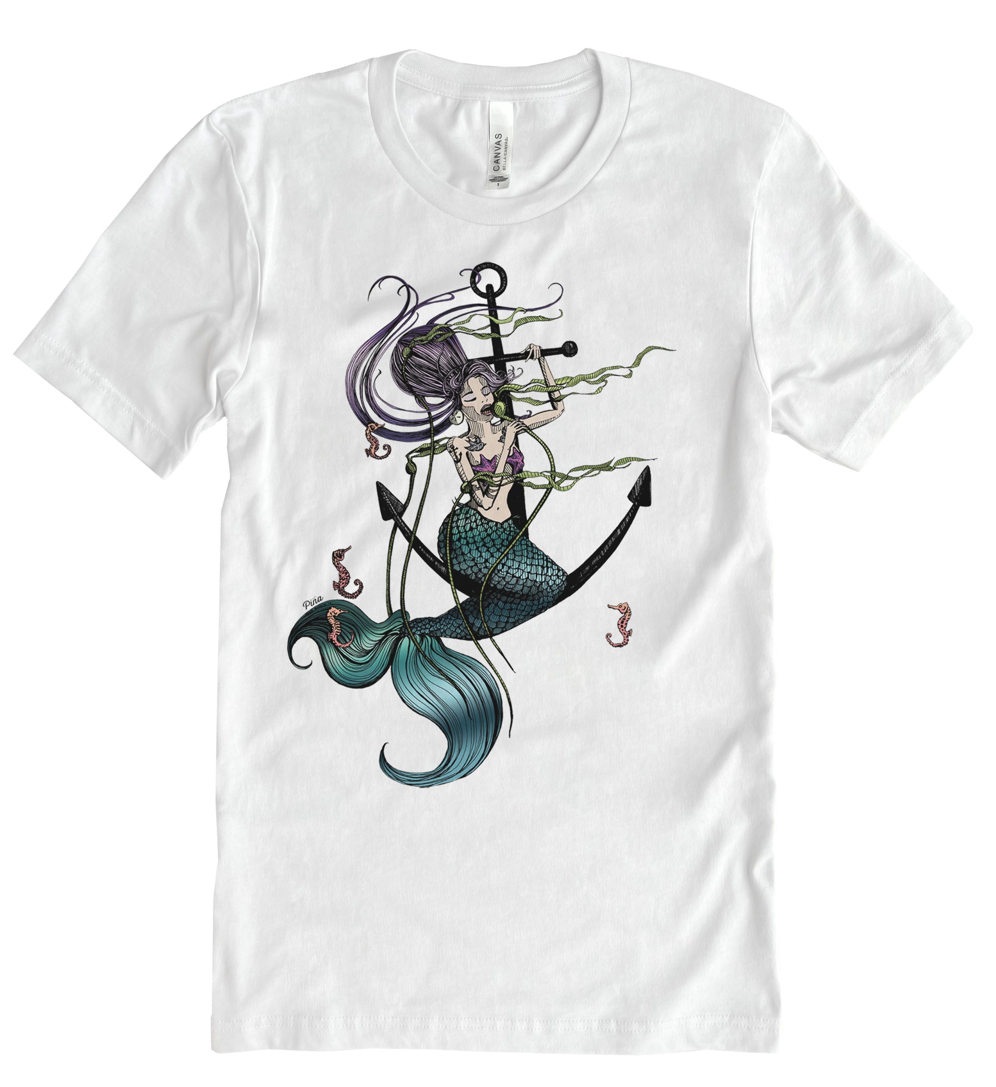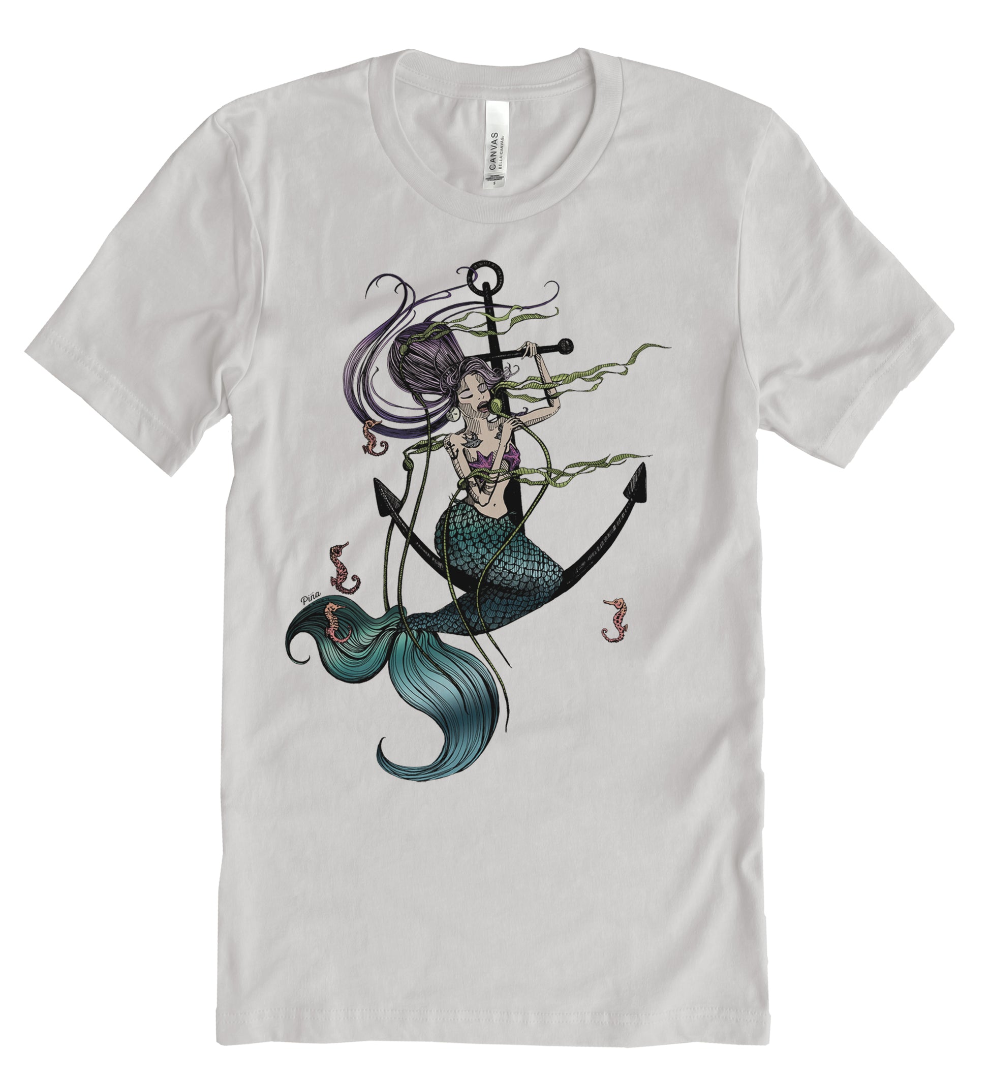 Our Mermaid Singing design printed in full colour on the front of a unisex, cotton jersey t-shirt.