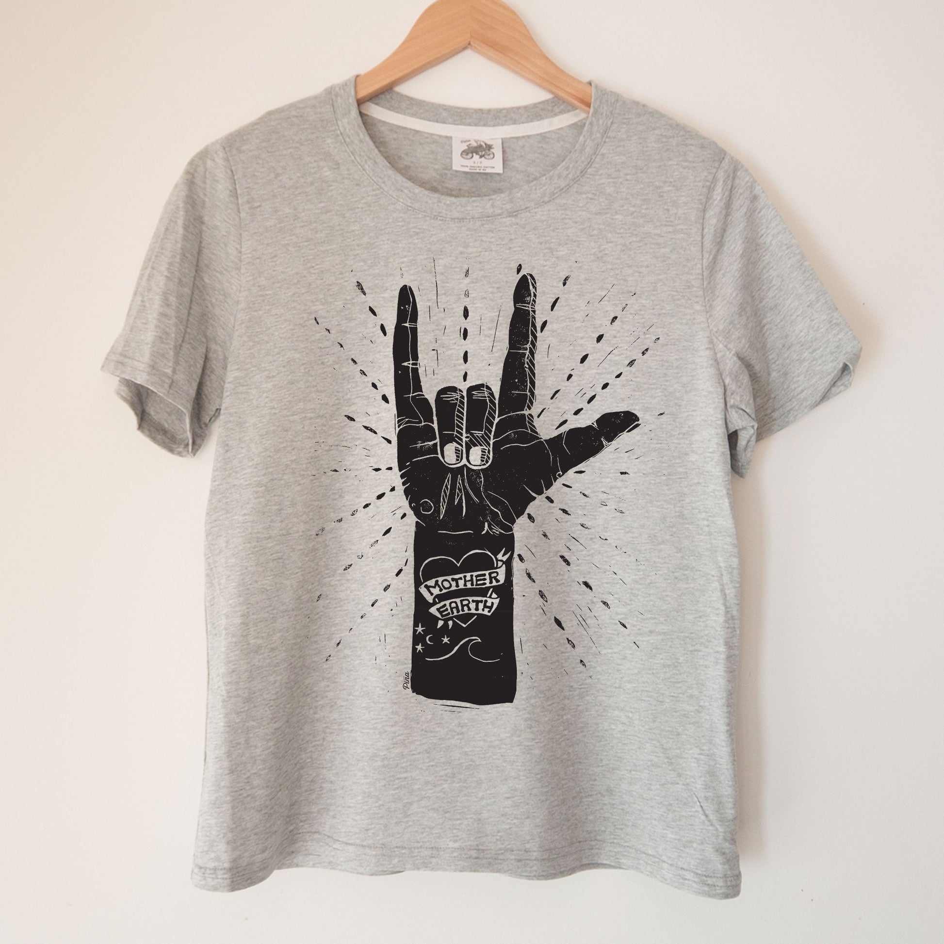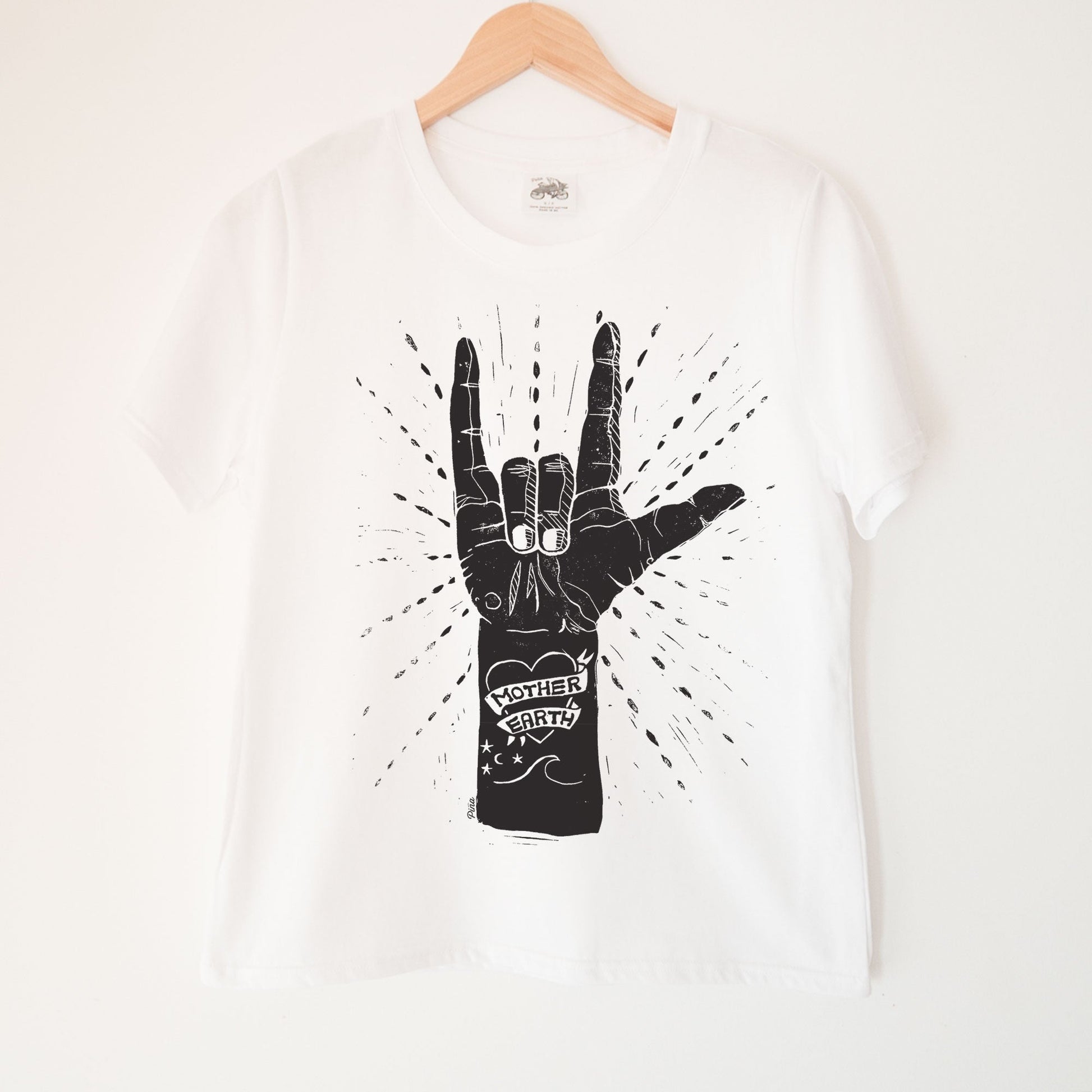 A soft and comfortable organic cotton ladies boxy tee printed with our Mother Earth design. Originally printed from a carved linocut, this print features a hand displaying the American sign language combination sign for "ILY", short for "I love you", with light bursting forth and a modified classic "mom" tattoo on the wrist. Much love to Mother Earth!