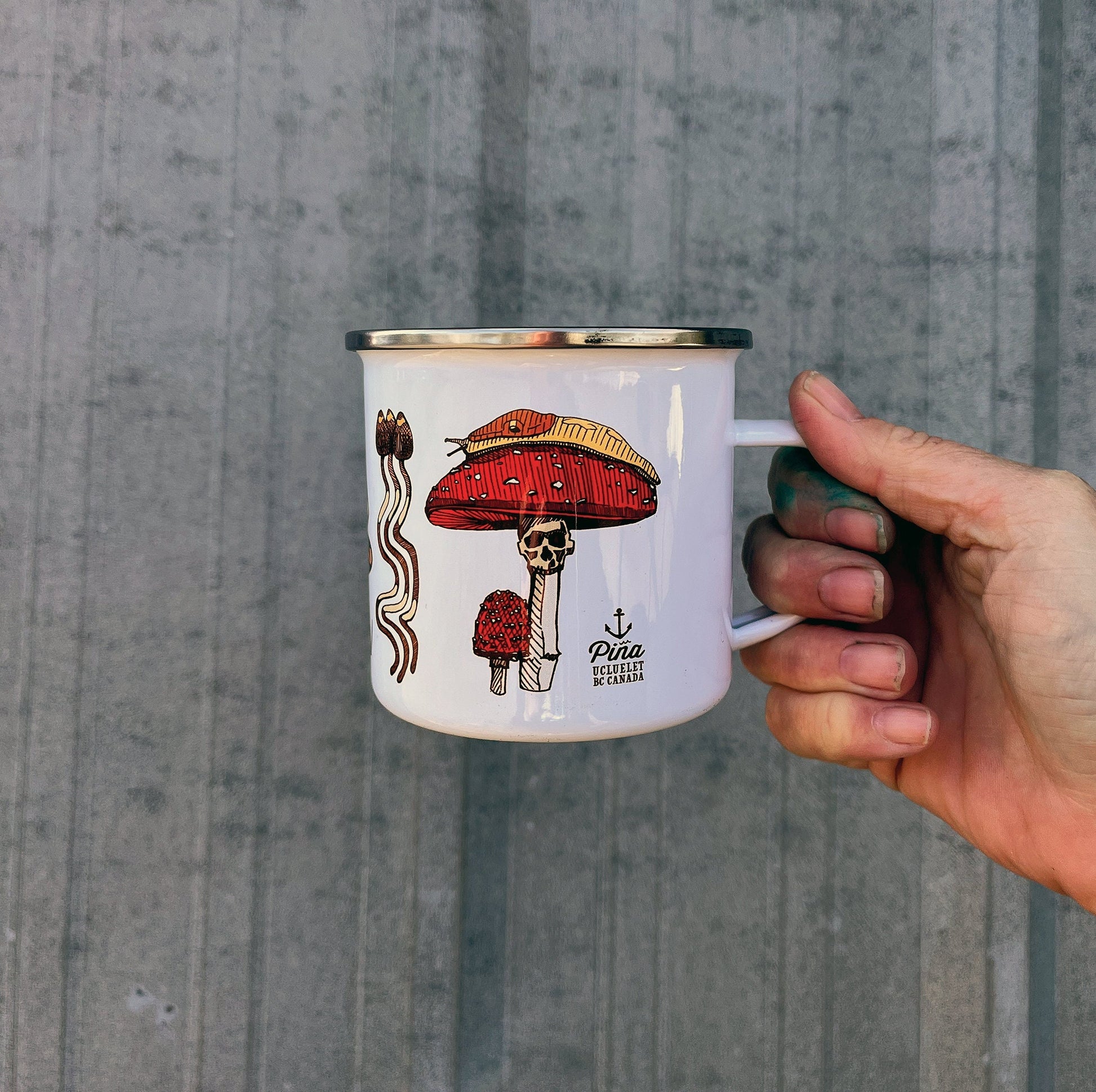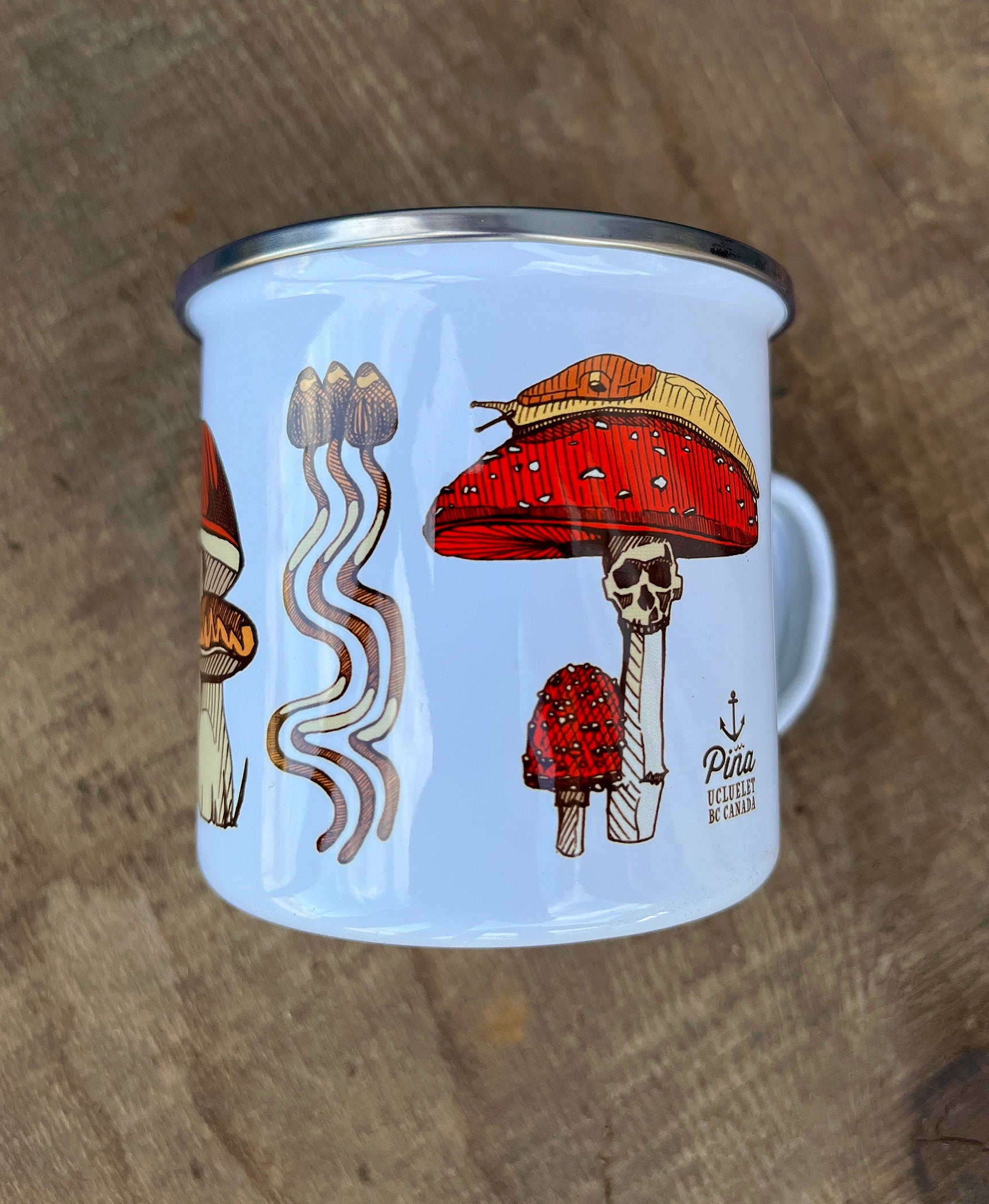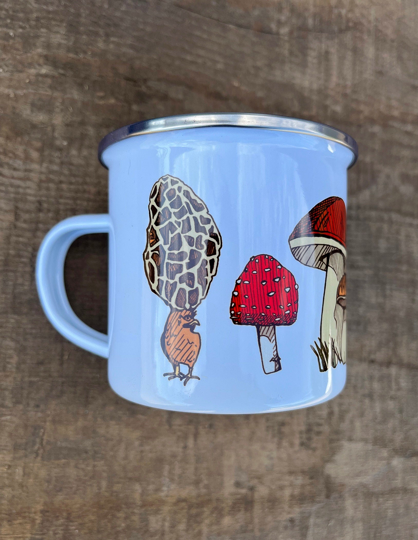 A stainless steel mug with an enamel coating printed with some of our mushrooms. Perfect for outdoor enthusiasts, people who wear flannel, folks that break regular mugs, or anyone wanting to look cool while enjoying a beverage.