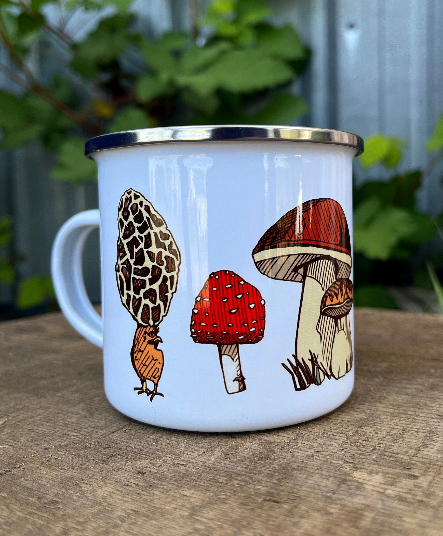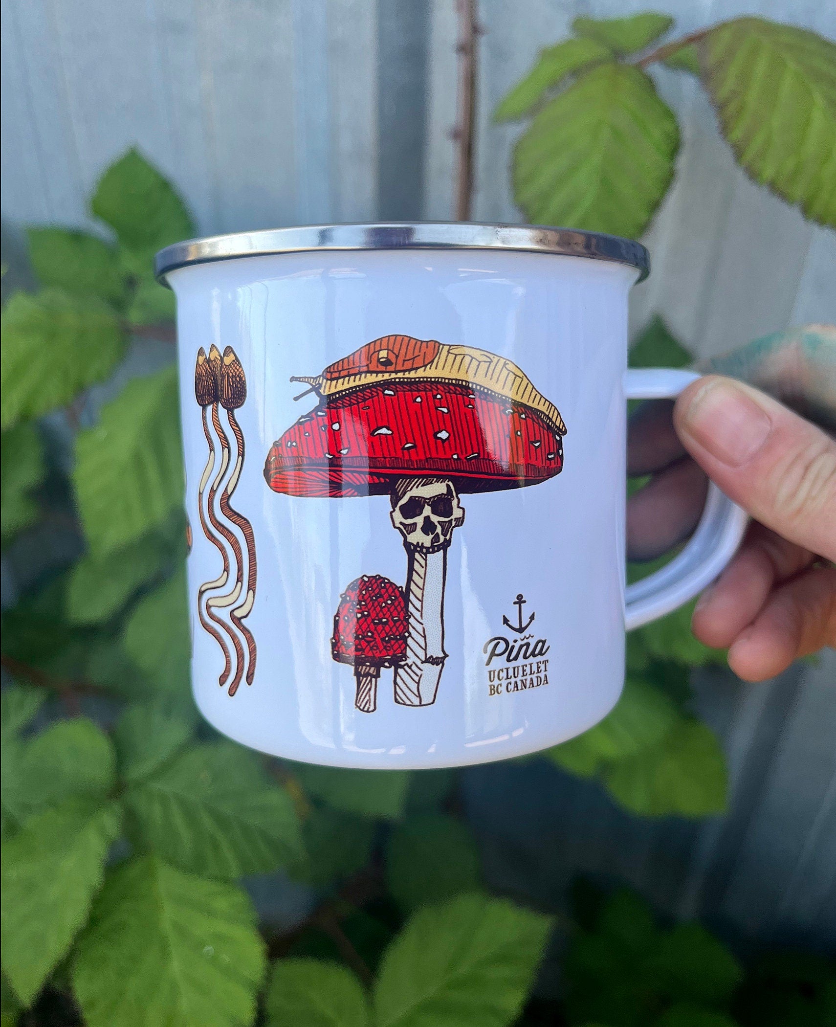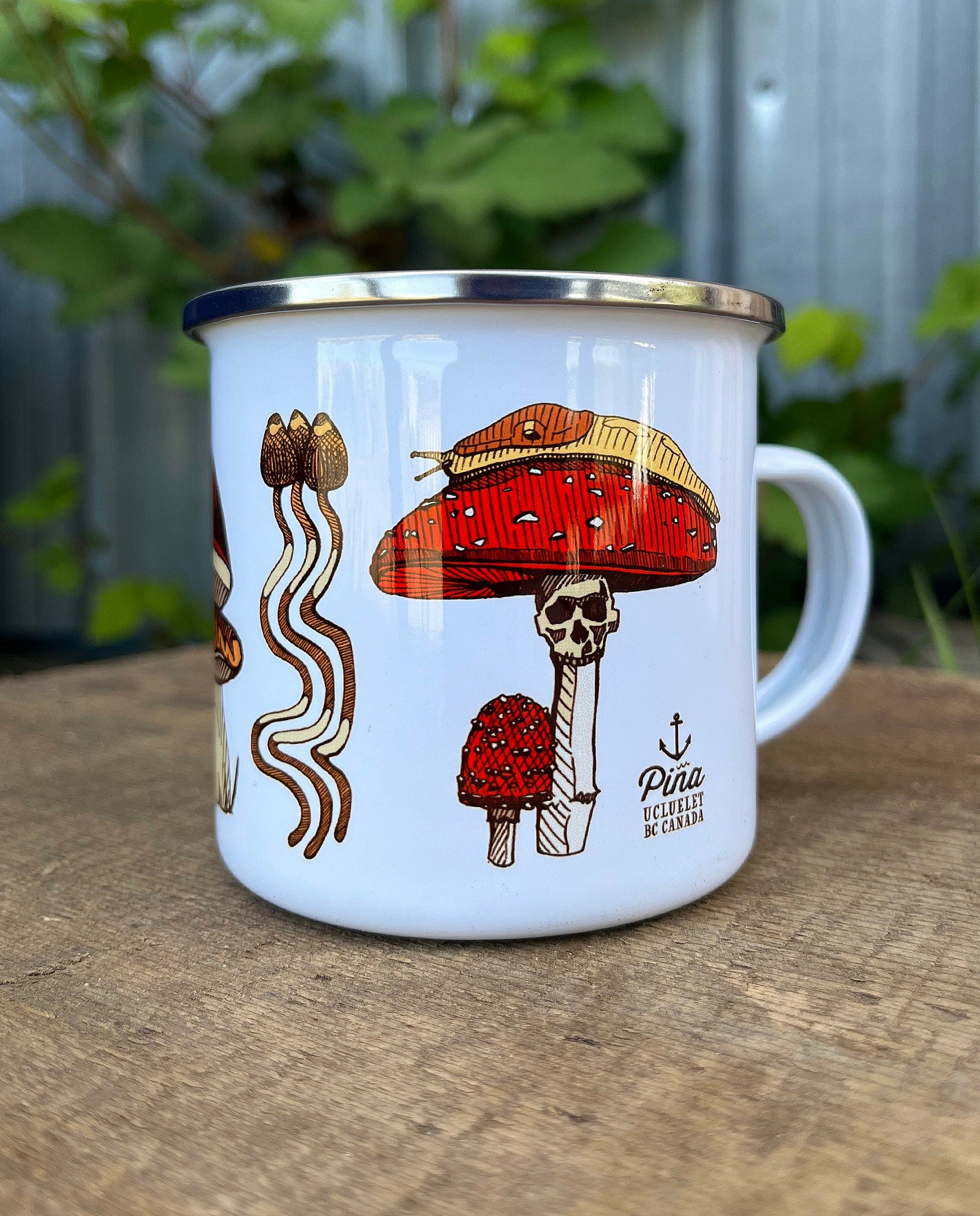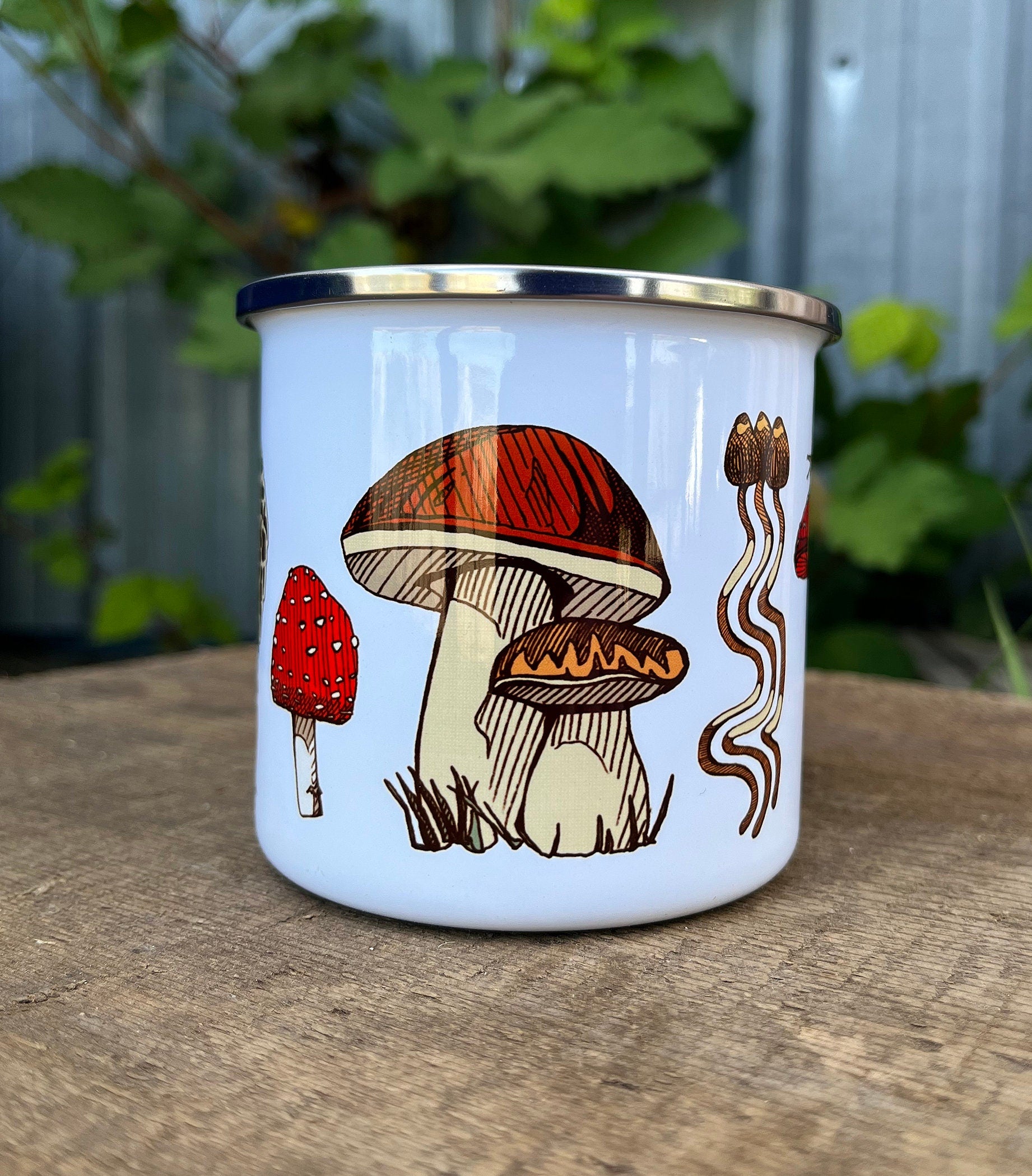 A stainless steel mug with an enamel coating printed with some of our mushrooms. Perfect for outdoor enthusiasts, people who wear flannel, folks that break regular mugs, or anyone wanting to look cool while enjoying a beverage.