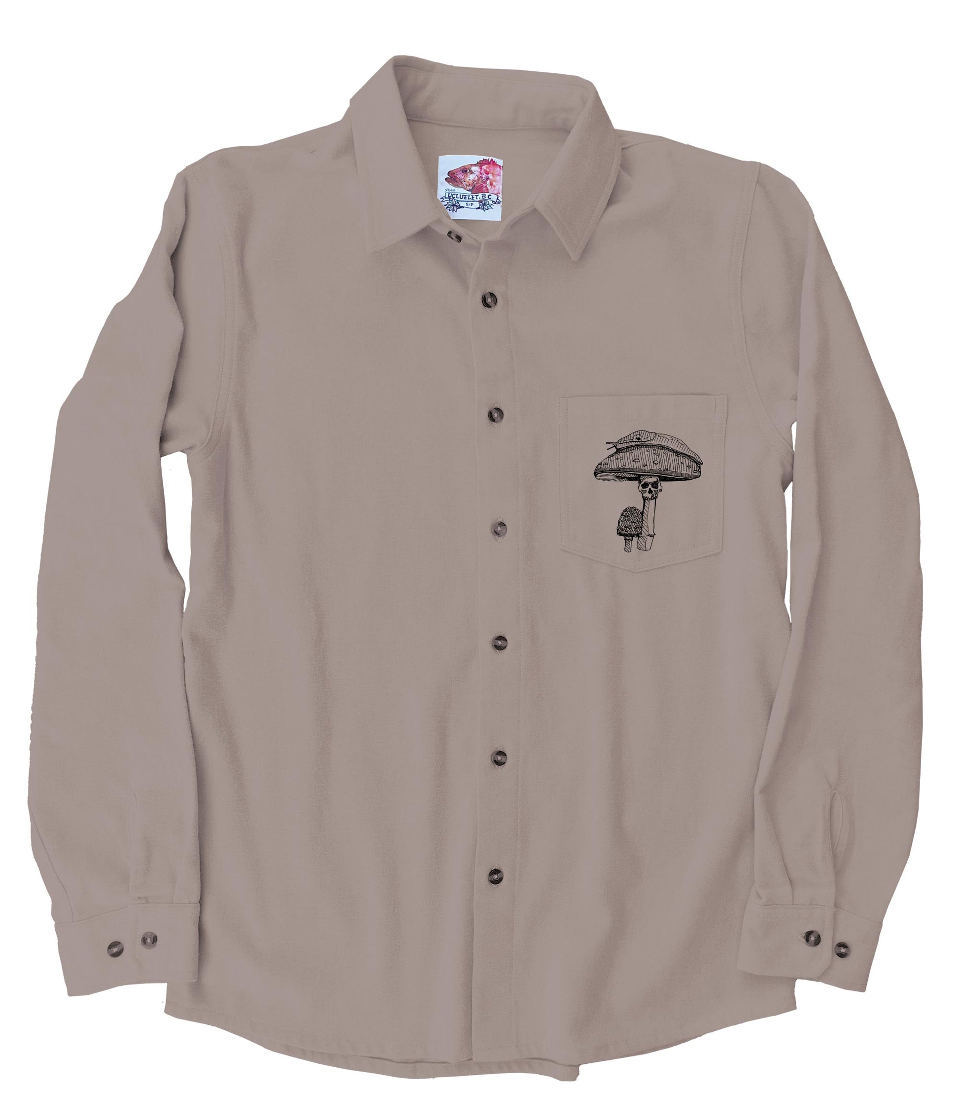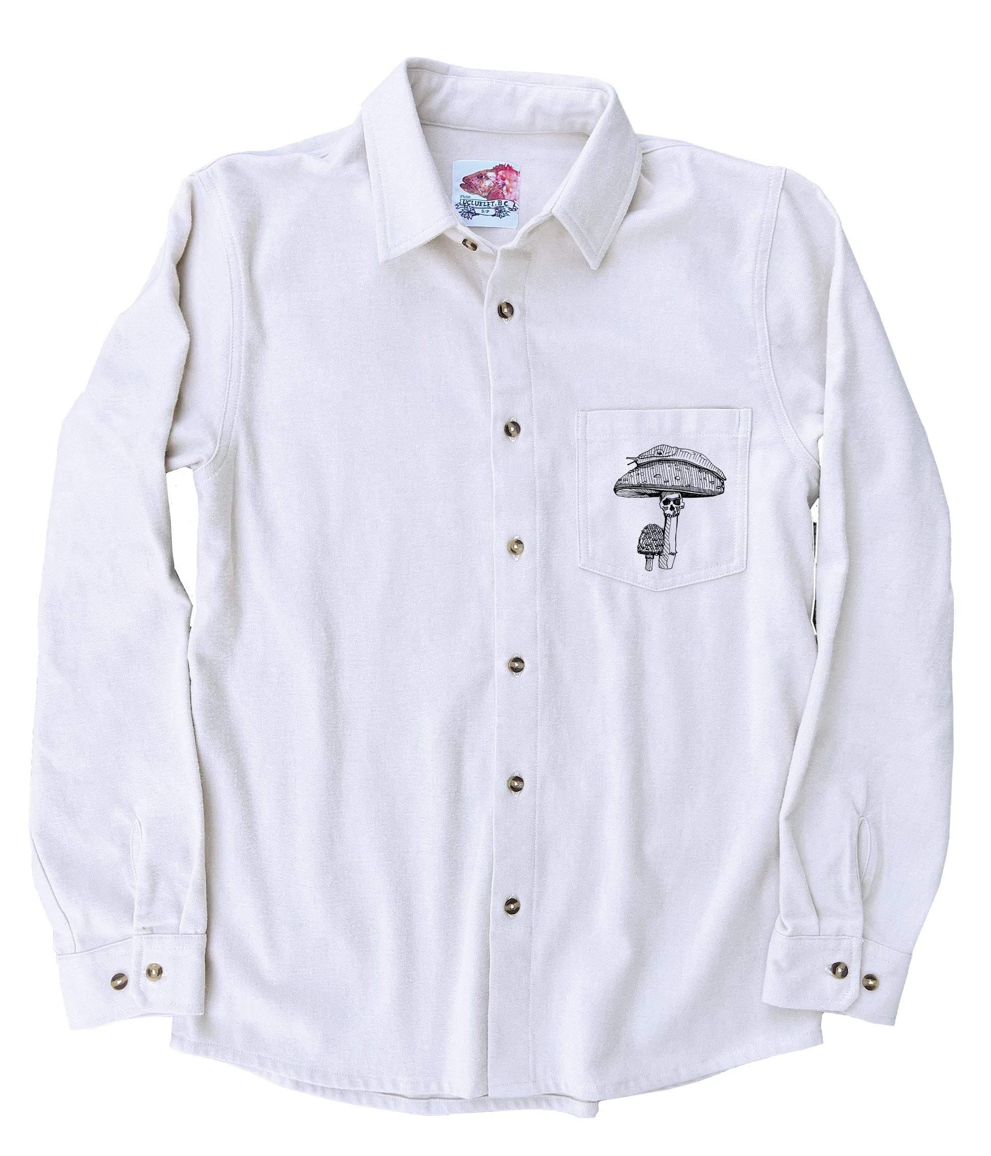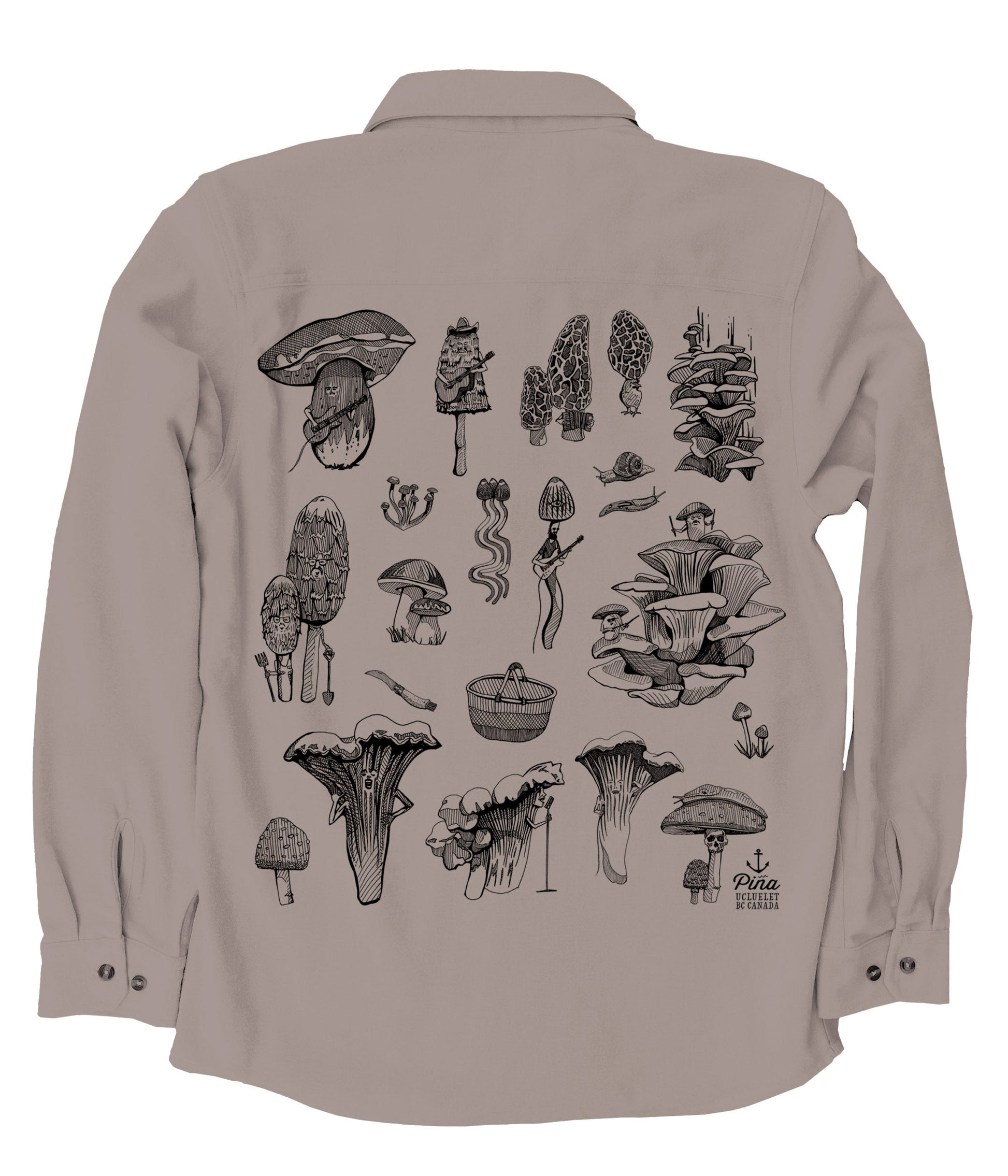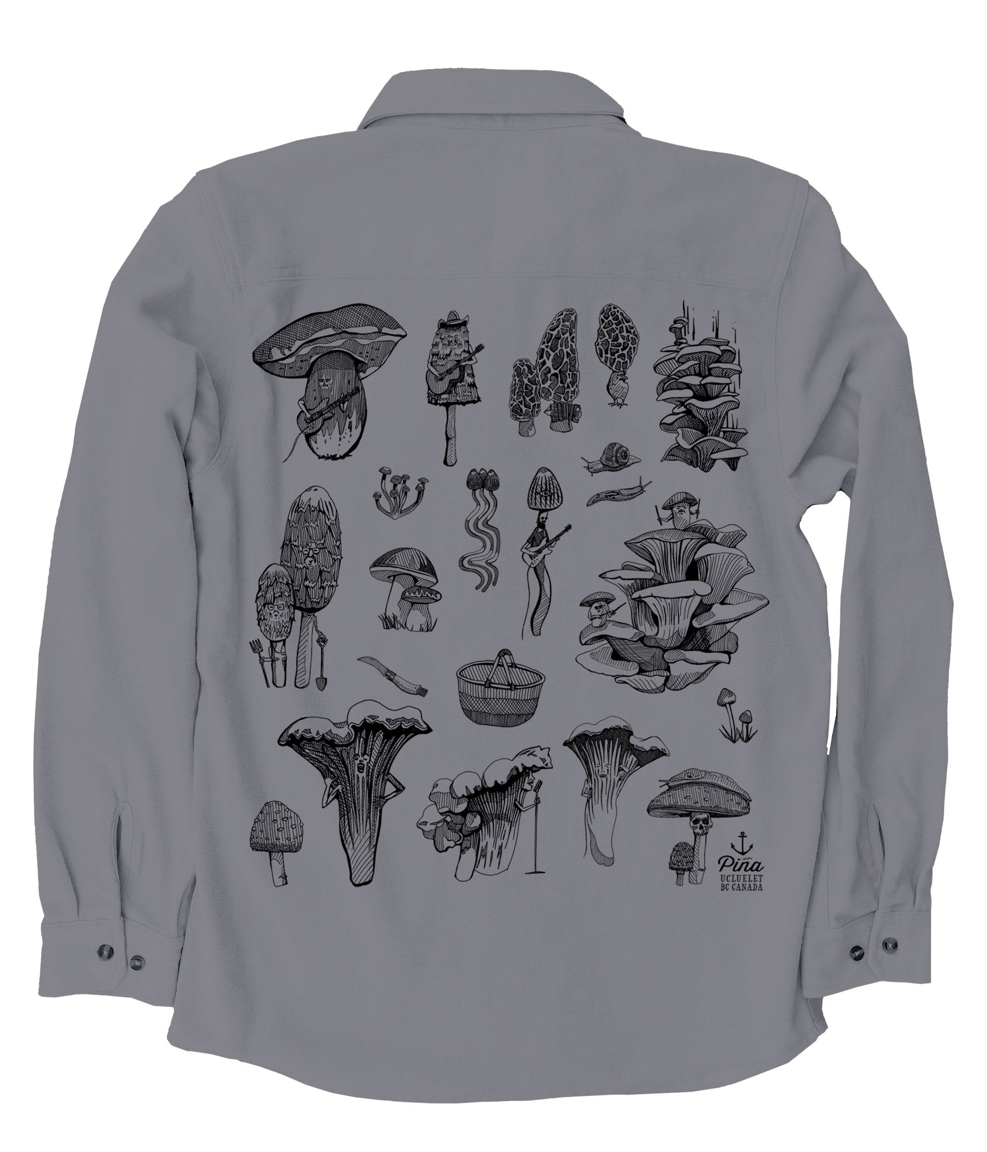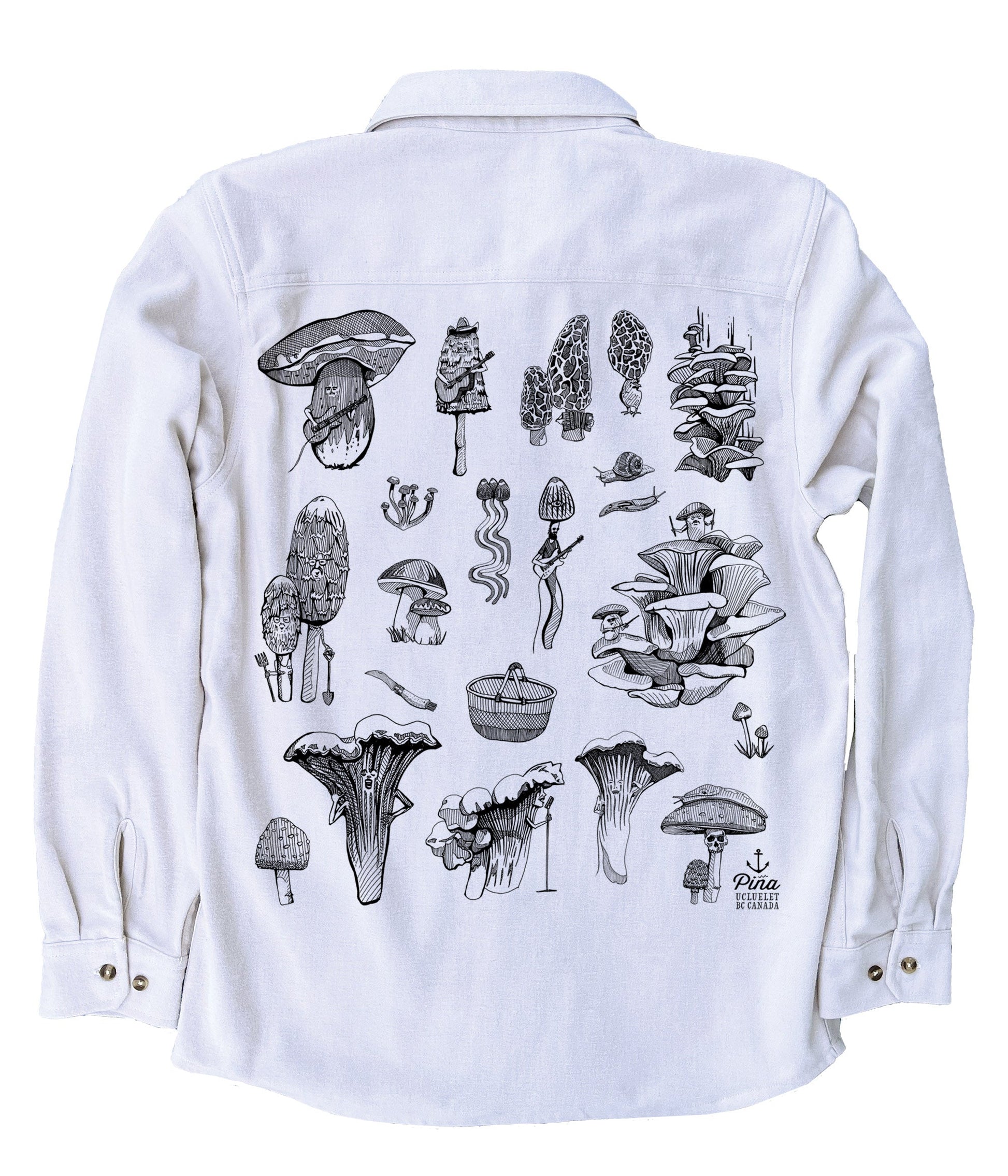 This soft and comfortable organic cotton flannel is printed with our magical mushrooms design in black ink on the back with an amanita skull on the front pocket. These personified mushrooms bring the vibes of the woods to life–including Pacific Northwest favourites such as singing chanterelles, drumming oyster mushroom, the shaggy mane hippie guy, and morels–or chicken of the woods. We've also included a trippy psilocybin guy, a snail, banana slug and a gnome favourite–the beautiful amanita. A fun shirt for the fungi in you.