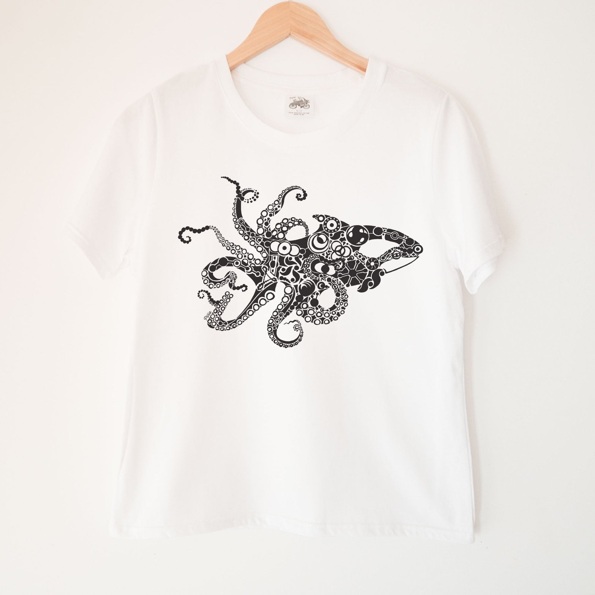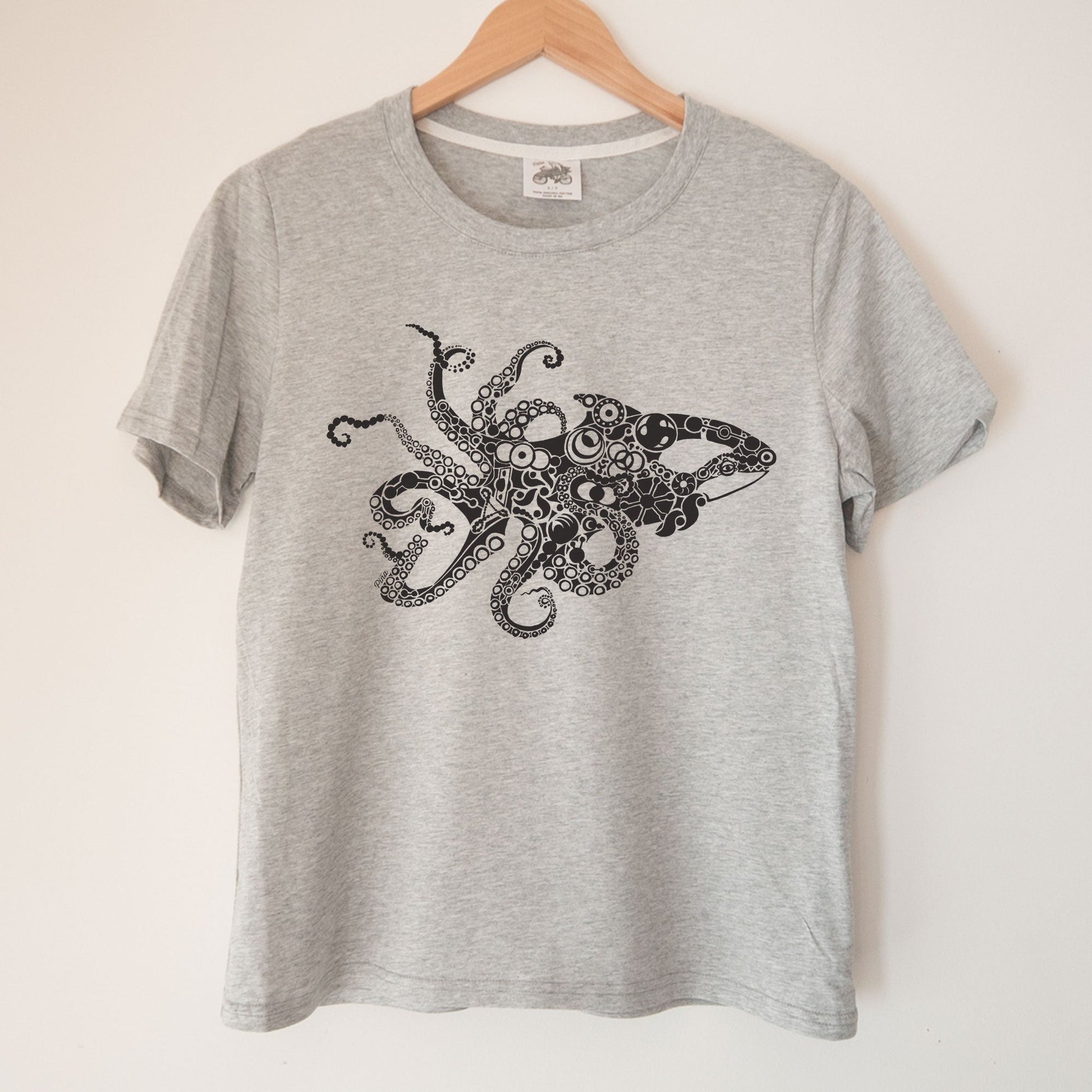 A soft and comfortable organic cotton ladies boxy tee printed with our Octorca design. An octopus and orca combine in a whirl of symbols originally seen in crop circles.