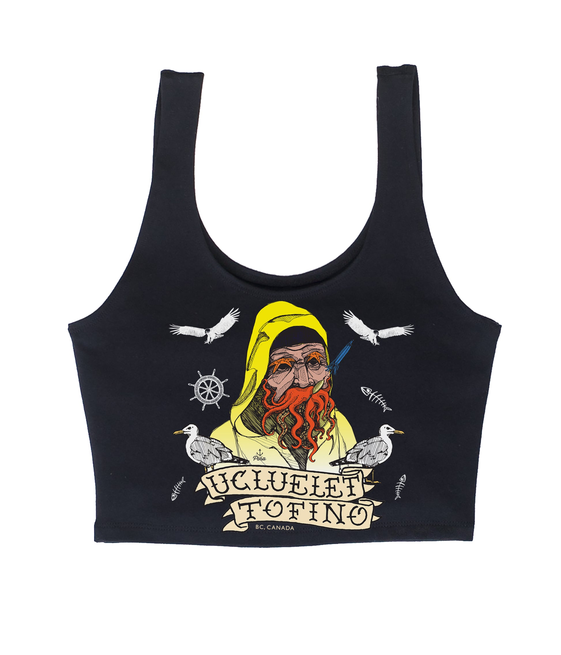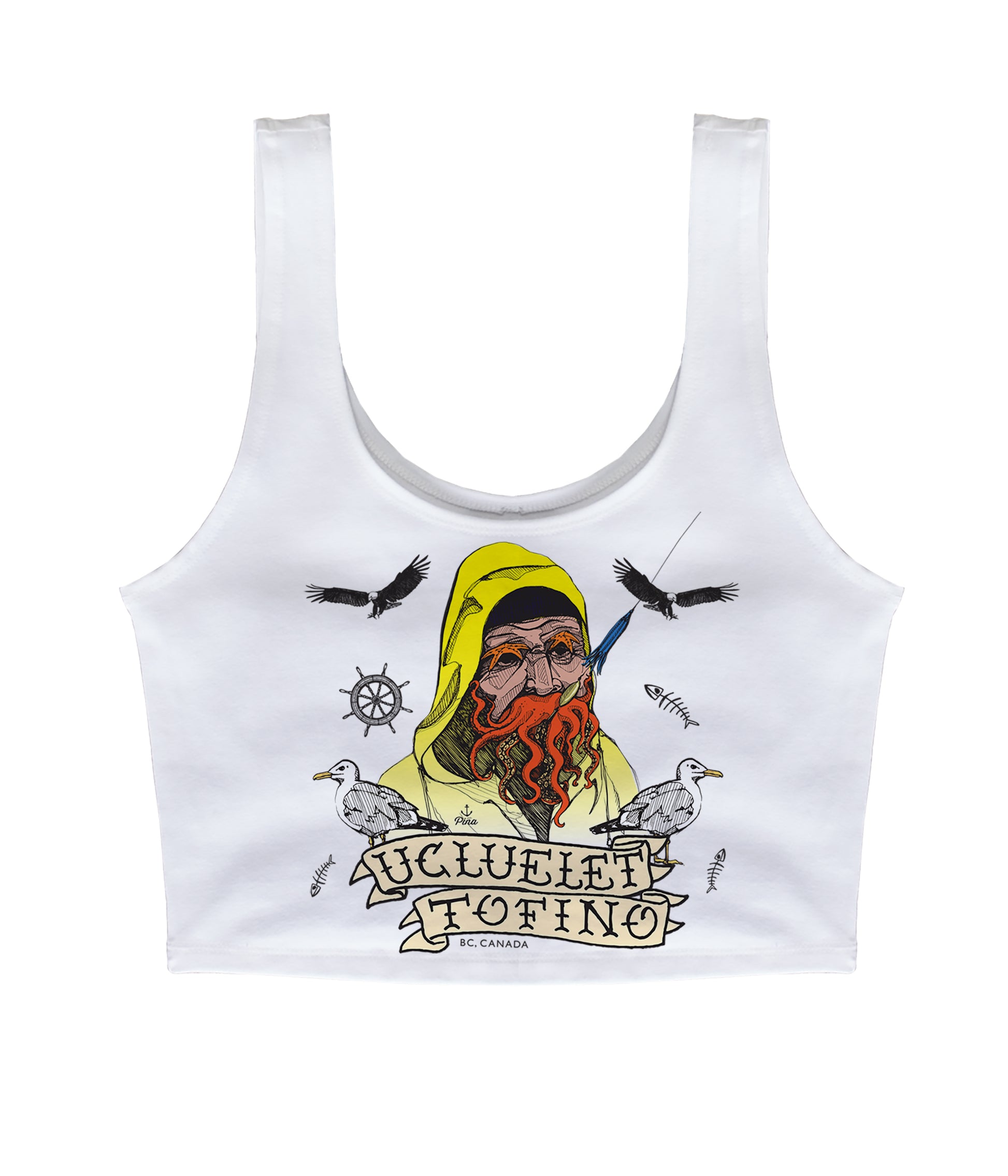 Our Old Salty compilation printed in full colour on the front of an organic cotton crop tank.