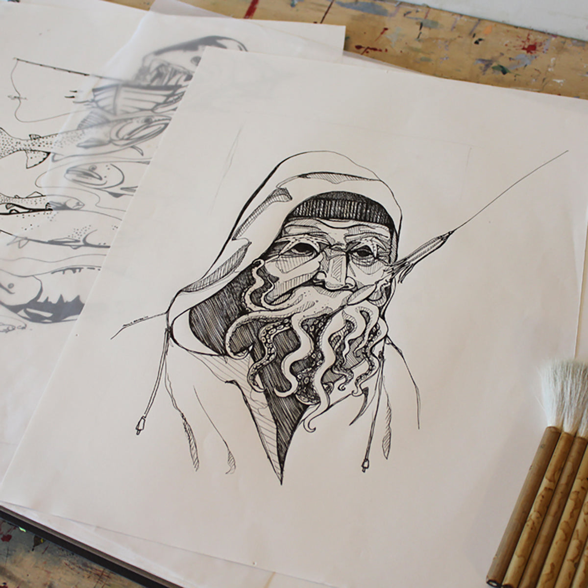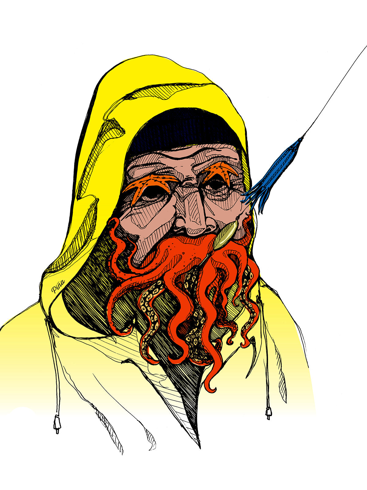 Behold our Old Salty design. This fisherman has been at sea for a long time–he has grown seastar eyebrows and an octopus beard and has a fish lure coming from his mouth. ARRRRRRRrrrrrrrrrrrr ye ready for such a design?