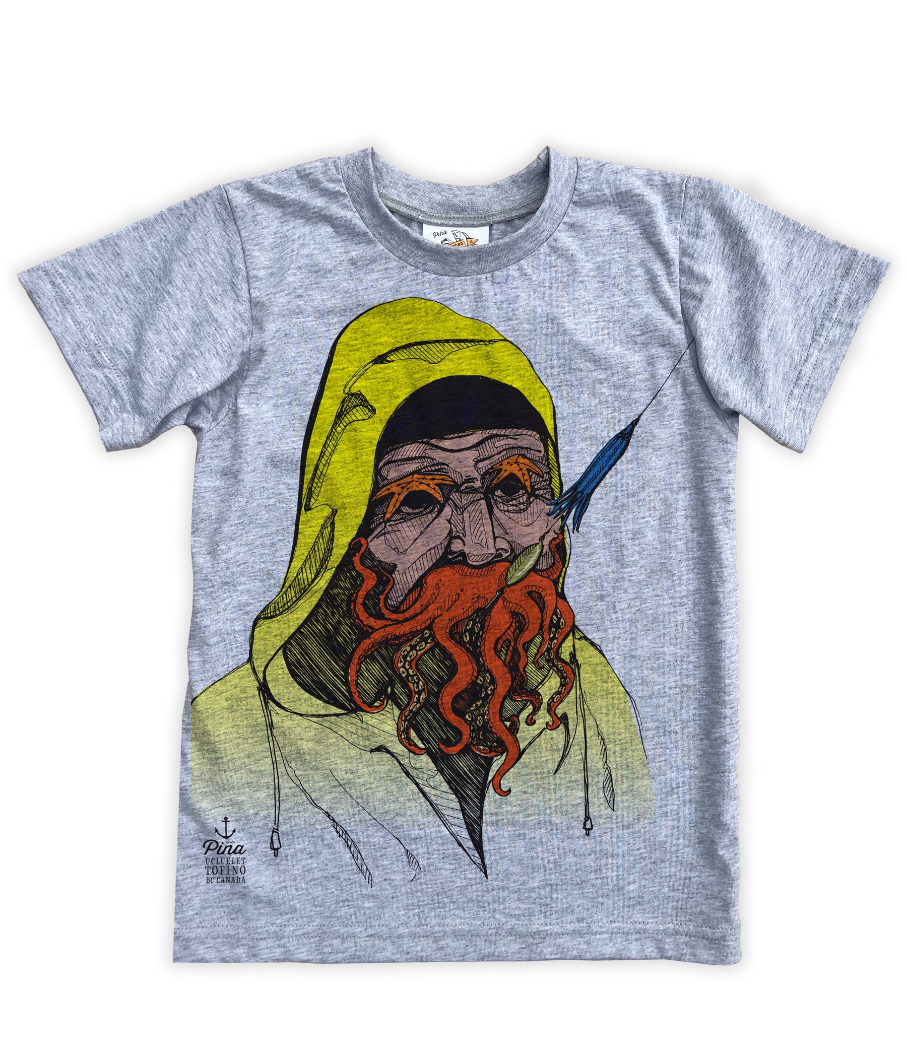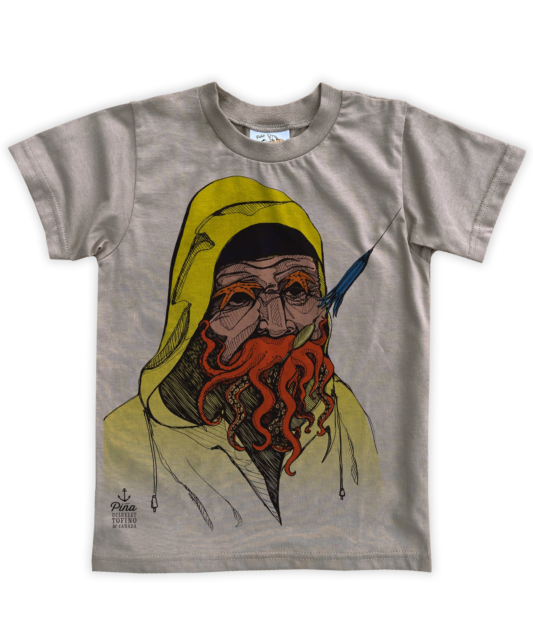 A soft and comfortable kids tee printed with our Old Salty print. This fisherman has been at sea for a long time-he has grown seastar eyebrows and an octopus beard and has a fish lure coming from his mouth. ARRRRRRRrrrrrrrrrrrr ye ready for such a design?