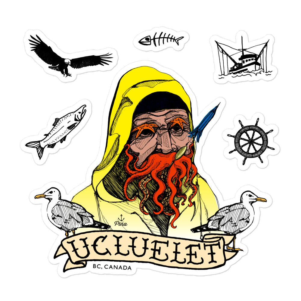 A durable, high opacity vinyl sticker featuring our Old Salty in yellow on the front. This fisherman has been at sea for a long time–he has grown seastar eyebrows and an octopus beard and has a fish lure coming from his mouth. ARRRRRRRrrrrrrrrrrrr ye ready for such a design? Printed with a black ink ship wheel on the back.