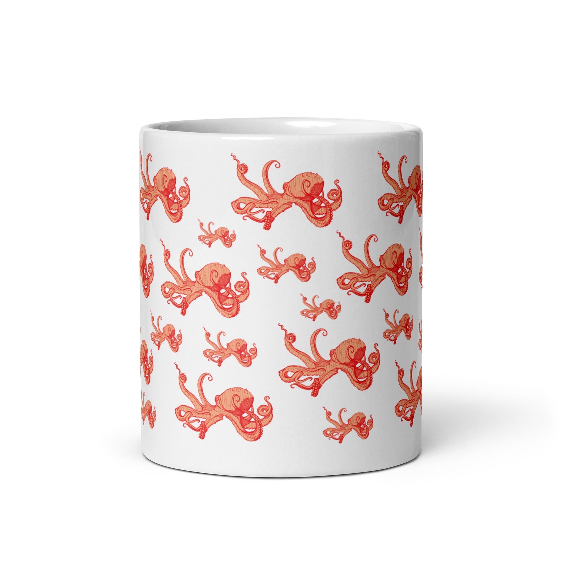 If you are an octopus fan and a lover of hot beverages, this mug is like a warm tentacle-laden hug! Featuring a pattern of orange octopi.