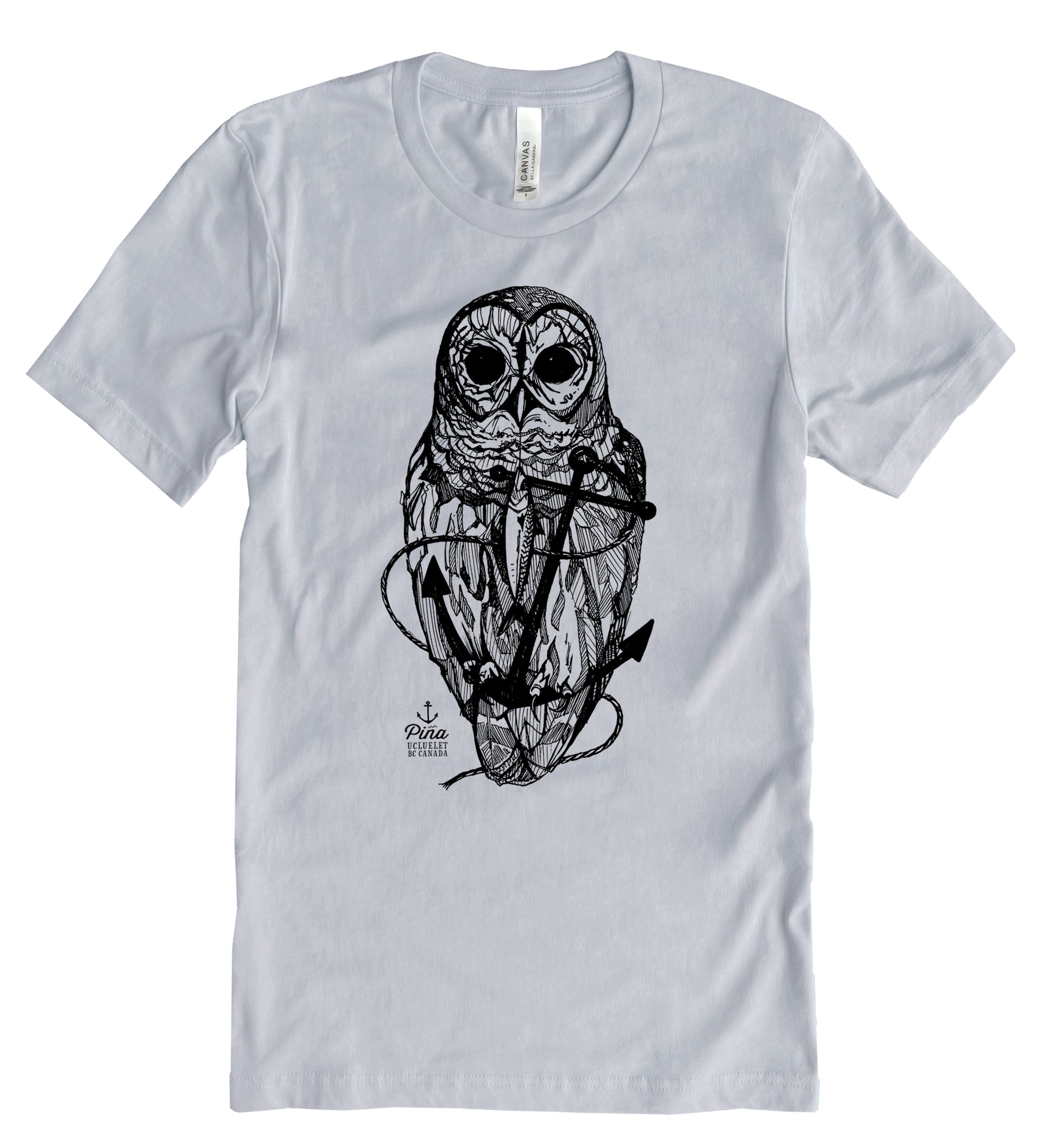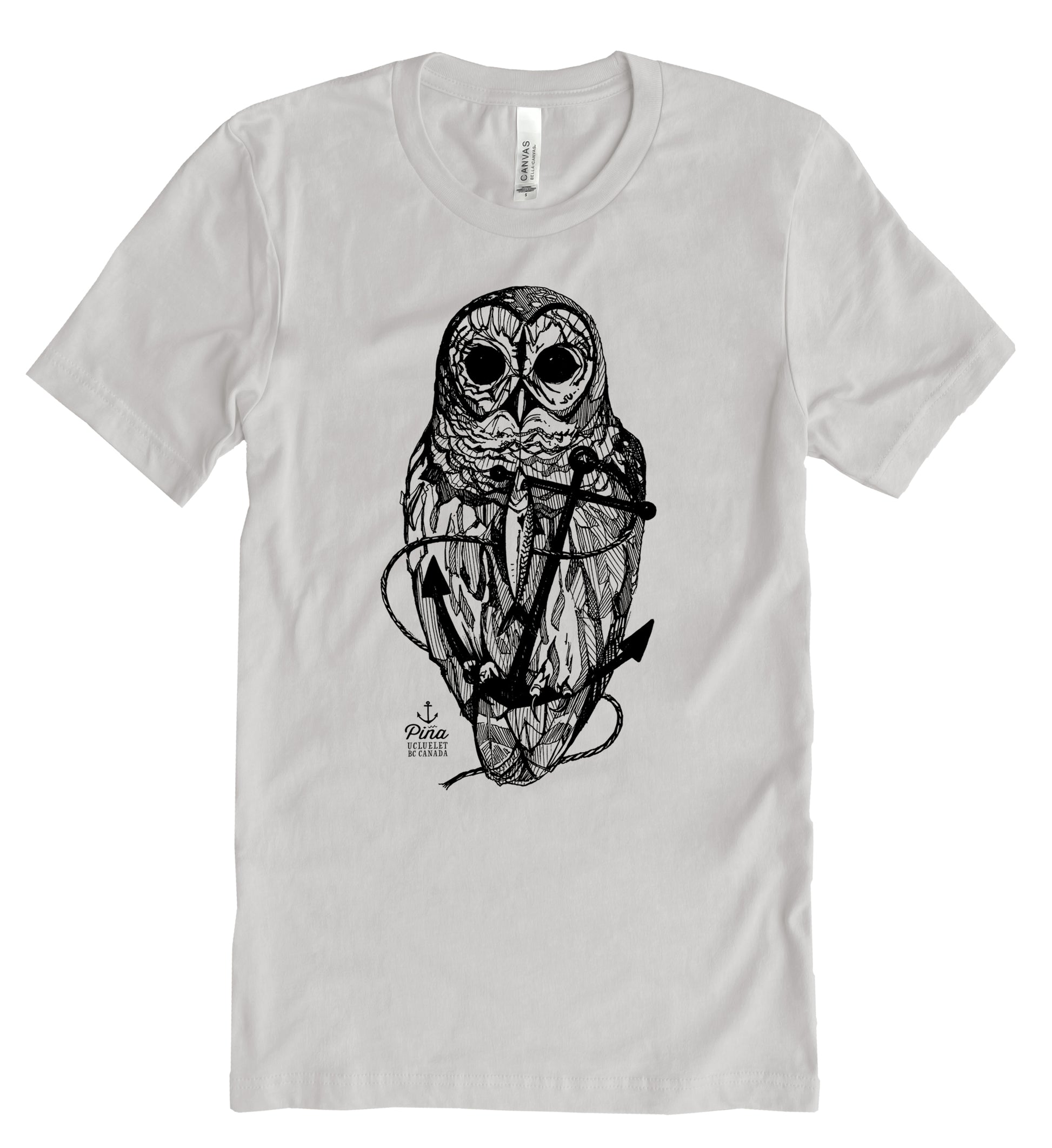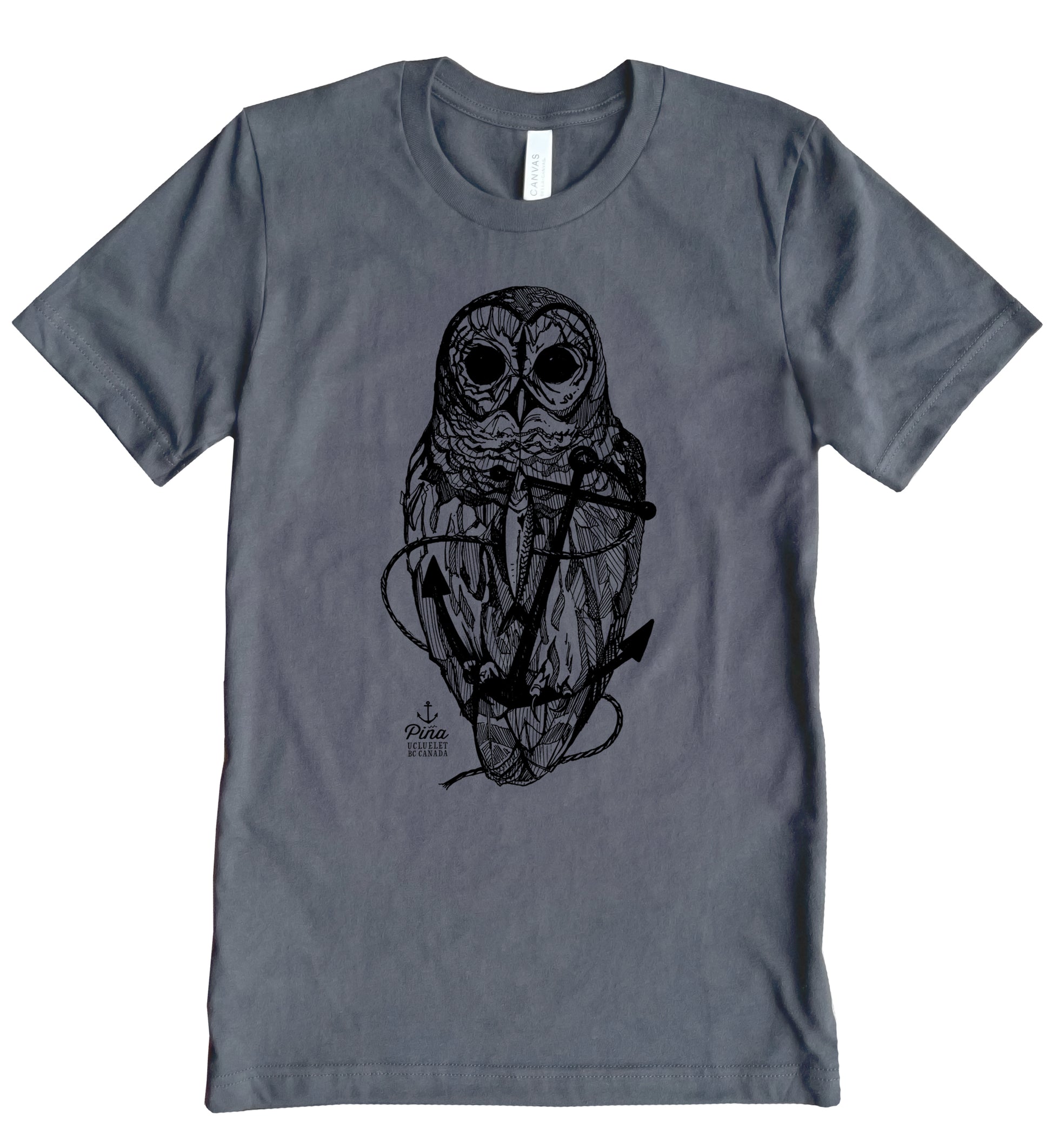 Our Owl and Anchor design printed in black ink on the front of a unisex, cotton jersey t-shirt.