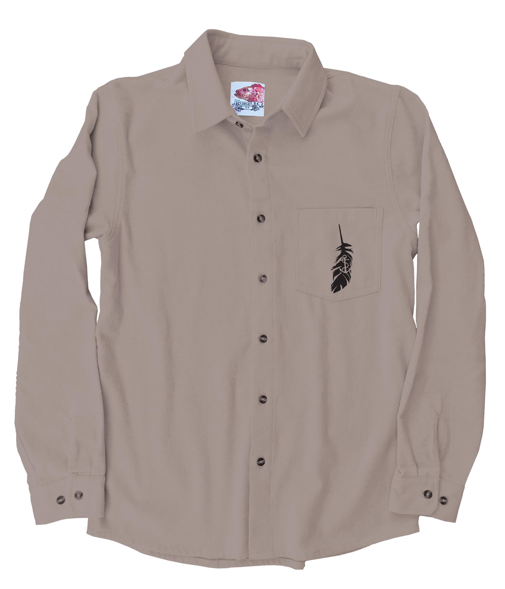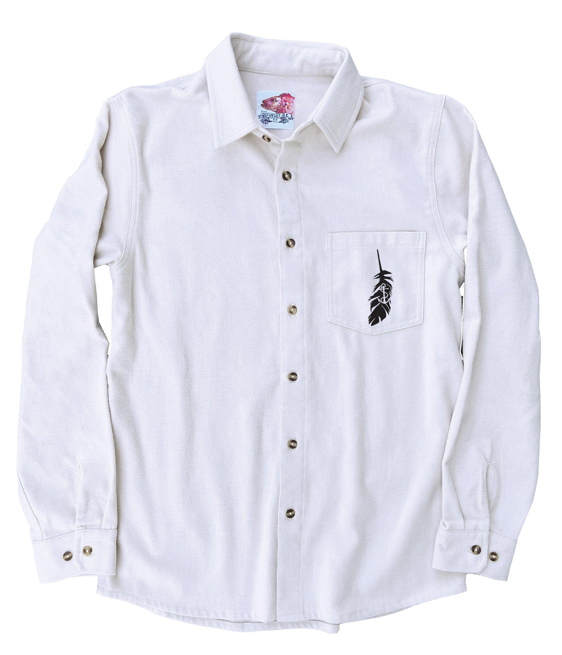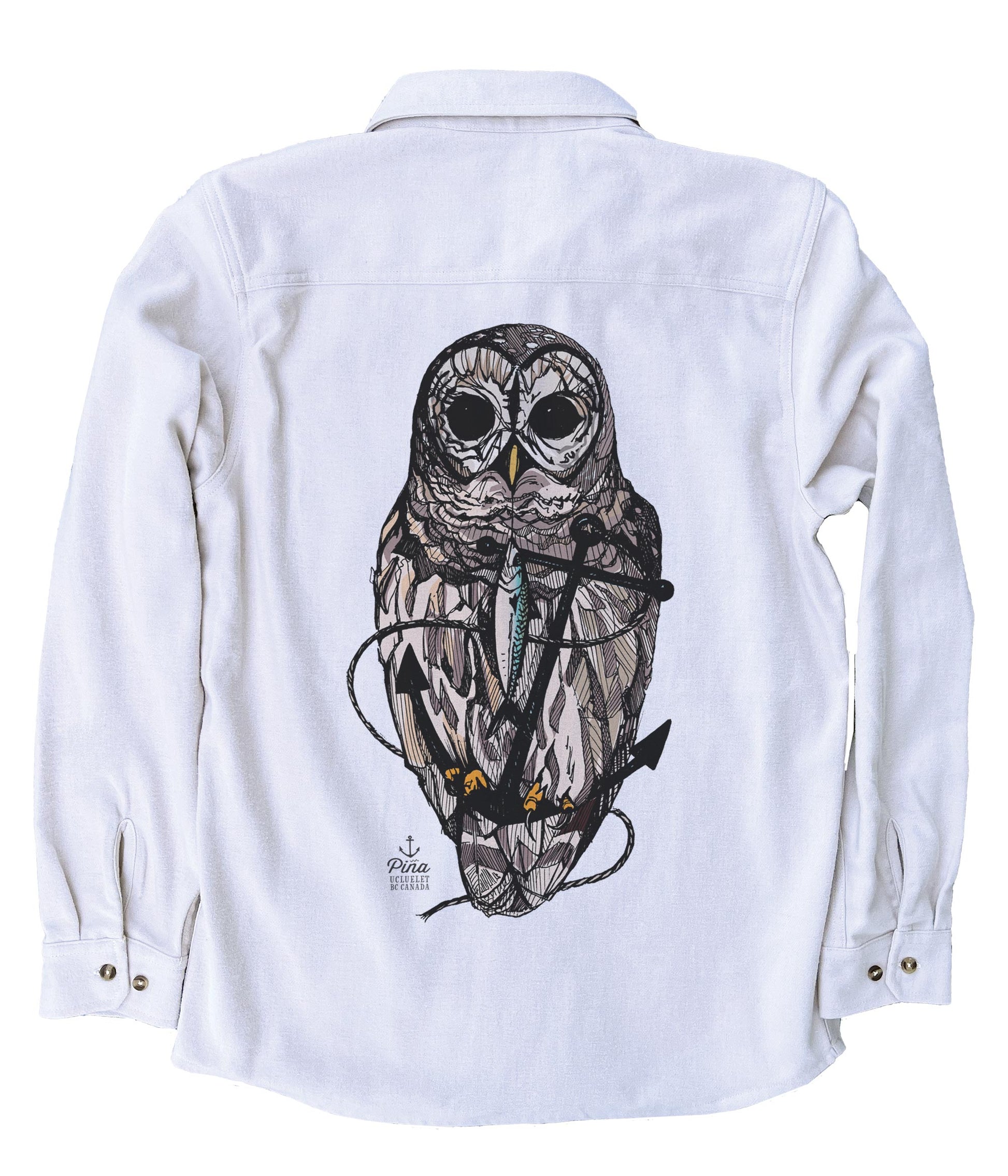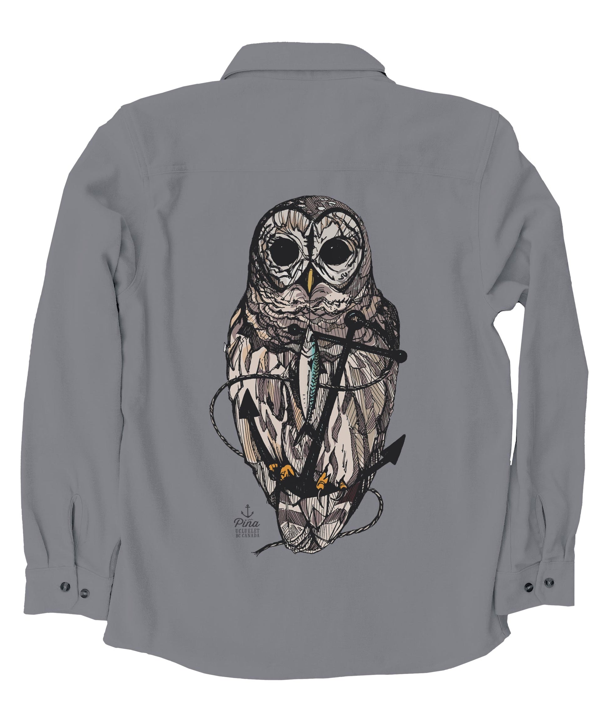 This soft and comfortable unisex flannel is printed with our Owl & Anchor design on the back in colour and an anchor feather on the front pocket. This friend of the night sits on an anchor while gently holding a mackerel which dangles from a thin line.