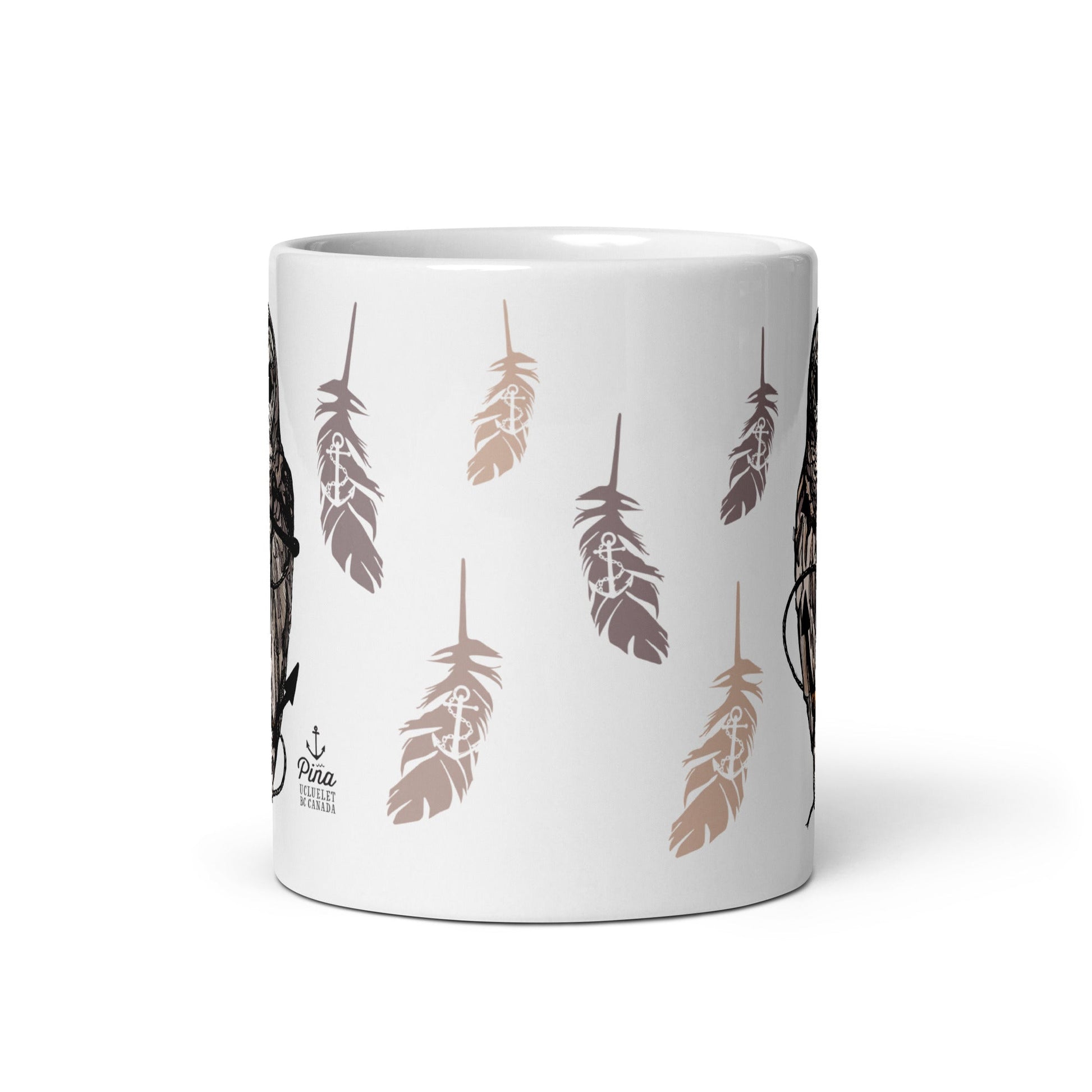 A delightful white ceramic mug printed with our cool Owl & Anchor design and feathers. This friend of the night sits on a black anchor while gently holding a mackerel which dangles from a thin line.