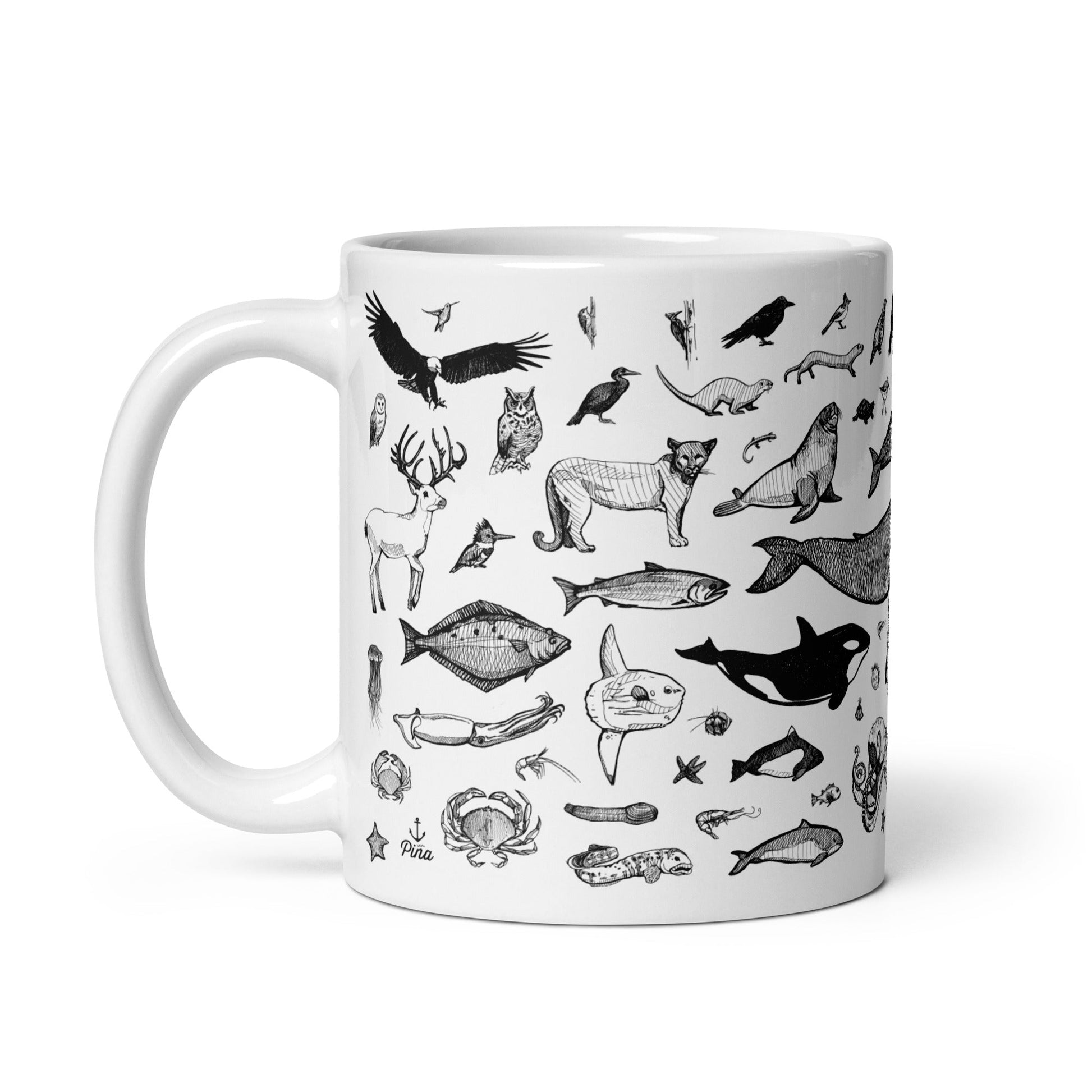 This ceramic mug is the perfect blend of function and elegance. Ideal as a gift or an everyday essential for your dreamy cup of tea. Drift off with the many beautiful animals. Let the blue heron whisper to you as you caress your warm bevy. Let the soaring bald eagle inspire you while the banana slug soothes your soul. Hear the howl of the wolf or the splashing of the octopus as you splash around in your hot cocoa. Lots of animals here to enjoy!