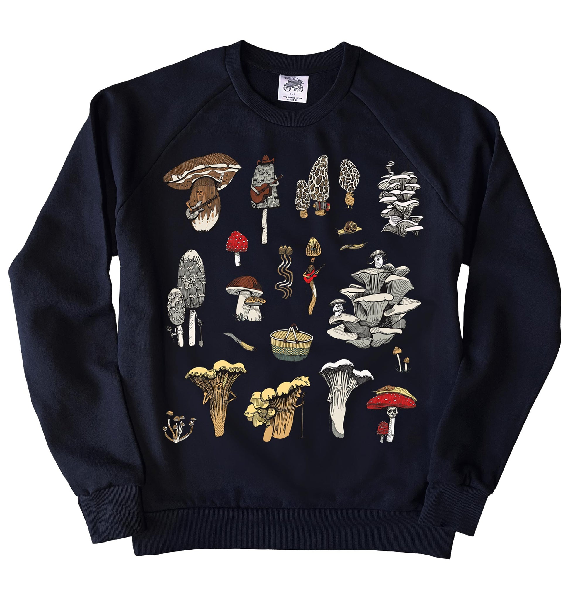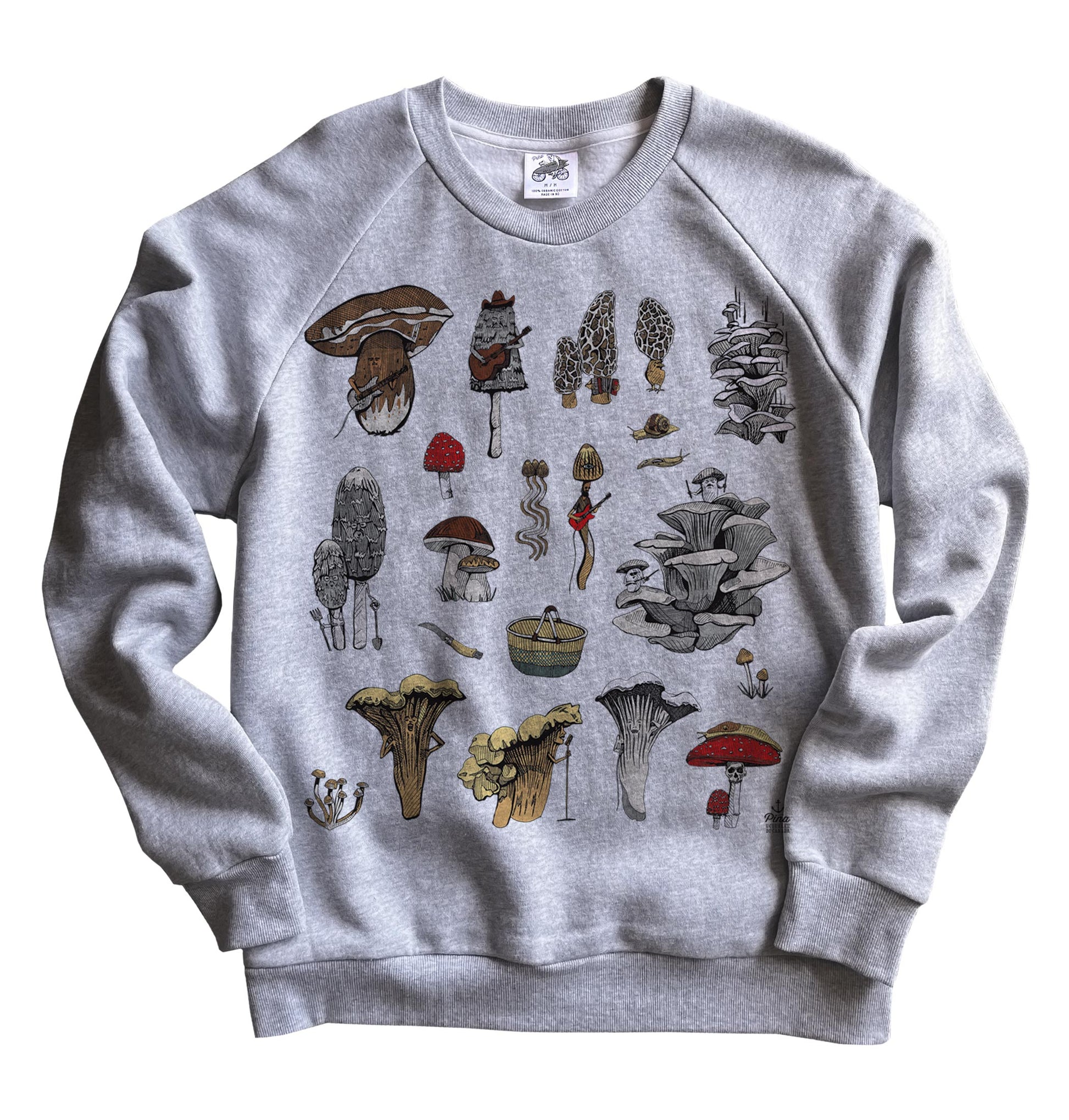 Our full PNW Mushrooms poster printed in full colour on the front of a unisex crewneck sweatshirt.
