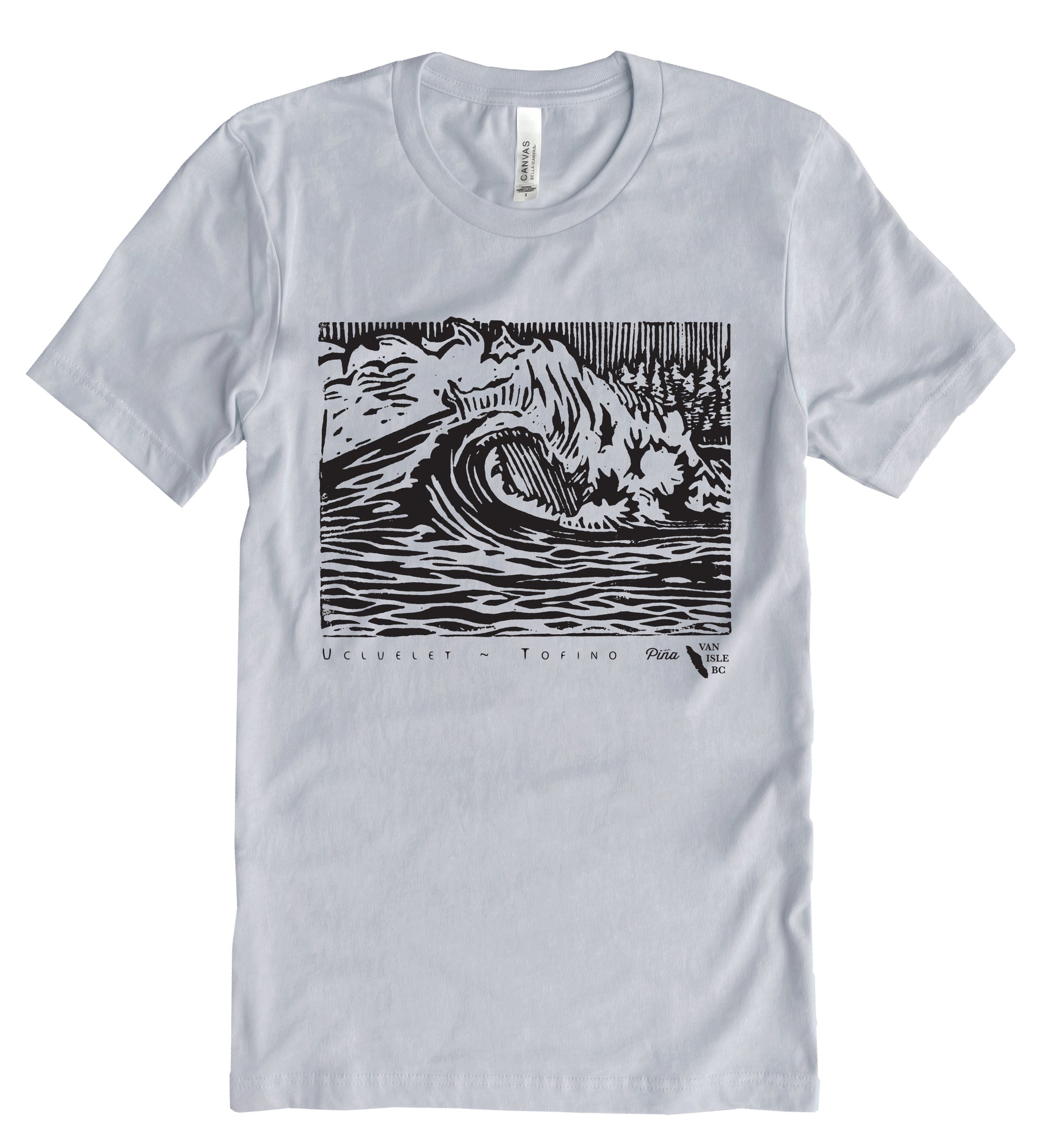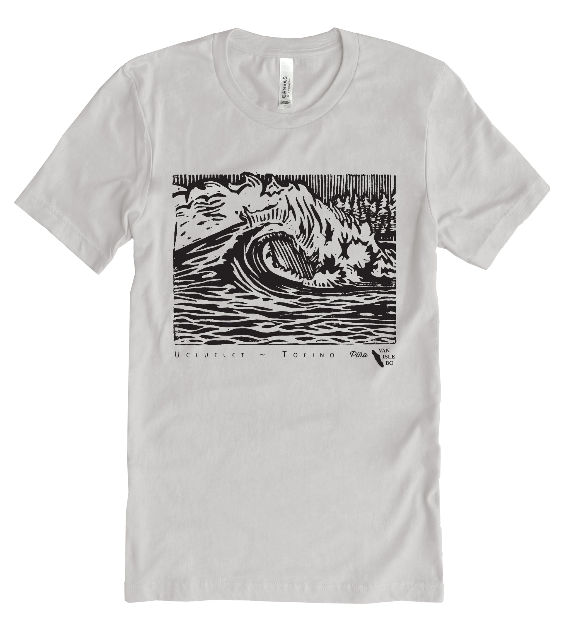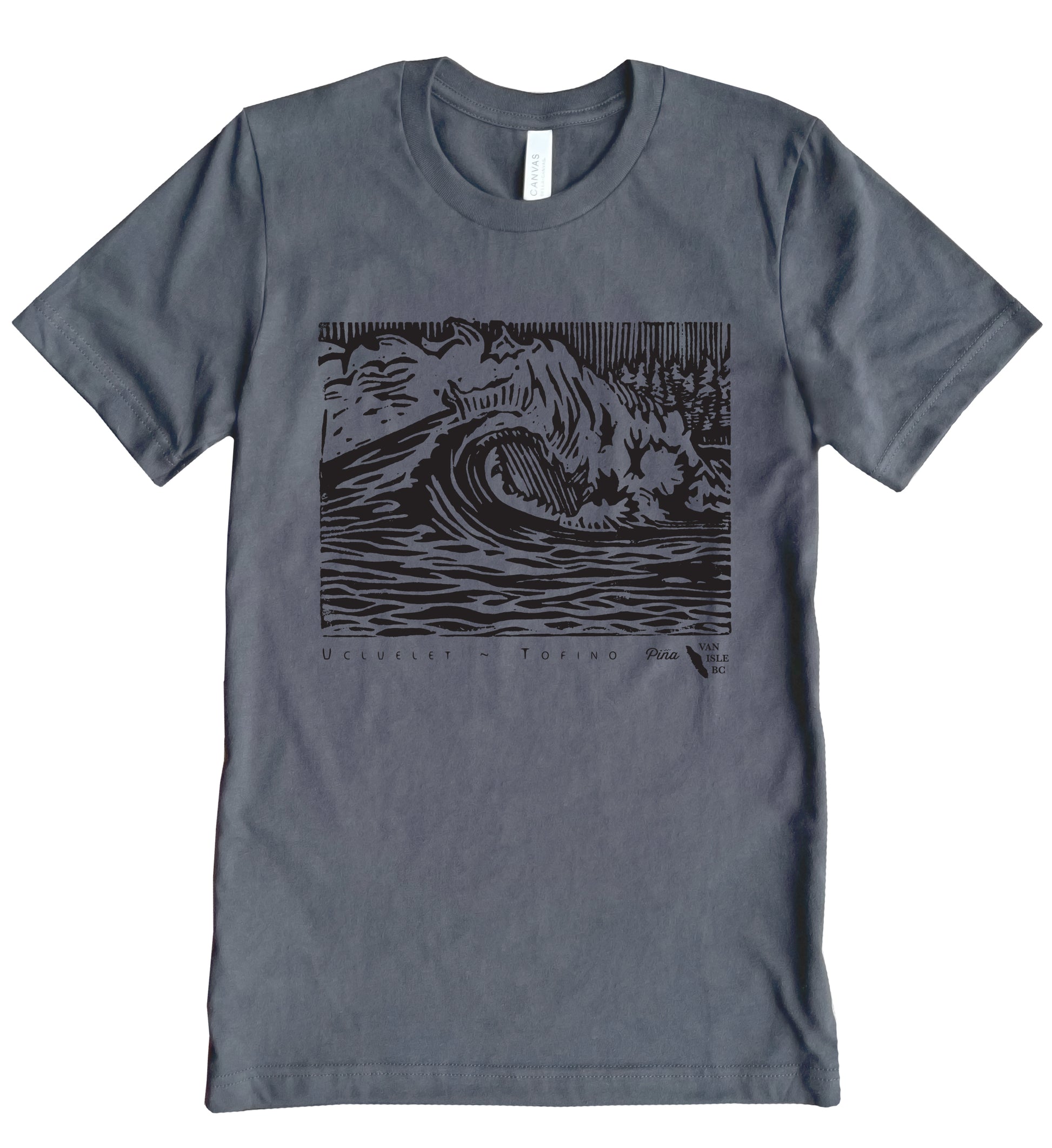 Our PNW Wave print in black ink on the front of a unisex, cotton jersey t-shirt.