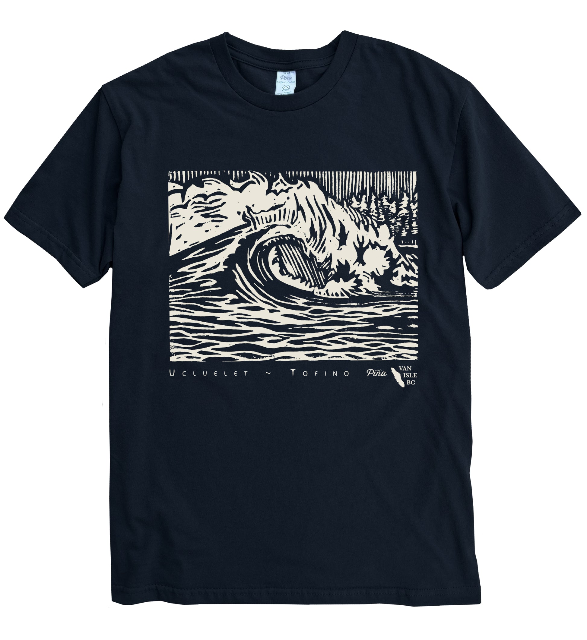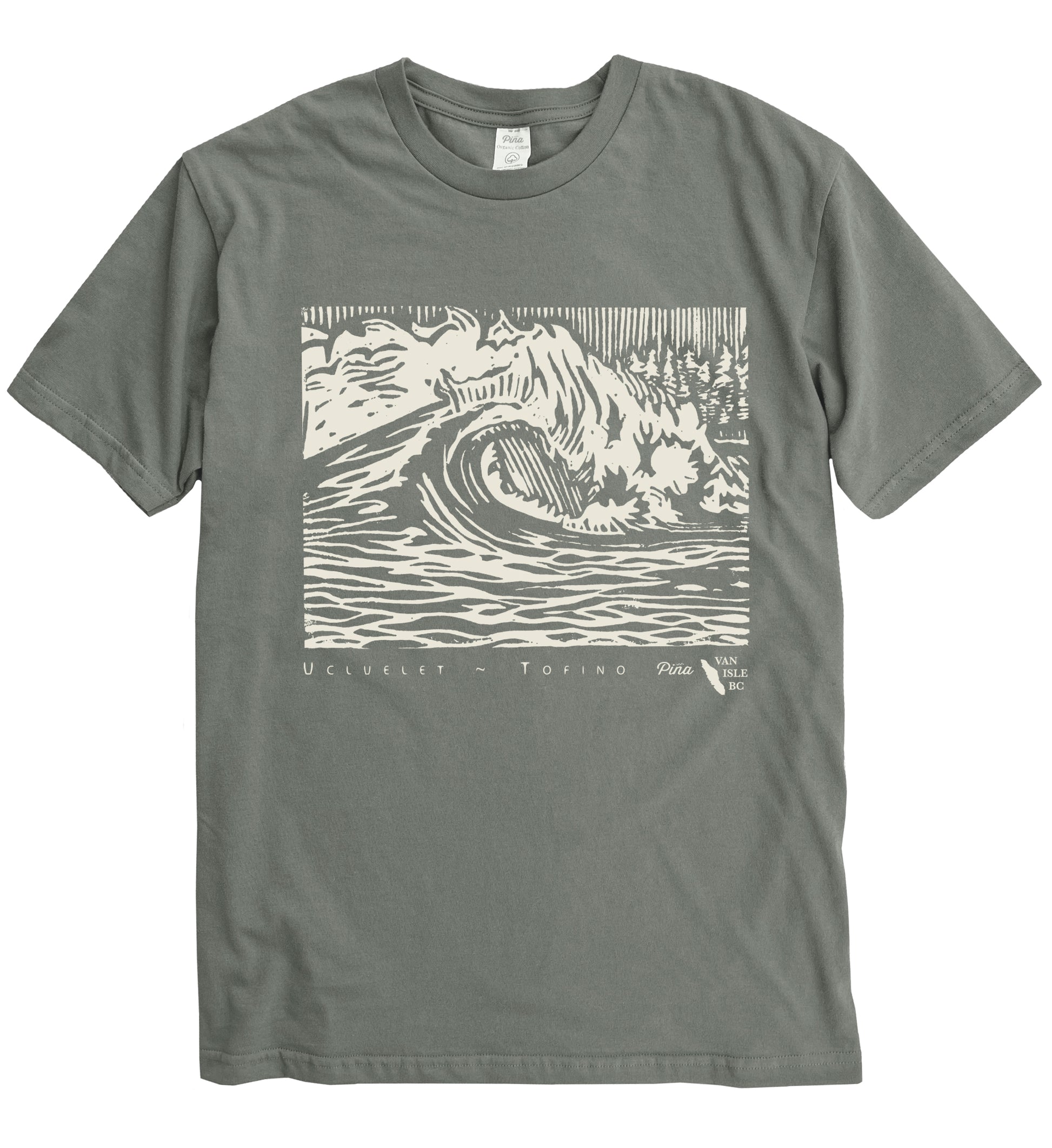 Our PNW Wave design printed in cream-coloured ink on the front of a unisex organic cotton tee.