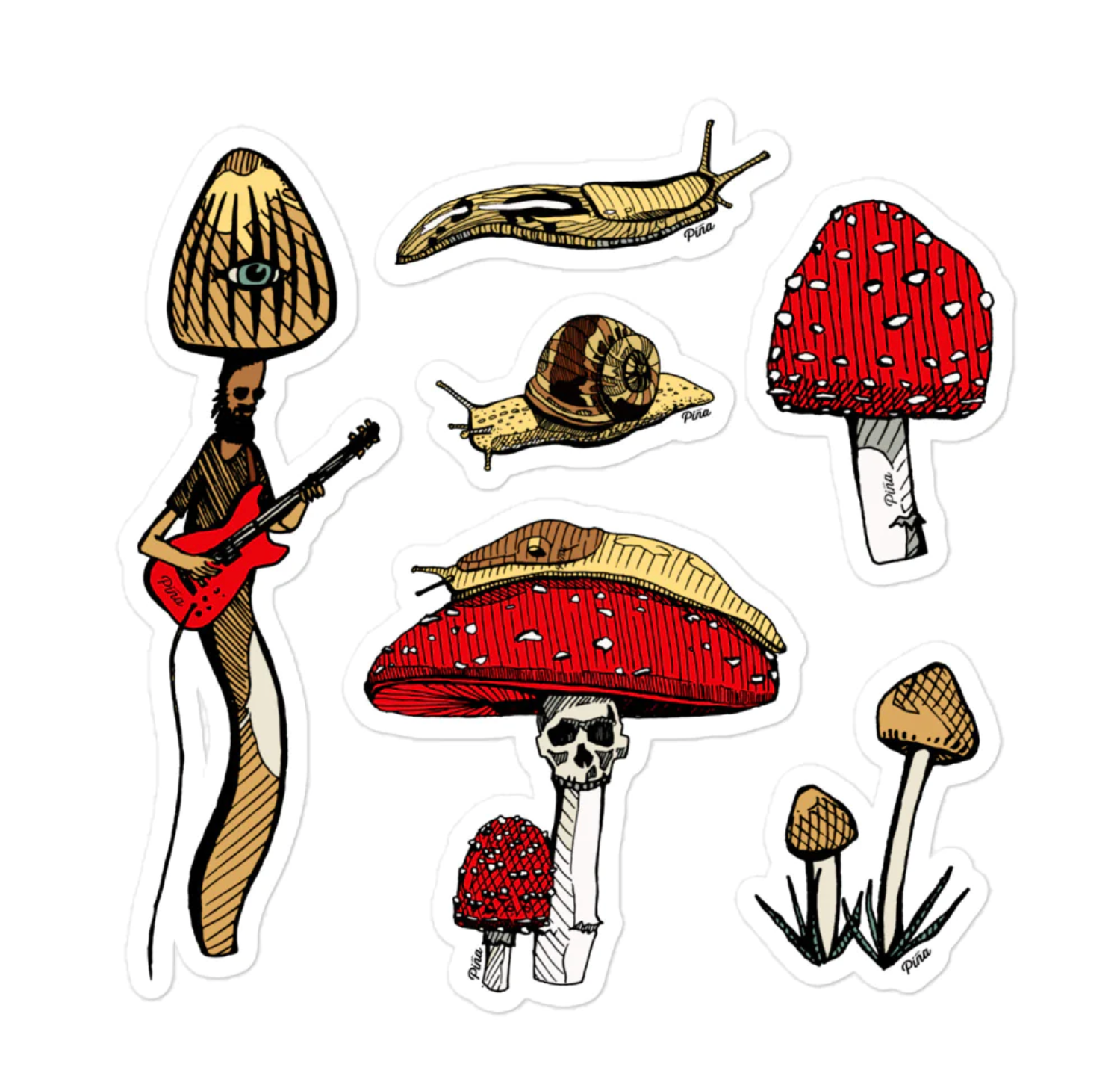 These stickers are printed on durable, high opacity adhesive vinyl 5x5 sheet. Contains 6 super awesome stickers including amanita mushrooms, a snail, a banana slug, and some groovin' psilocybins.