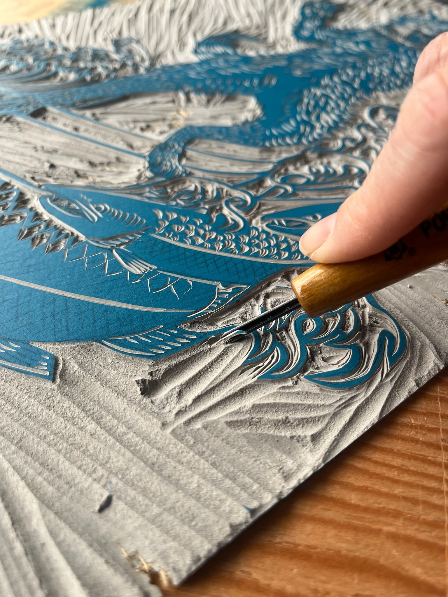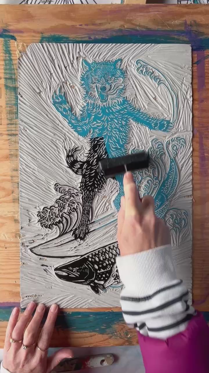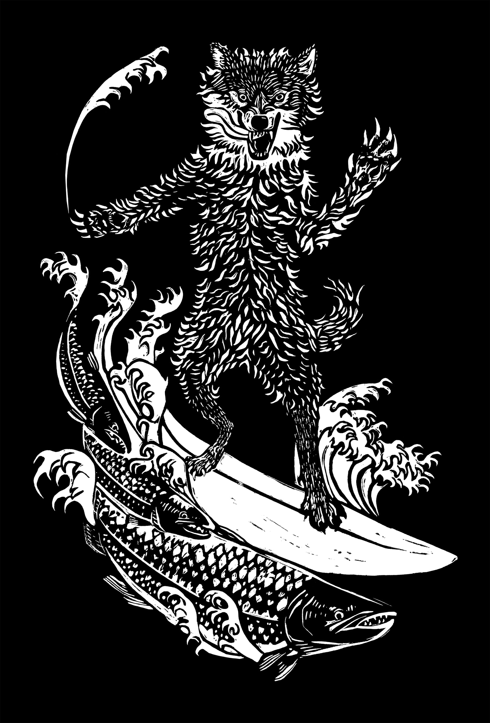 Behold the salty Seawolf–a highly detailed linocut print with ocean details inspired by the famous Hokusai Great Wave print. AAWWWwwooooooo!