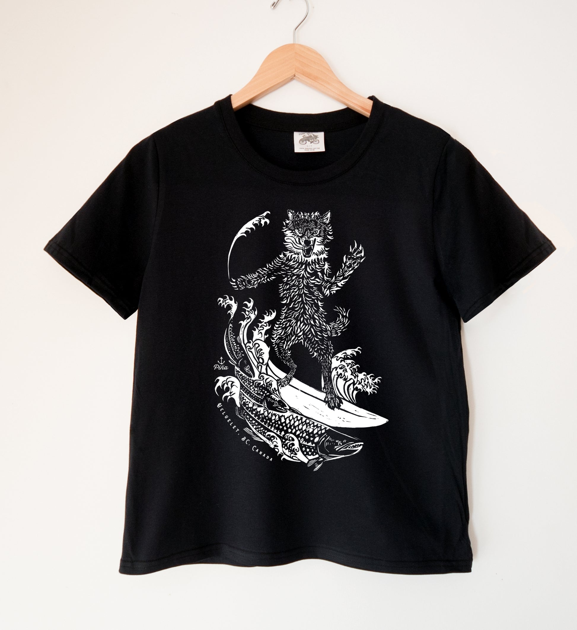 Our Seawolf linocut design printed in white ink on the front of a 100% organic cotton ladies tee. This is a flattering, fitted, boxy tee–designed by us and manufactured in Canada.