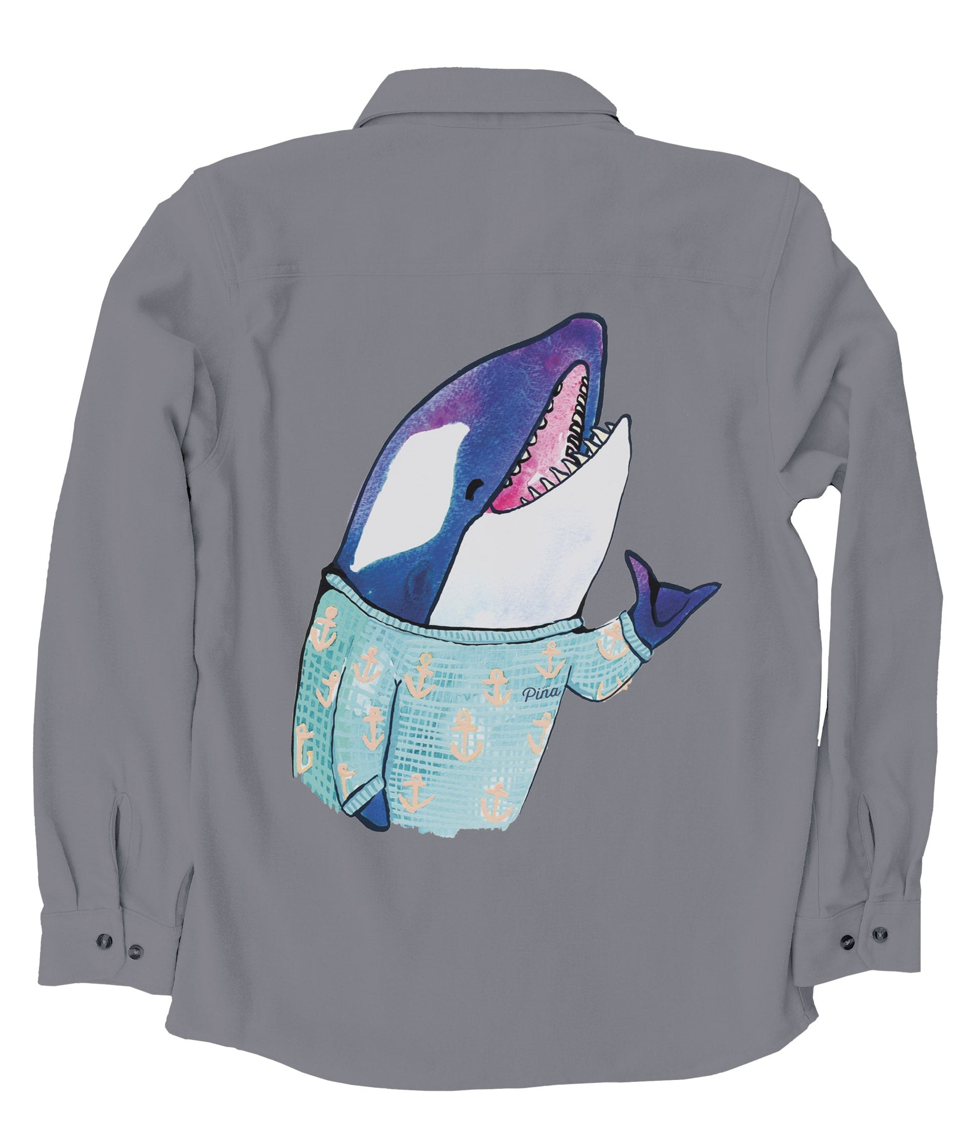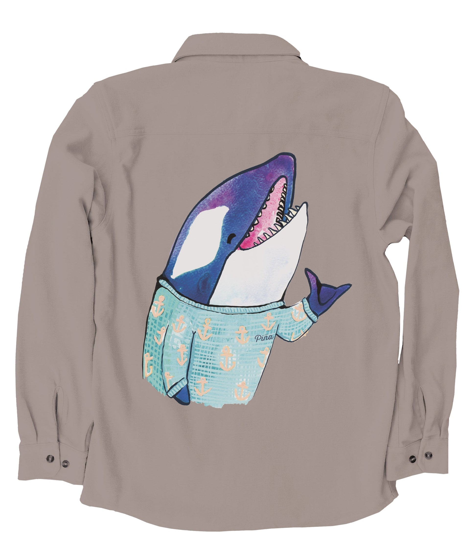 This soft and comfortable unisex flannel is printed with our Shaka Brah Orca design on the back and a ship wheel on the front pocket. Hang loose with this chiller whale.