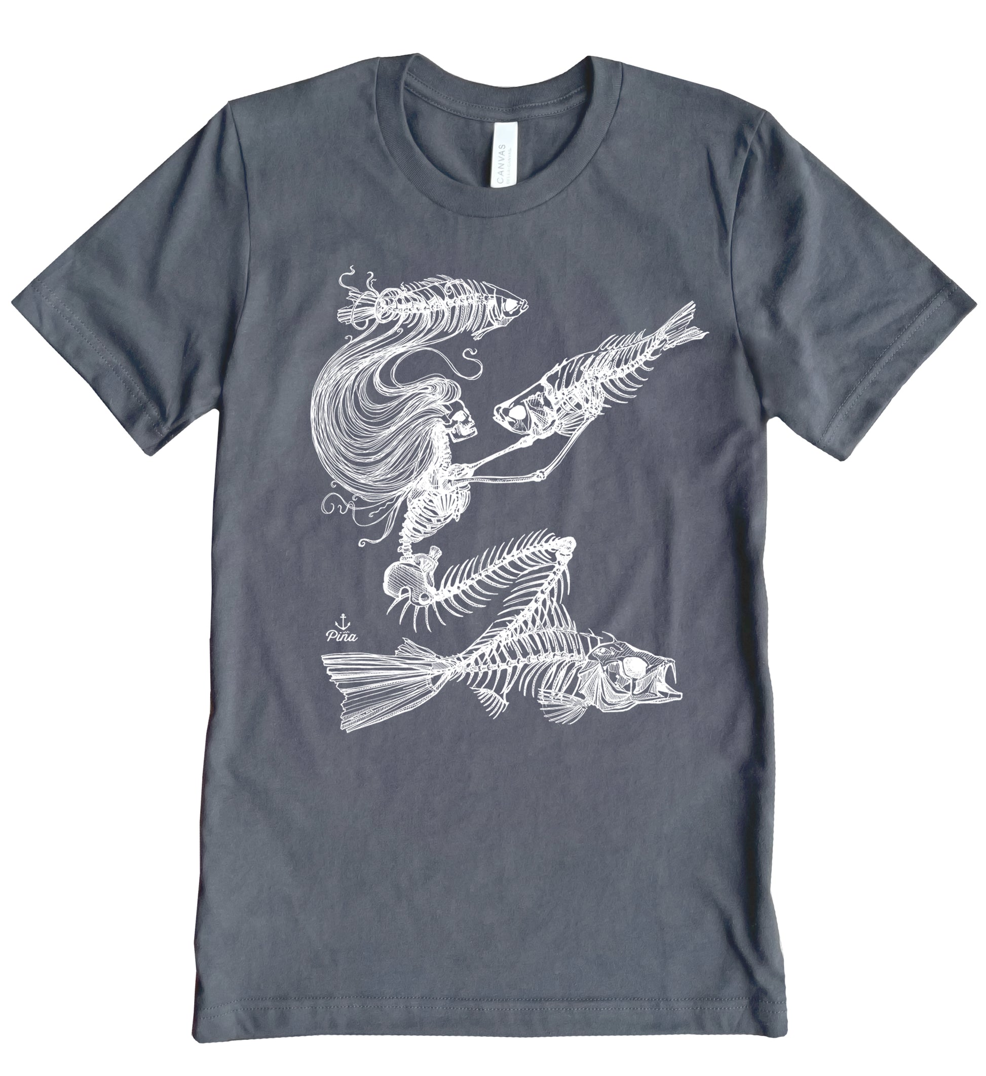 Our Skeleton Mermaid design printed in white ink on the front of a unisex, cotton jersey t-shirt.