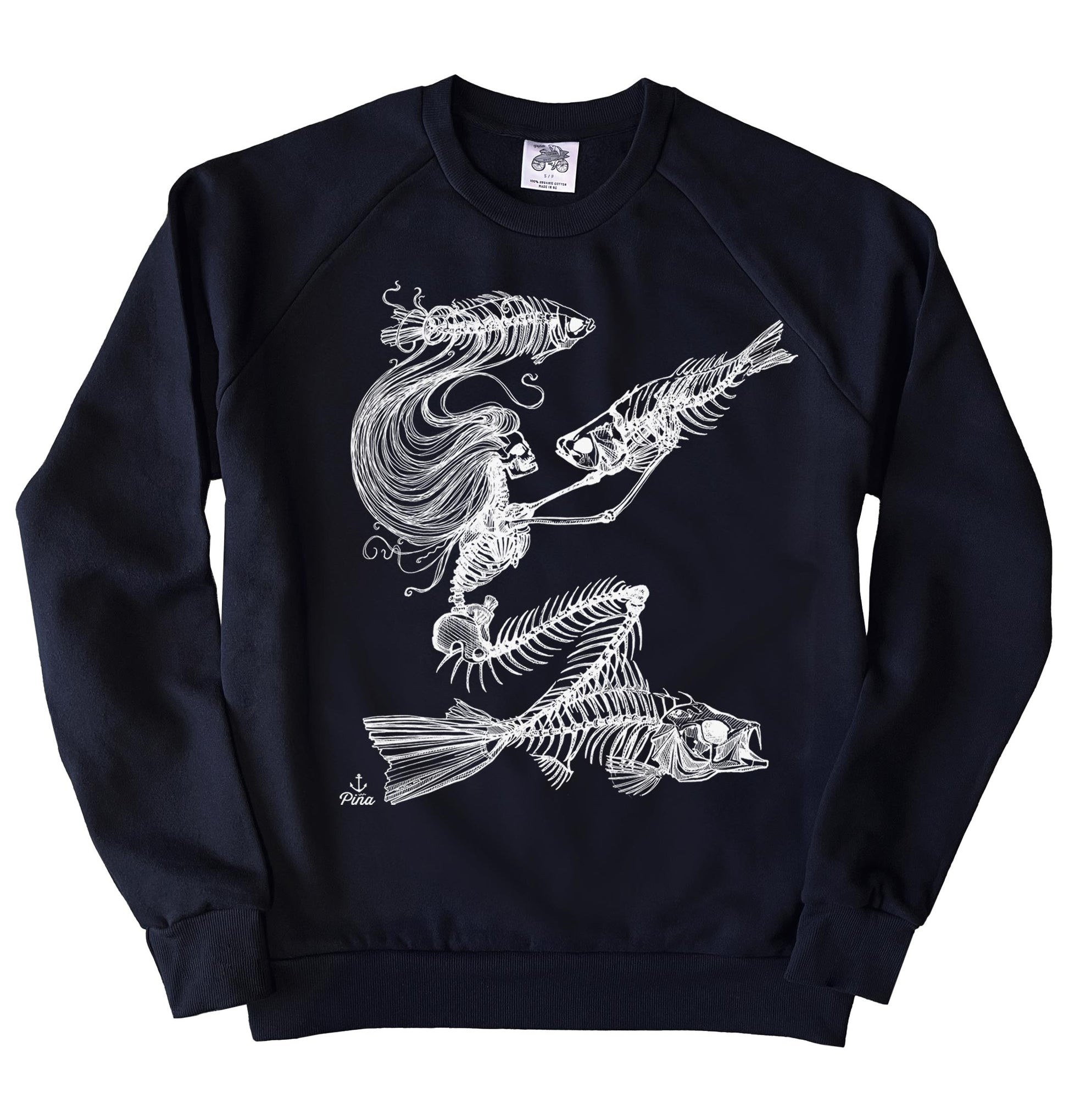 Our Skeleton Mermaid printed in white ink on the front of a unisex crewneck sweatshirt.