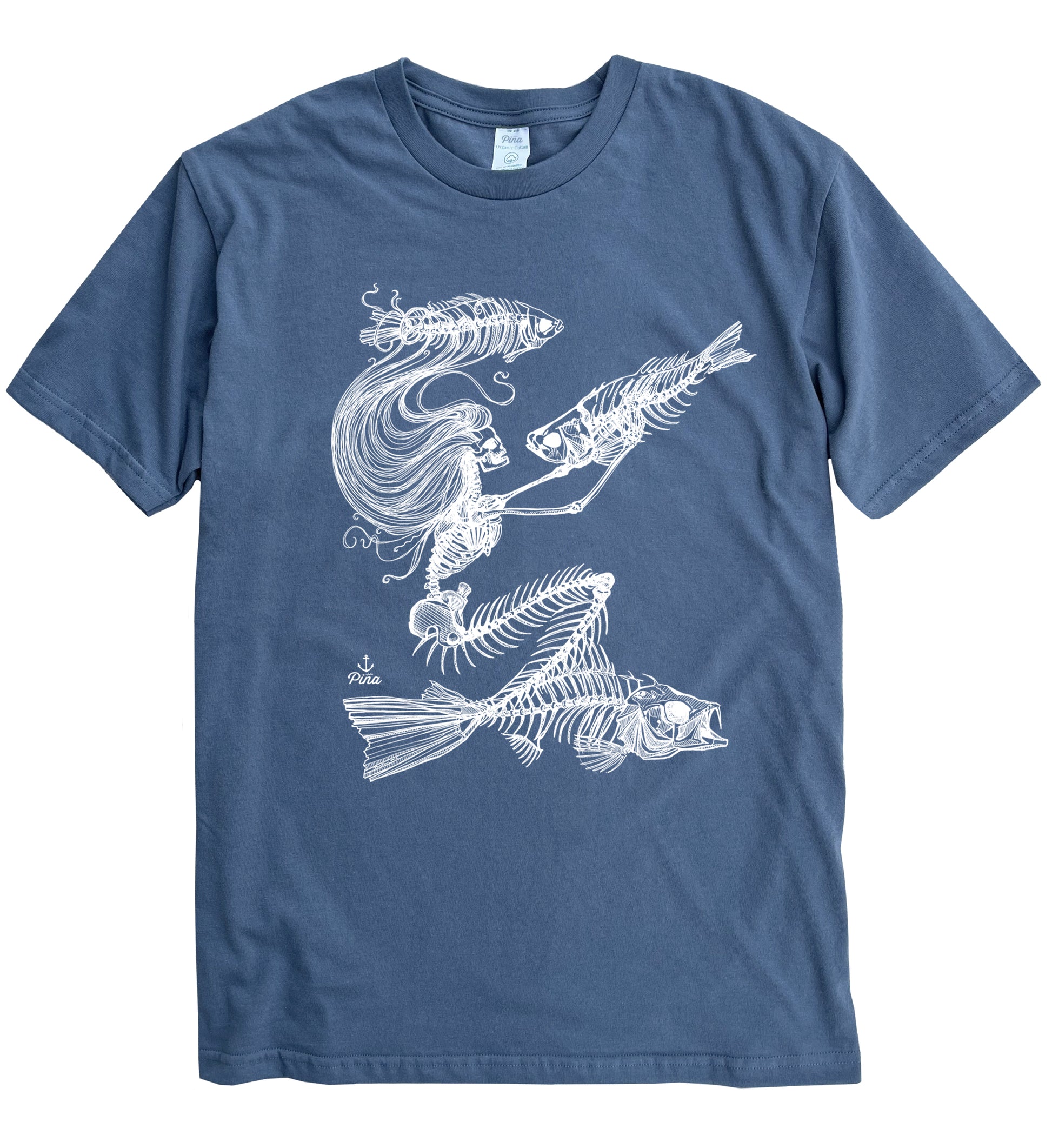 Our Skeleton Mermaid design printed in white ink on the front of a 100% organic cotton unisex tee. This crewneck t-shirt is soft and comfortable with a flattering fit. Each shirt is made in Canada then custom printed by us in Ucluelet, just for you!