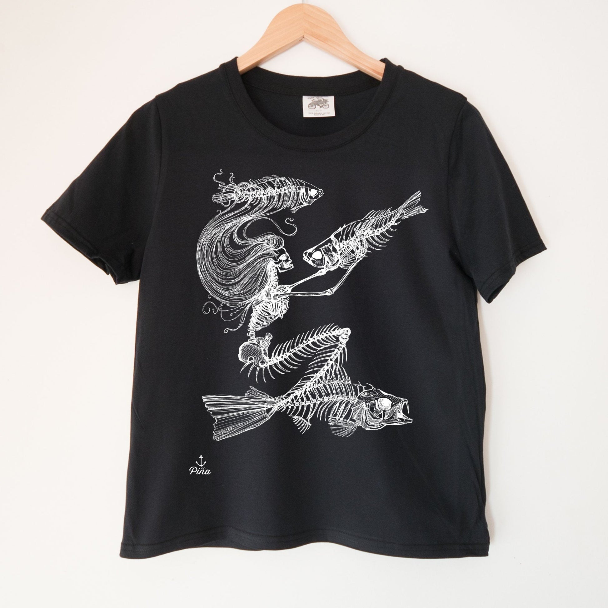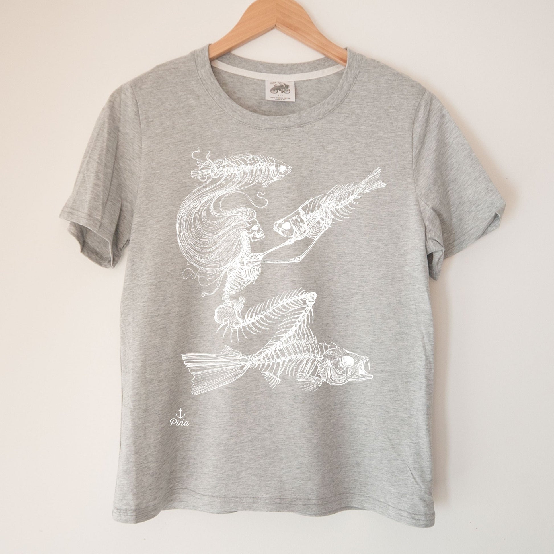 A soft and comfortable organic cotton ladies tee printed with our popular Skeleton Mermaid design on the front. This post-death beauty plays with her skeleton cod friends in this underwater dream. Drawn with exquisite detail and soft gestural lines, this bold piece of art captures the essence of a feminine pin up with the edge of structured bones.