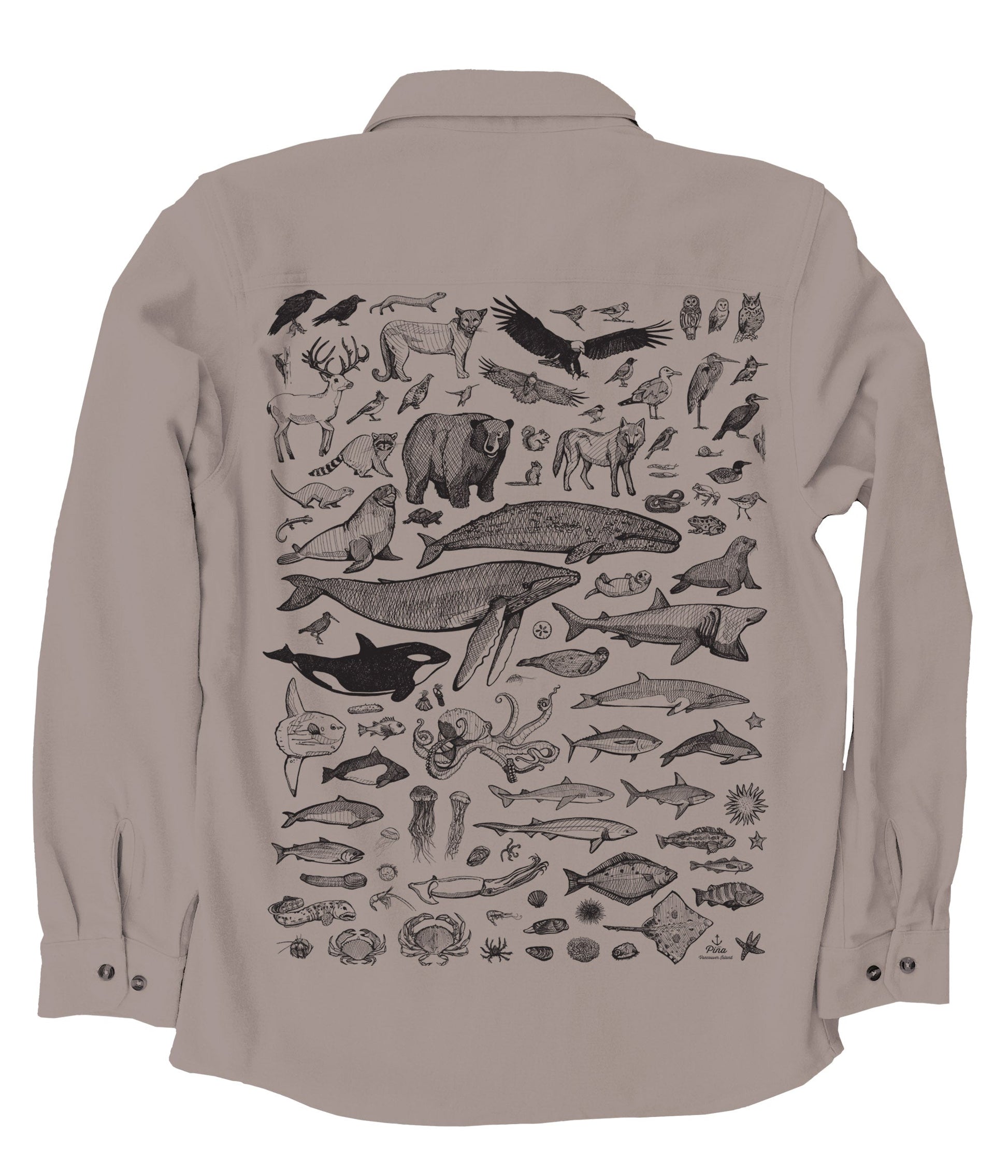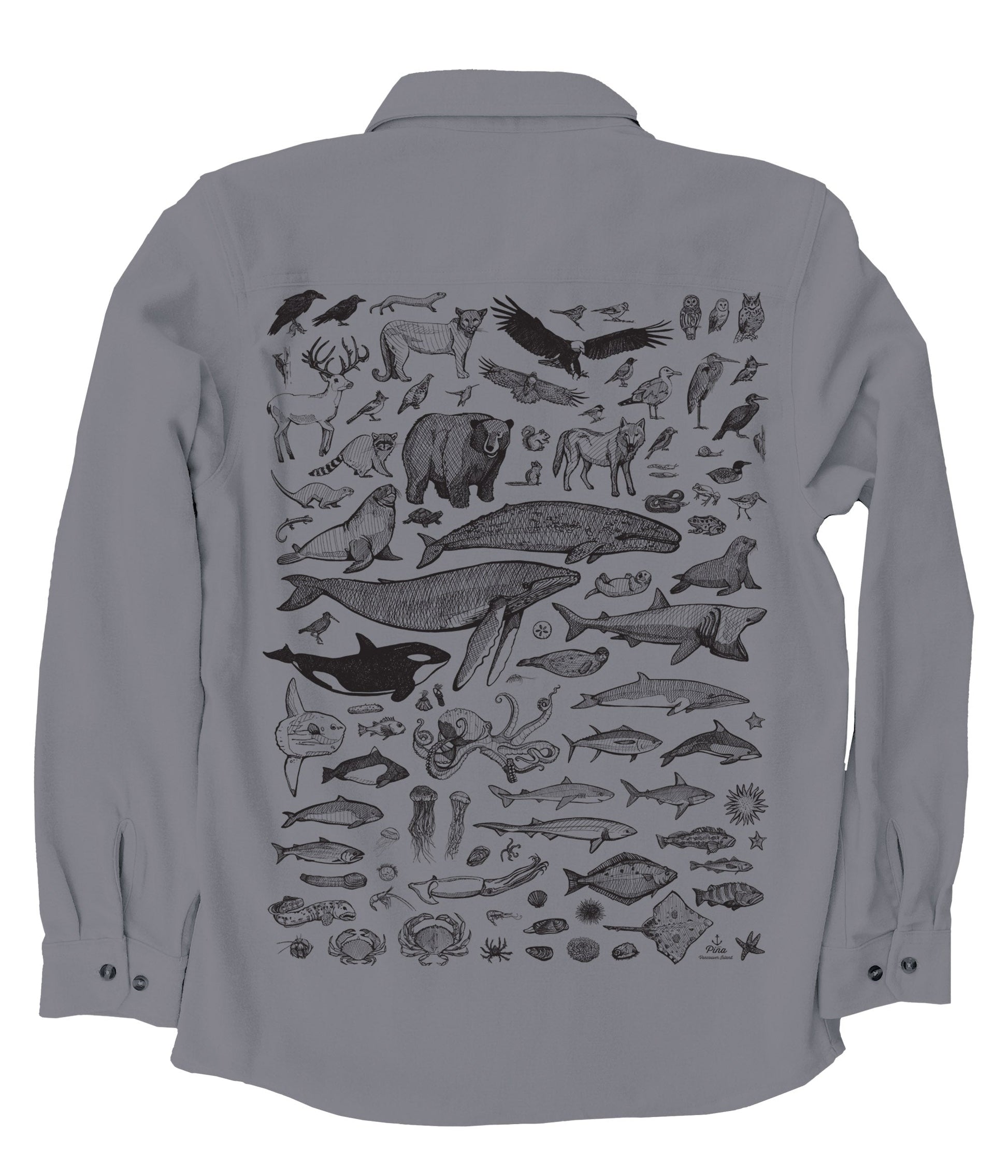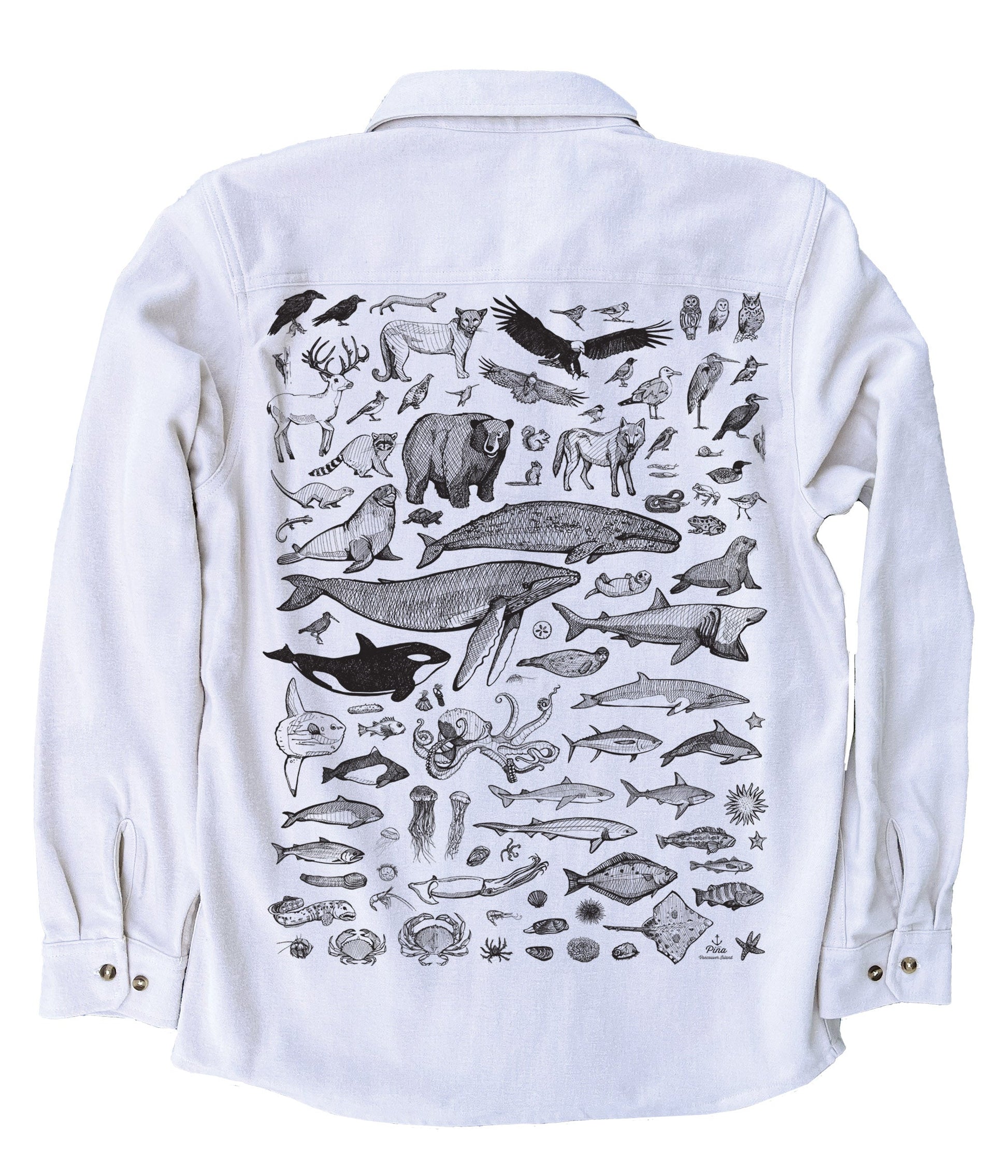This soft and comfortable unisex flannel is printed with our Species of Ucluelet Poster in black ink on the back. This poster includes 96 of our favourite Pacific Northwest creatures from the soaring bald eagle to the slimy banana slug to the soft, swimming squid. Behold the beautiful black bear, the darling deer and the clambering crabs–an animal lovers delight.