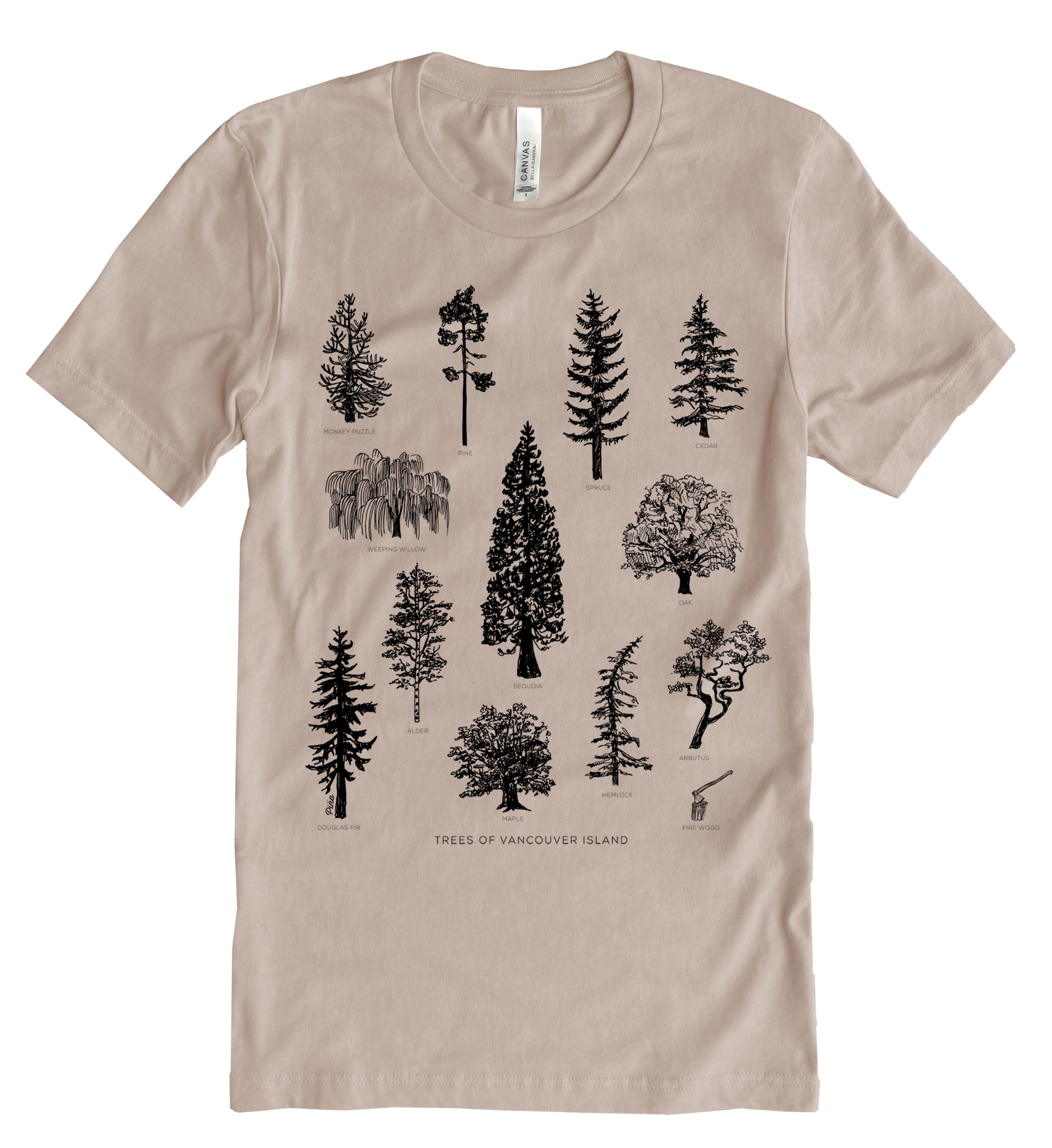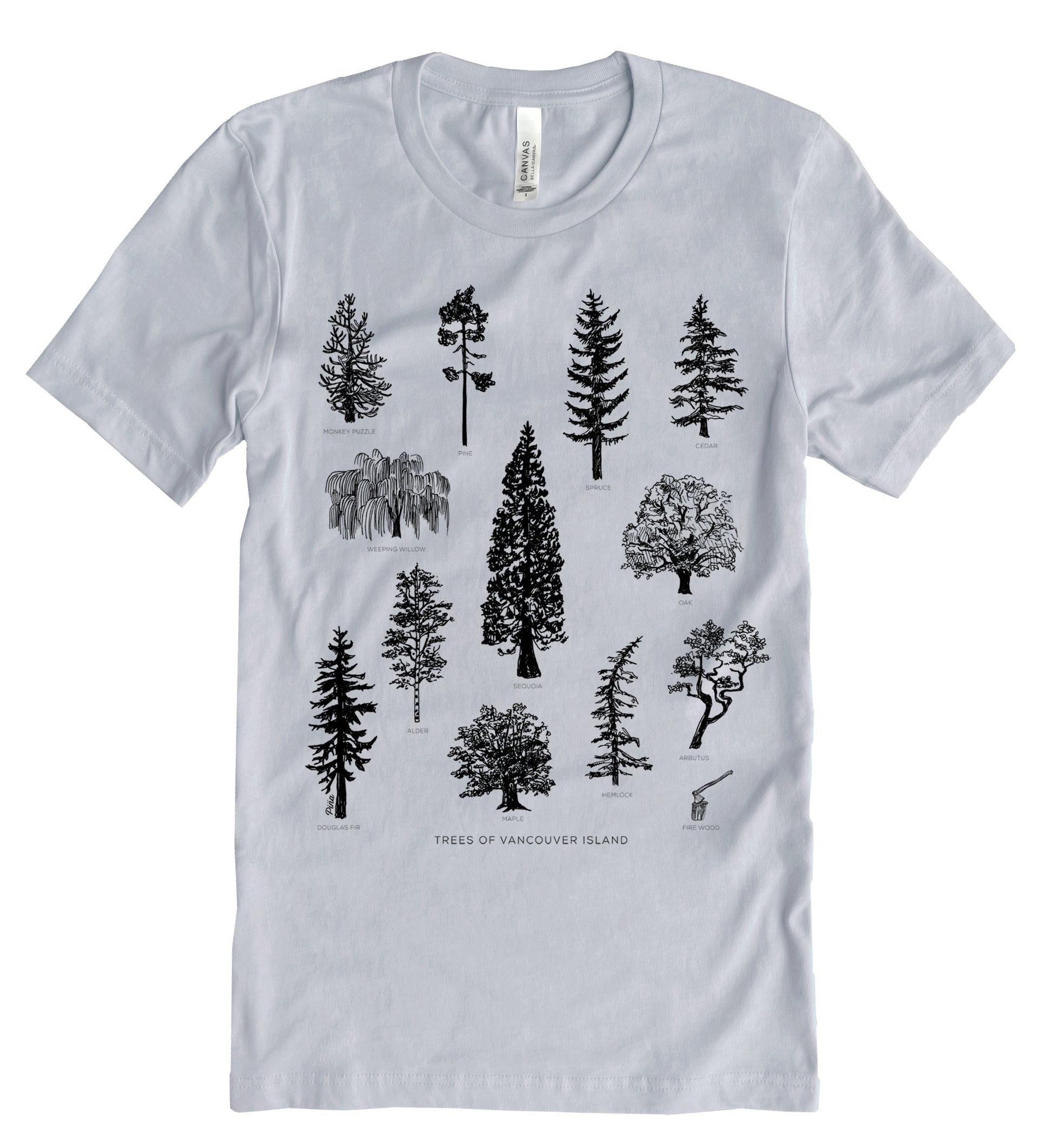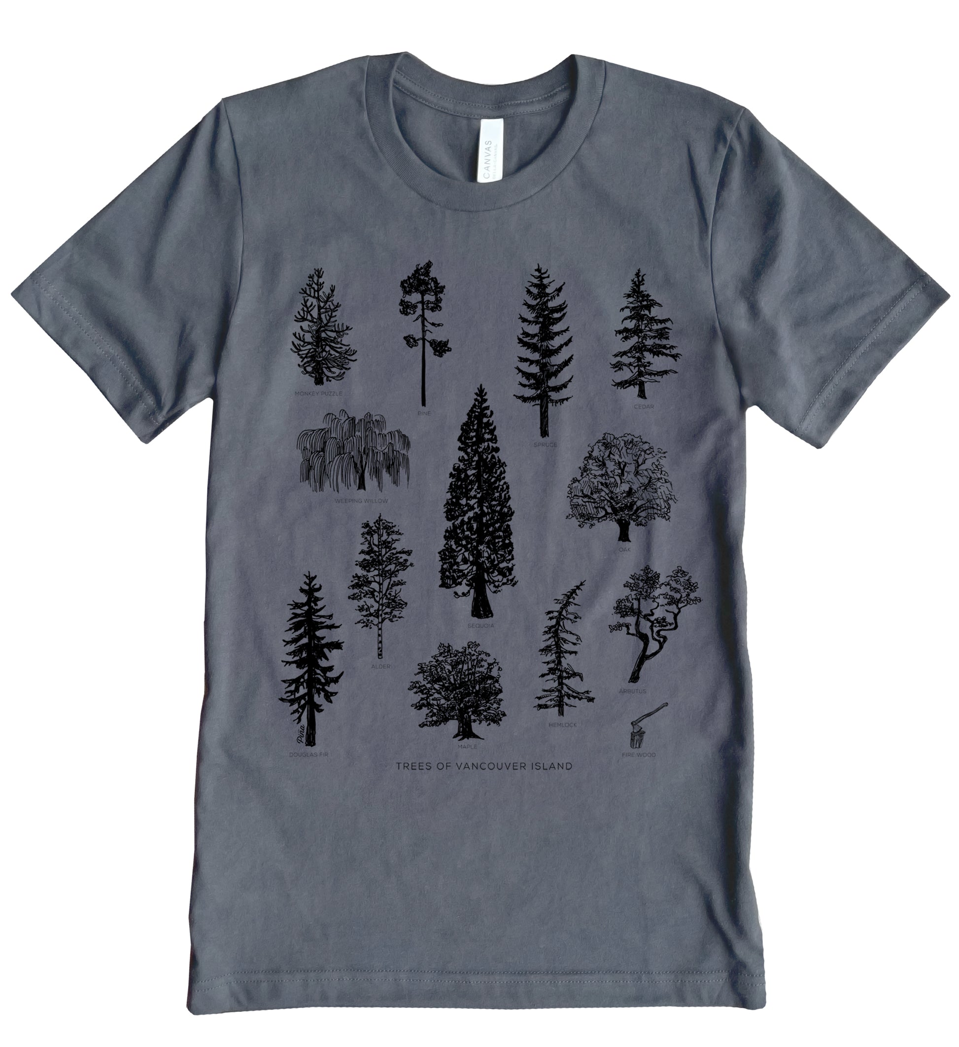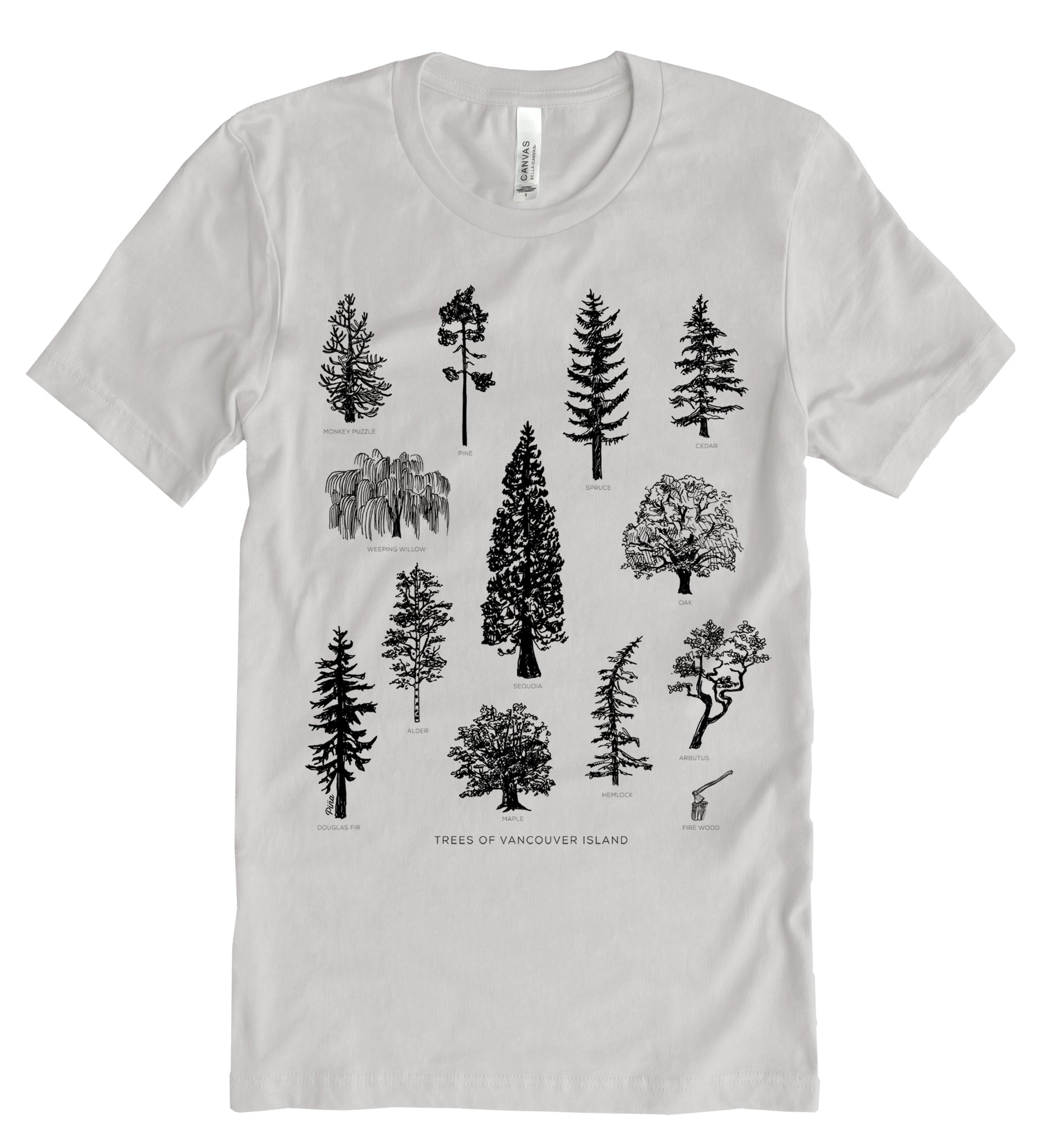 Our Tree Species of Vancouver Island design printed in black ink on the front of a unisex, cotton jersey t-shirt.
