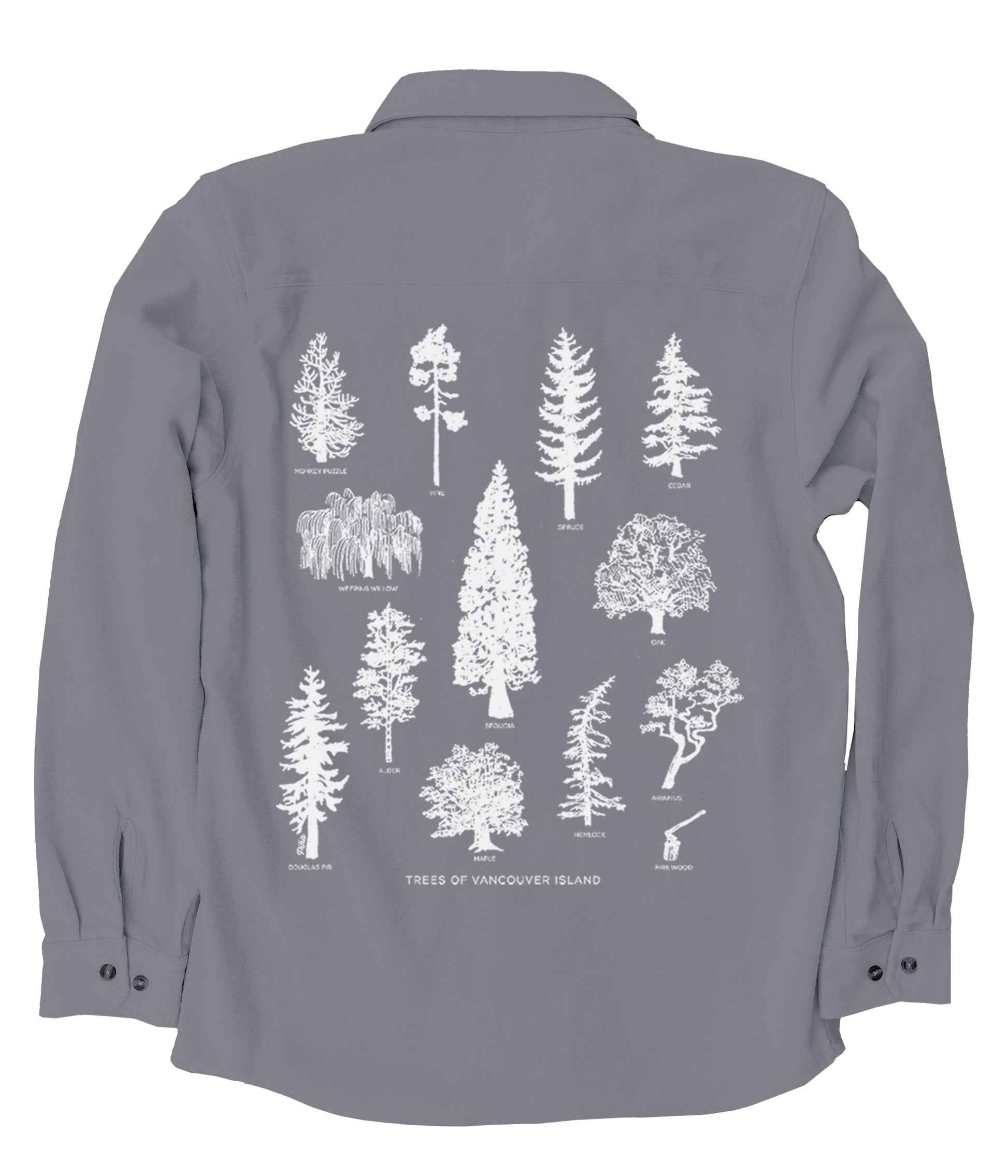This soft and comfortable unisex flannel is printed with our Tree Species design in white ink and features the most popular Vancouver Island trees.