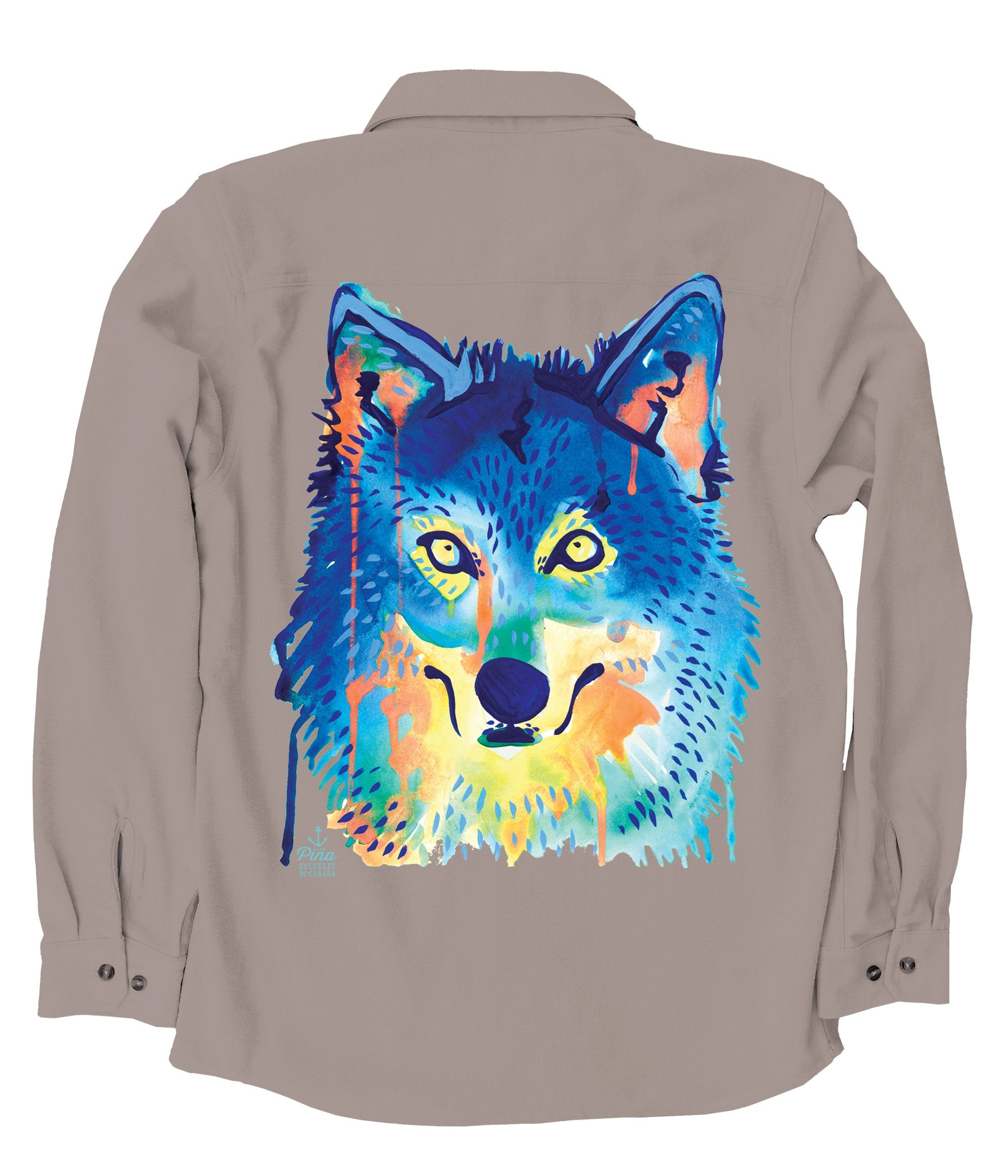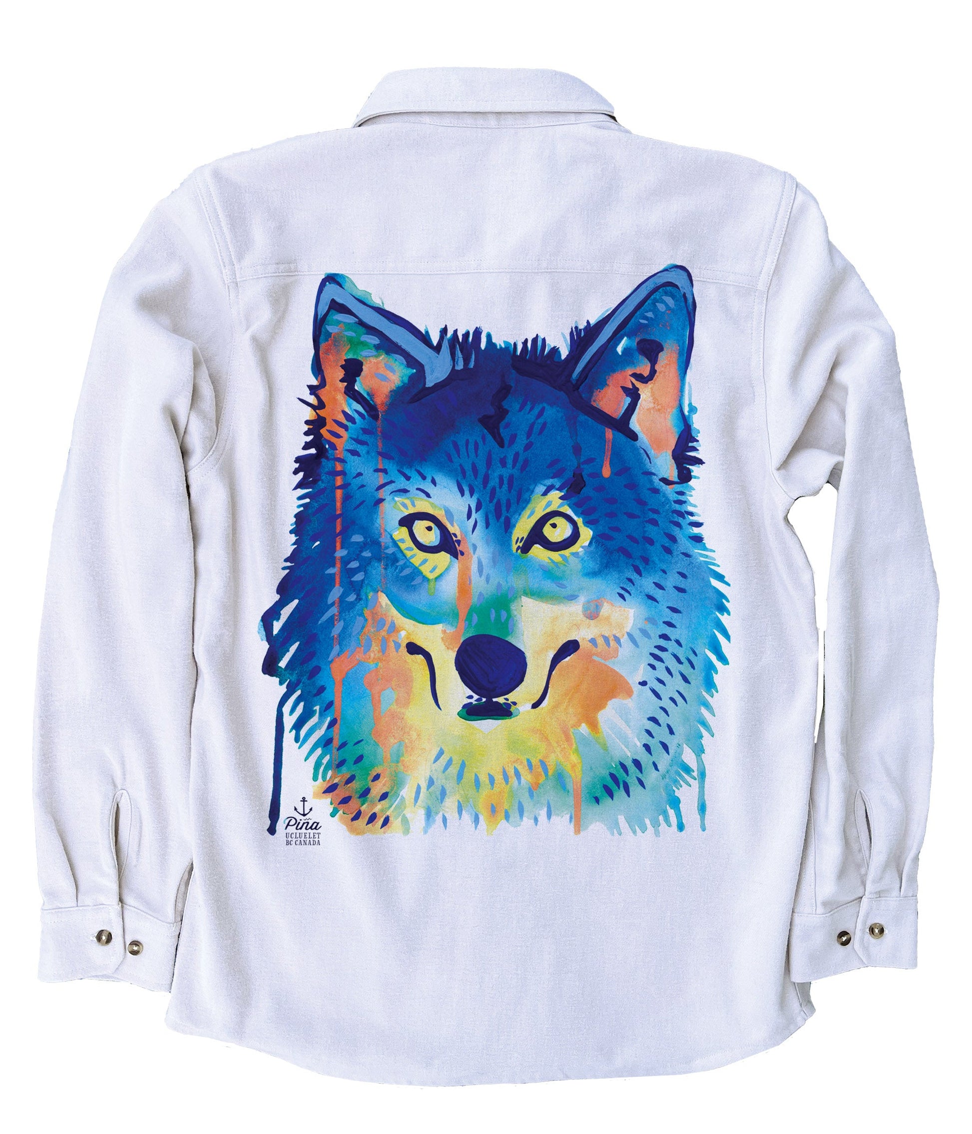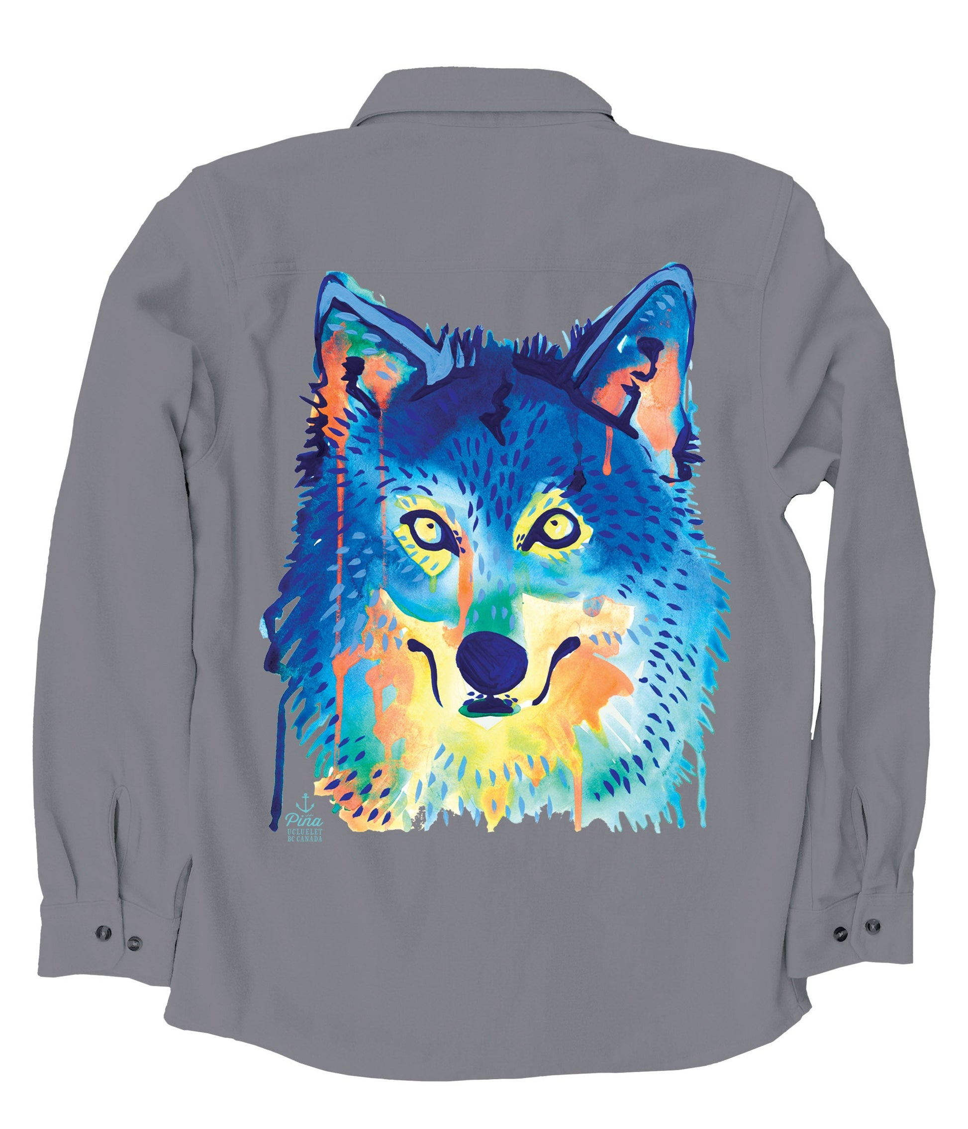 This soft and comfortable unisex flannel is printed with our colourful watercolour wolf face design–bright and fun and dripping with paint!
