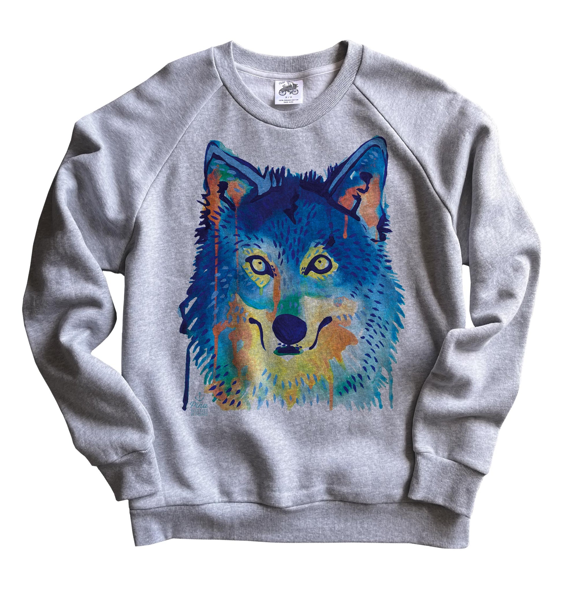 Our Watercolour Wolf Face printed in full, vibrant colour on the front of a unisex crewneck sweatshirt.