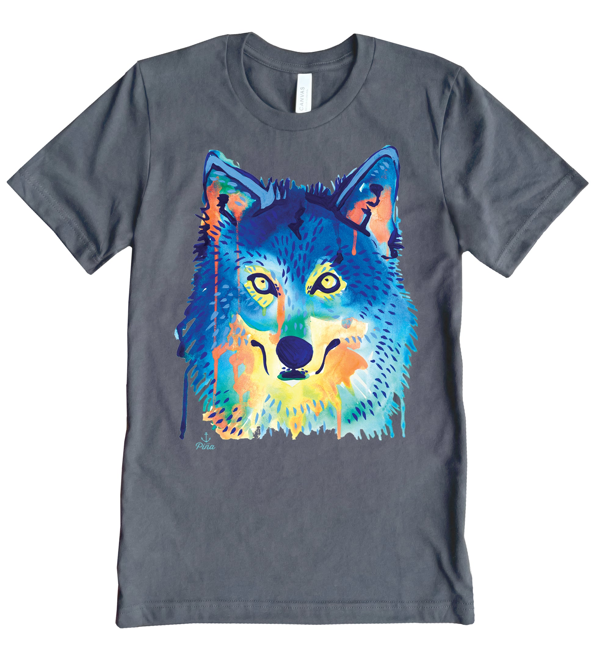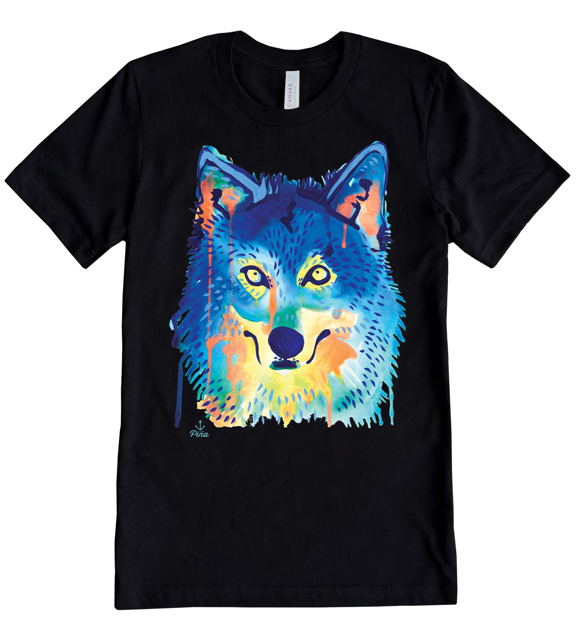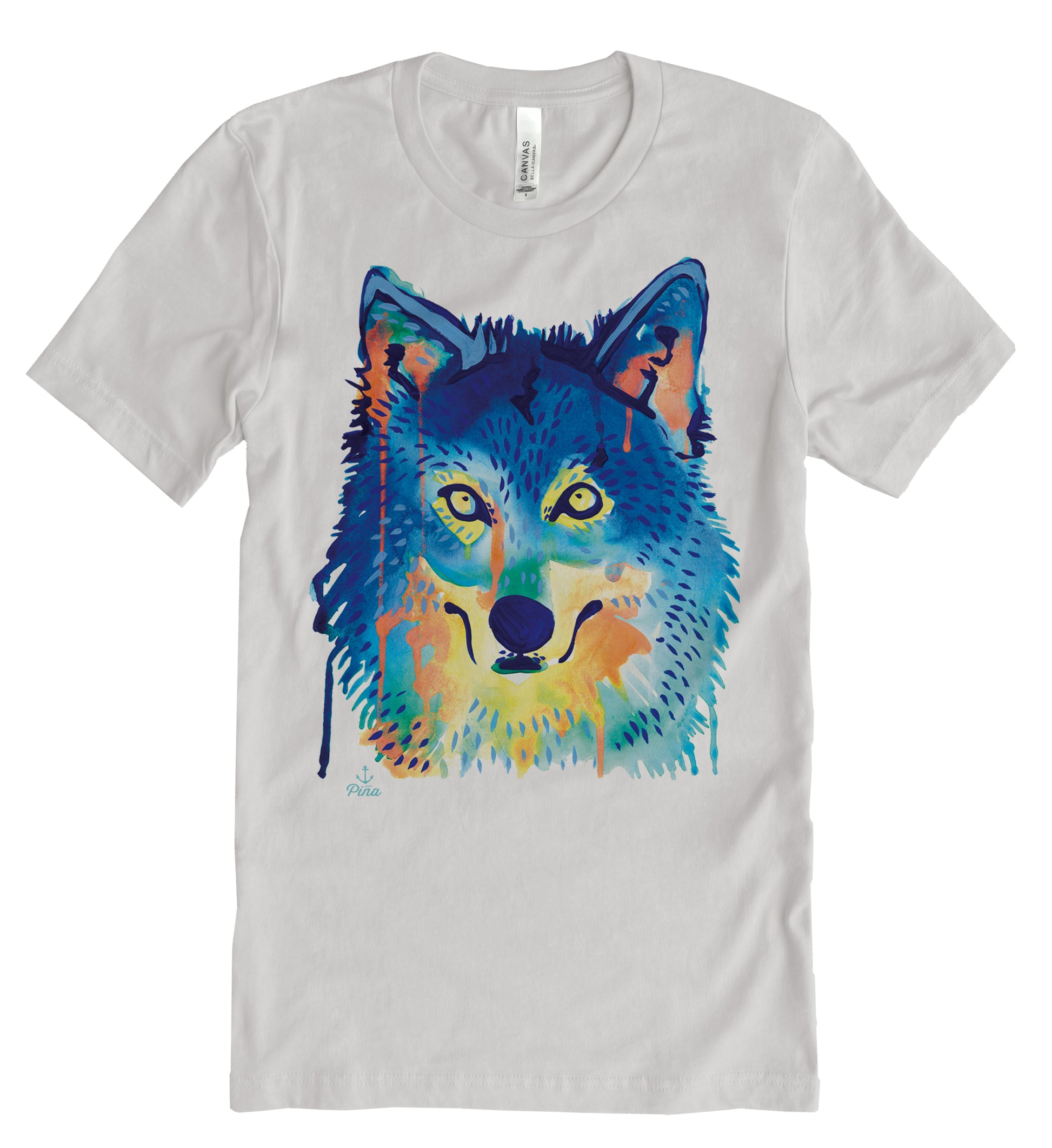 Our vibrant Watercolour Wolf Face design printed in full colour on the front of a unisex, cotton jersey t-shirt.