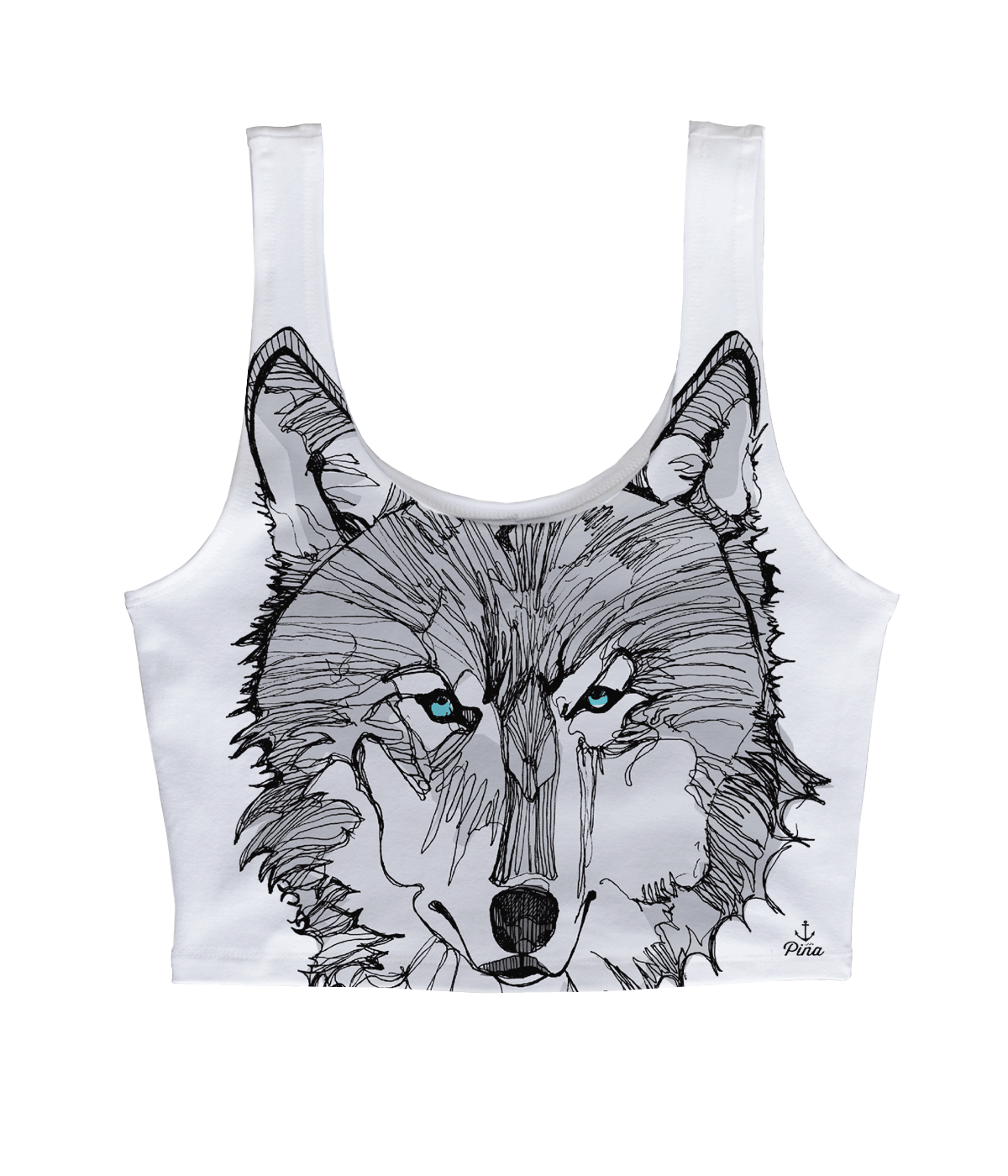 A cool grey wolf face with blue eyes printed on a long-line crop top! A summer wardrobe necessity!