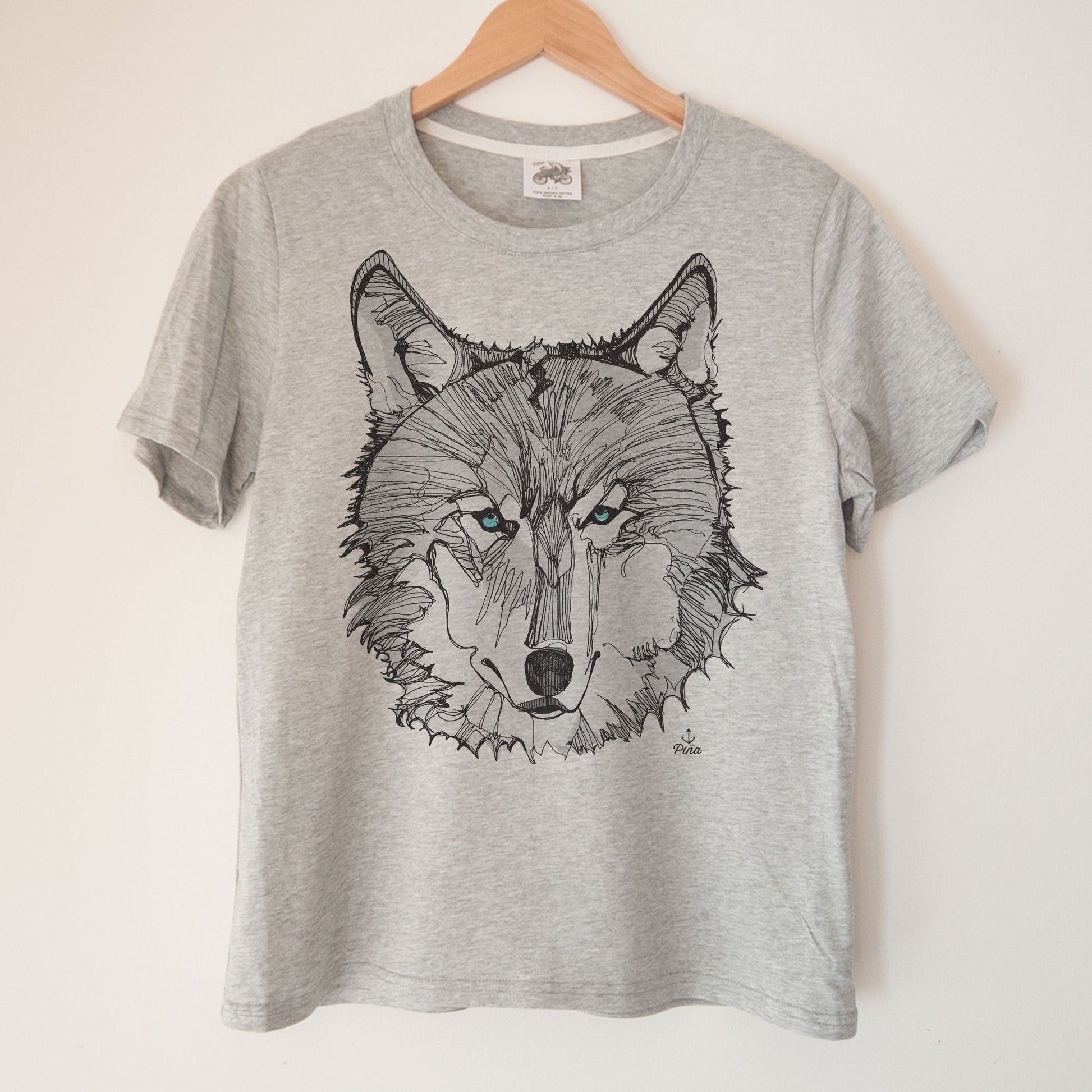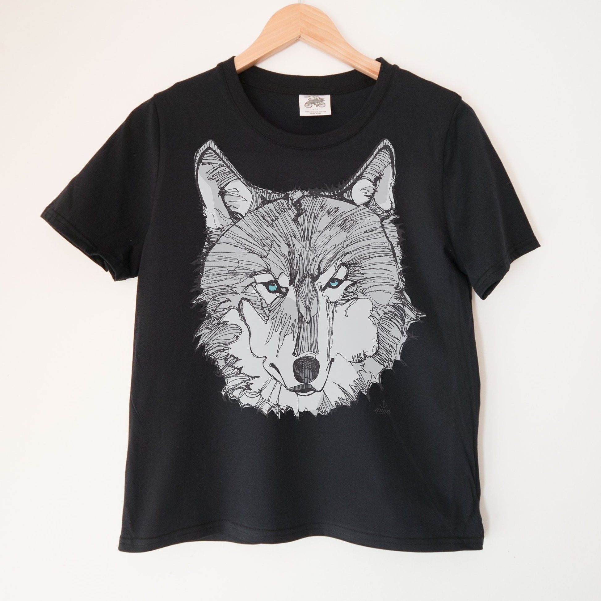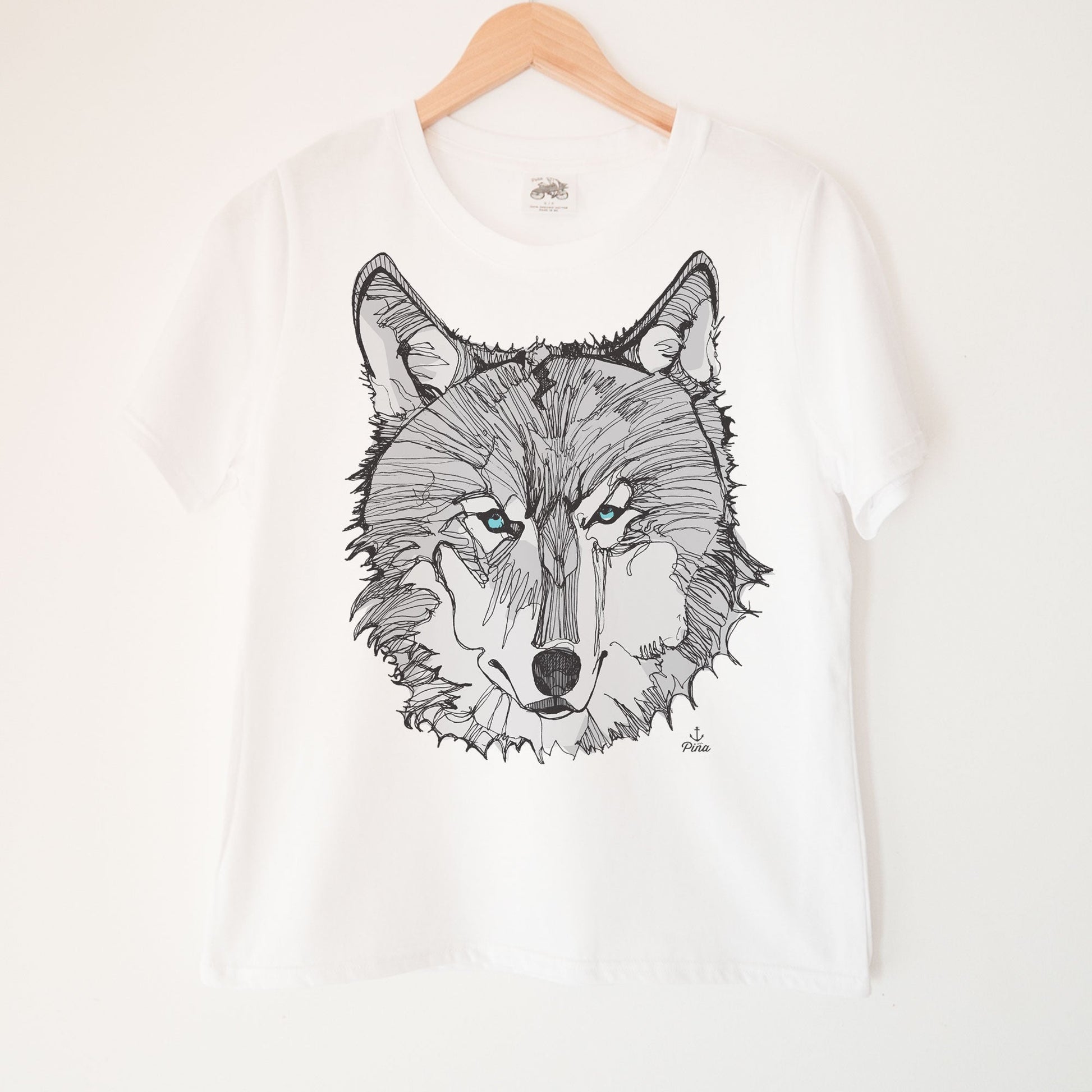 This soft and comfortable organic cotton ladies boxy tee is printed with our detailed Wolf Face design. This lone wolf is drawn in ink and coloured with beautiful greys and bright blue eyes. A great friend of the Pacific Northwest.